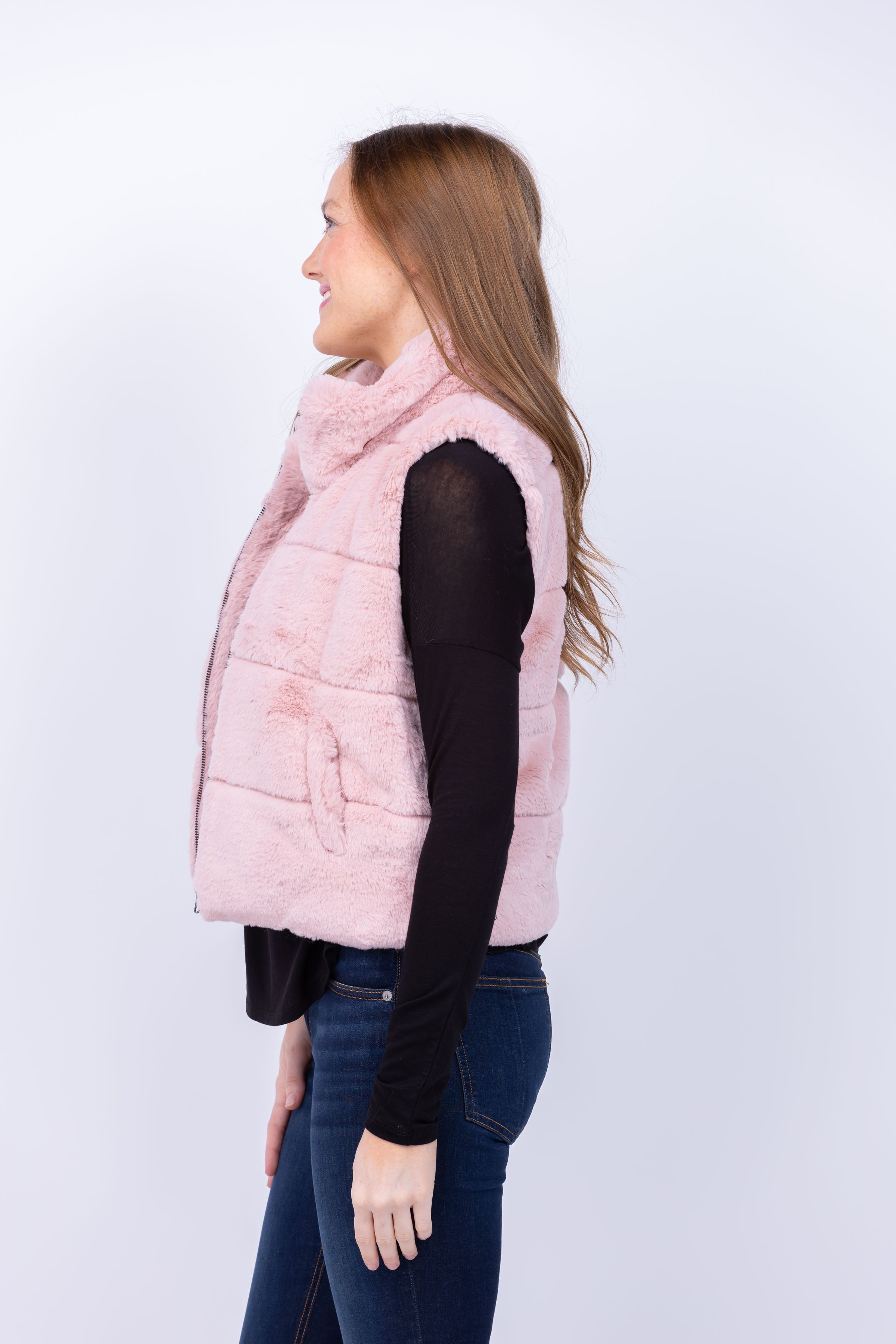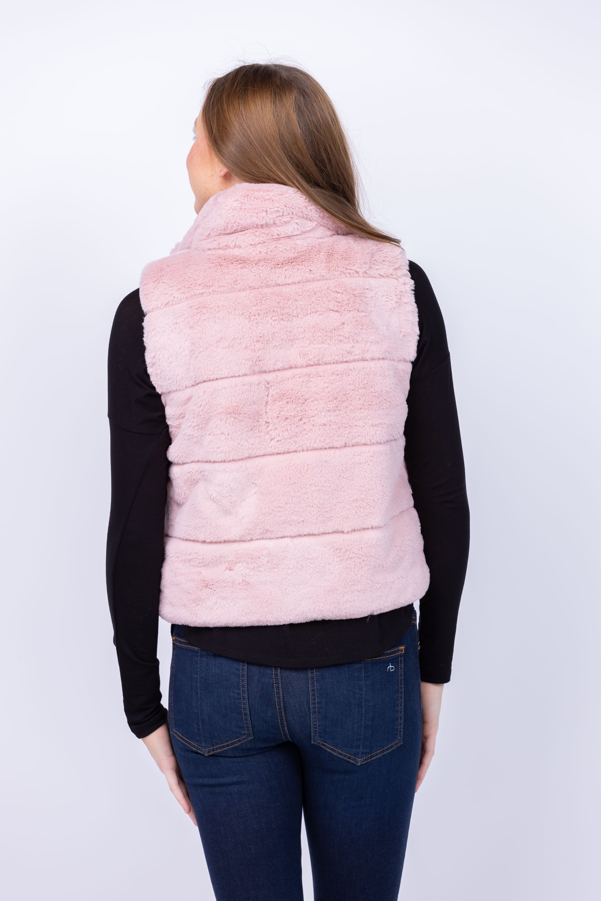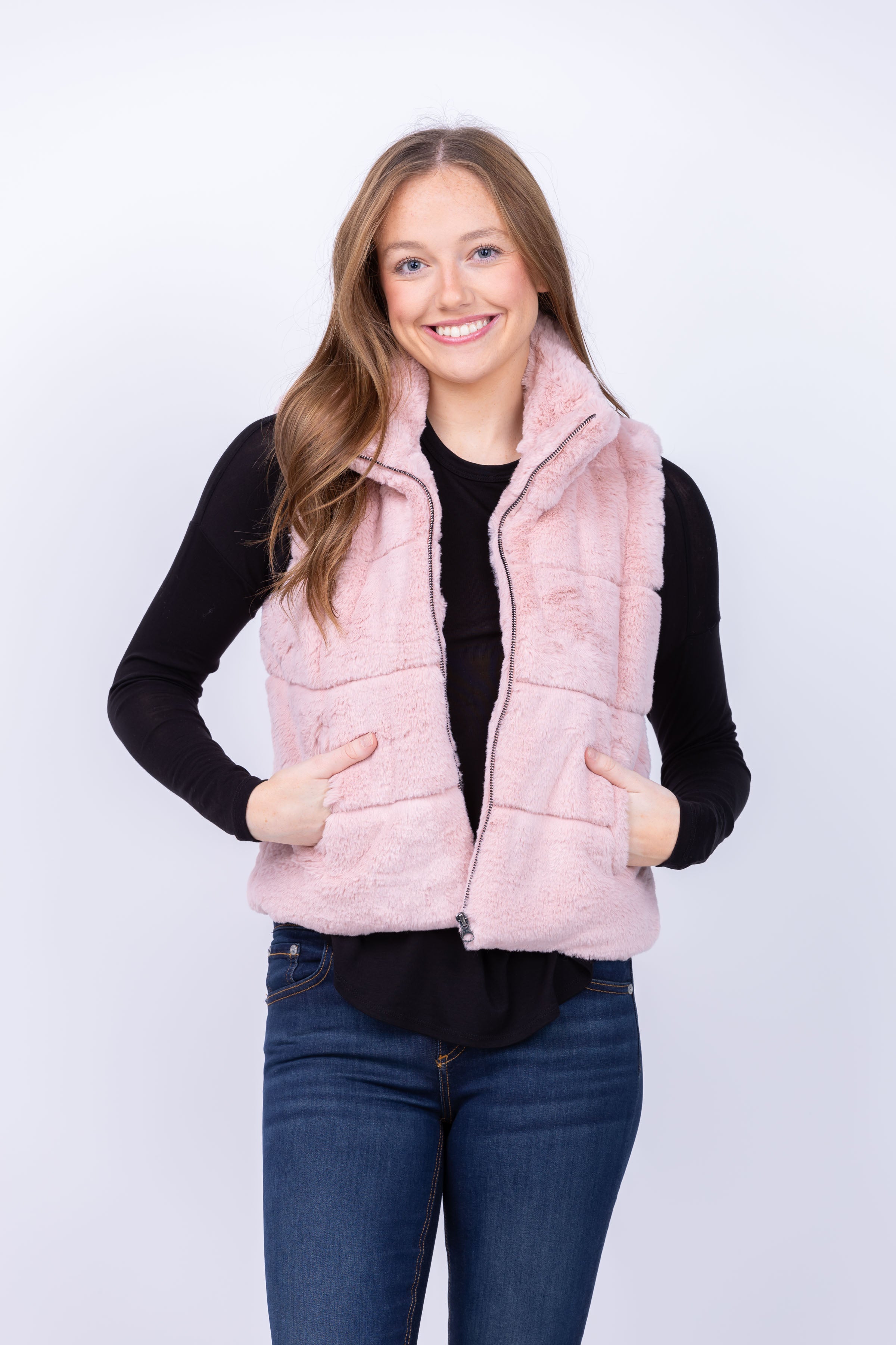 Wrap yourself in luxury with the J. Society Fur Vest in Pink. Made from soft faux fur, this vest features a big collar, front pockets, and a trendy ribbed design. The exposed silver zipper adds a touch of edge. Crafted from durable polyester, this vest is both stylish and practical. Perfect for adding a touch of glamour to your wardrobe, while also keeping you warm and comfortable. Don't miss out on this must-have piece!
