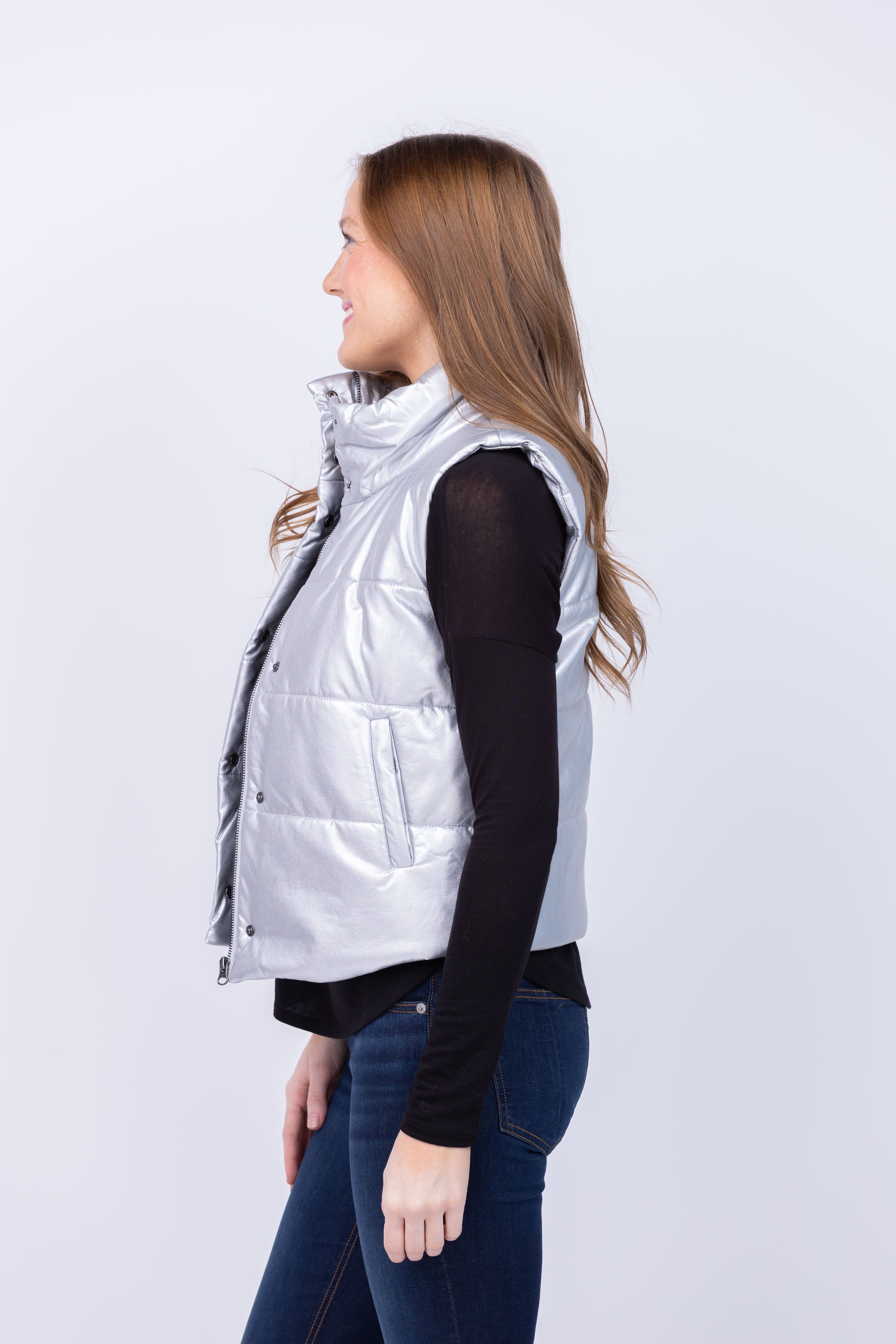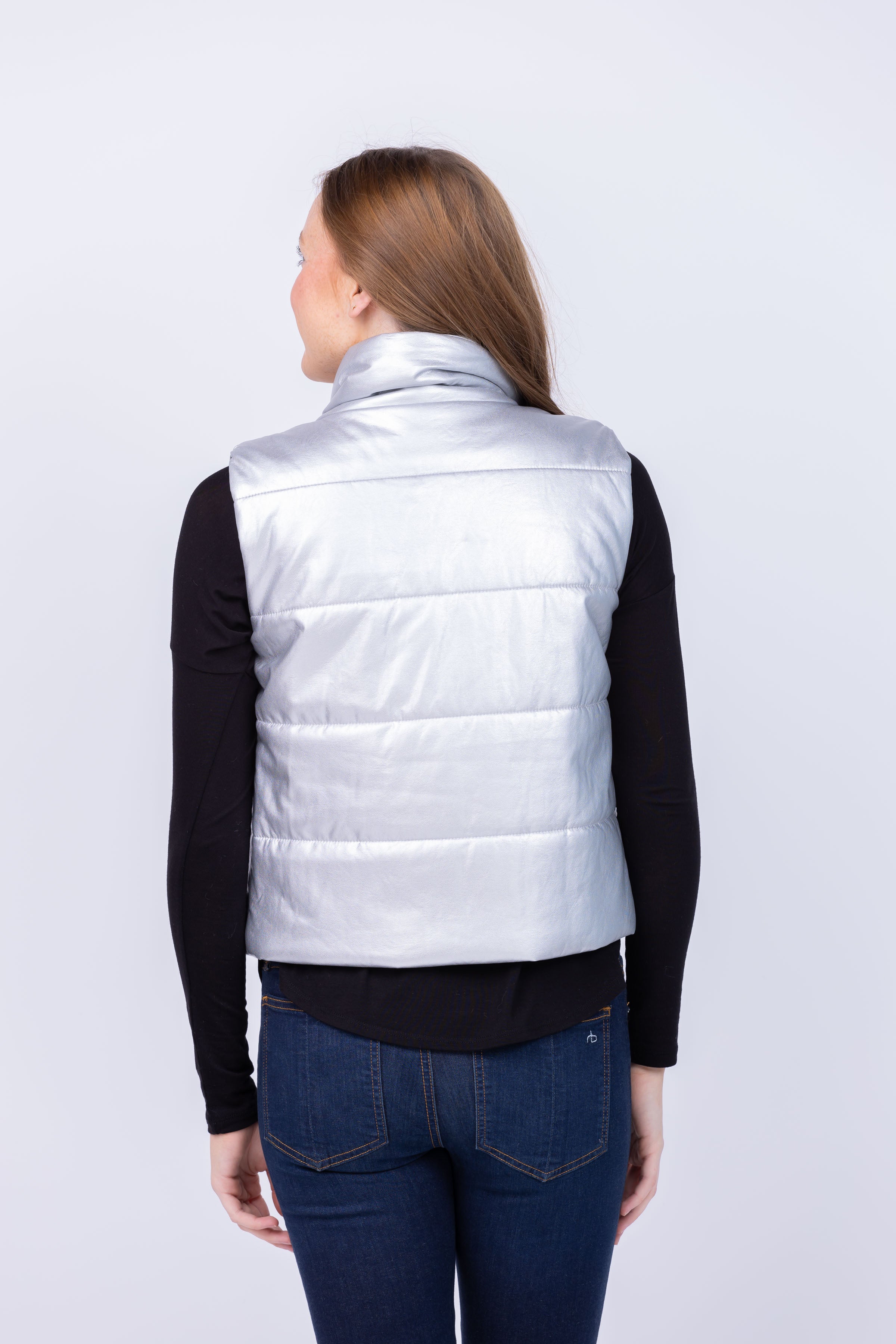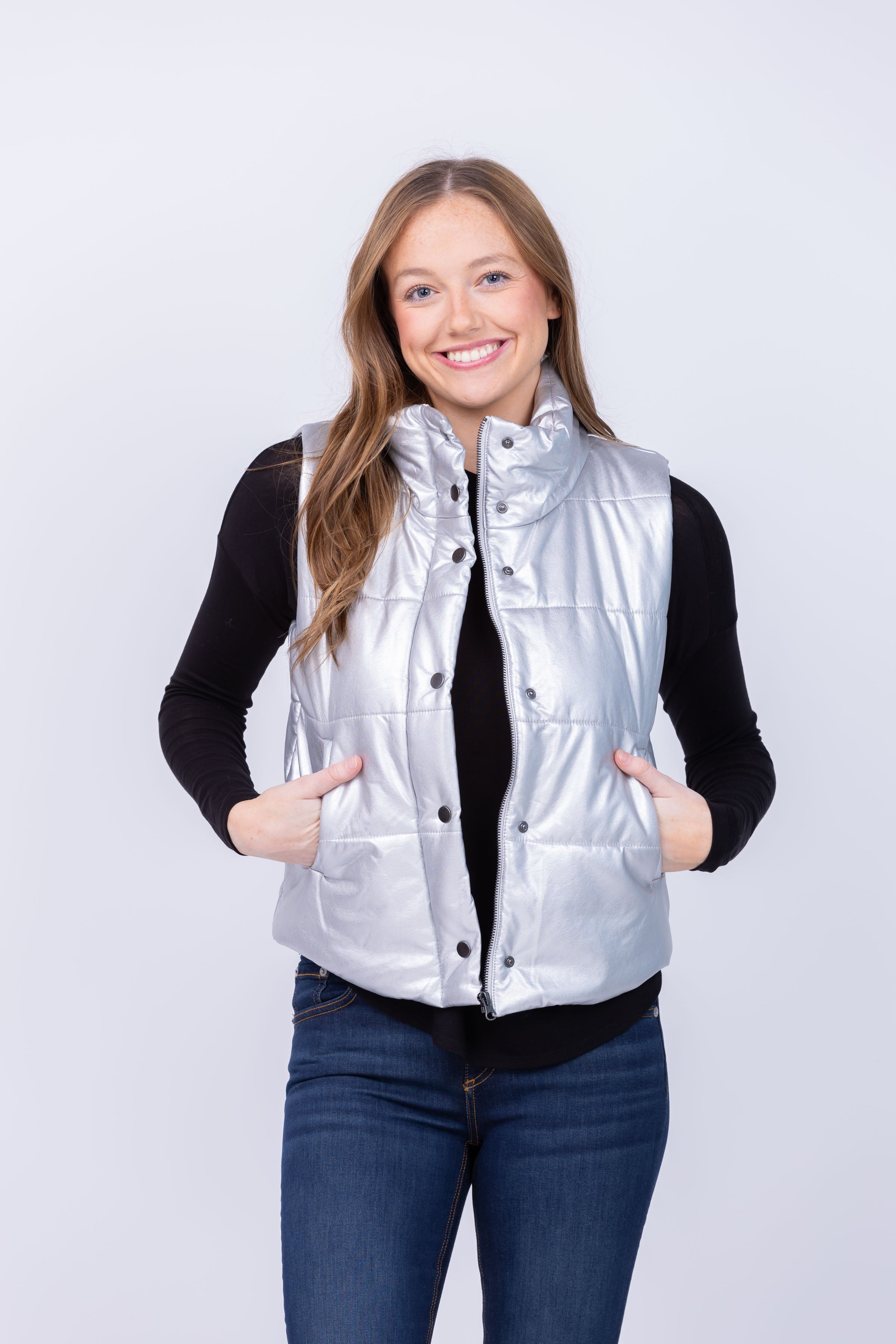 This J. Society Vest in Silver is the perfect addition to any wardrobe. Made with vegan leather and featuring a stylish quilted design, it offers both fashion and functionality. The zip-up and snap closures provide convenience and the 100% polyester material ensures comfort. Upgrade your style with this must-have vest!