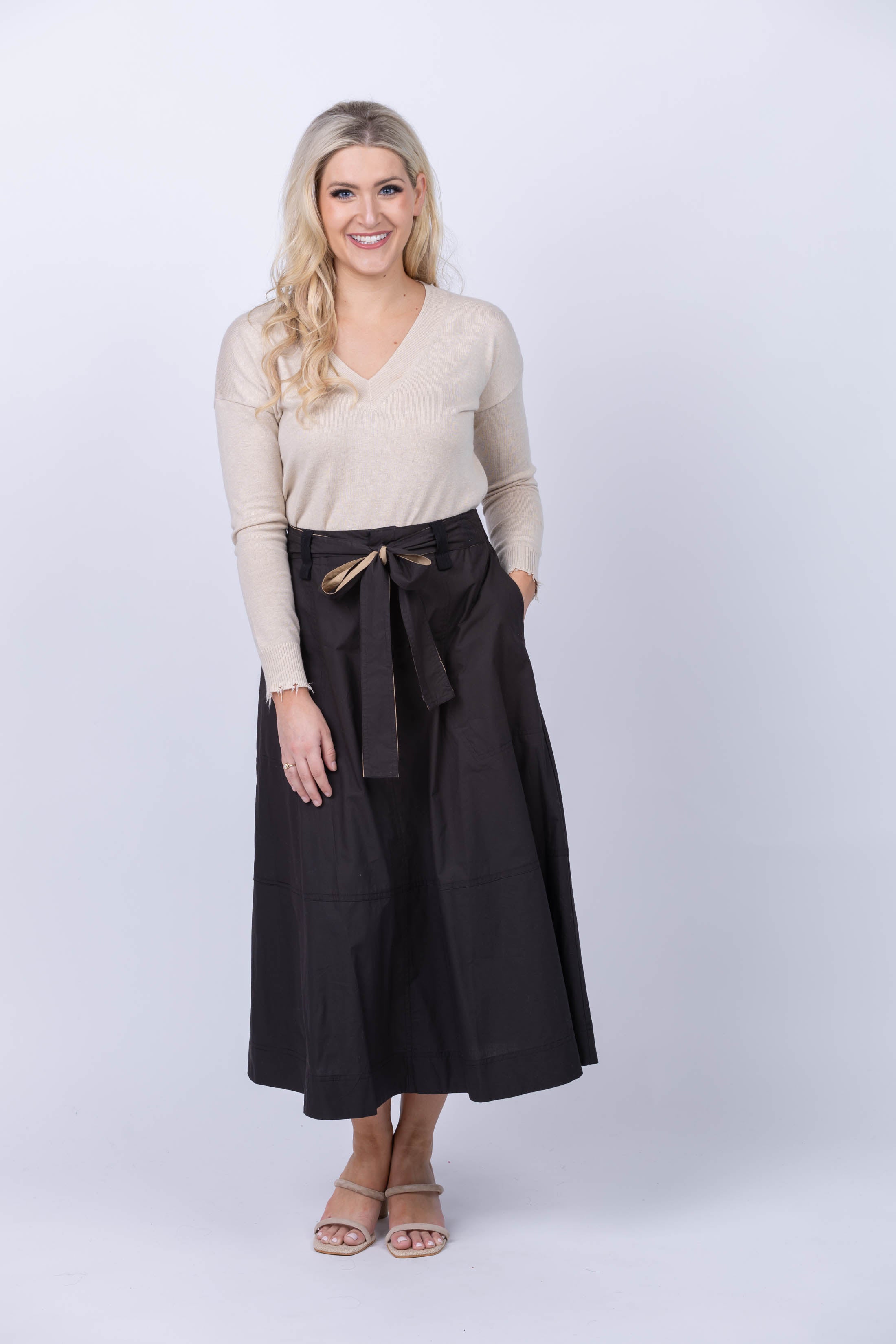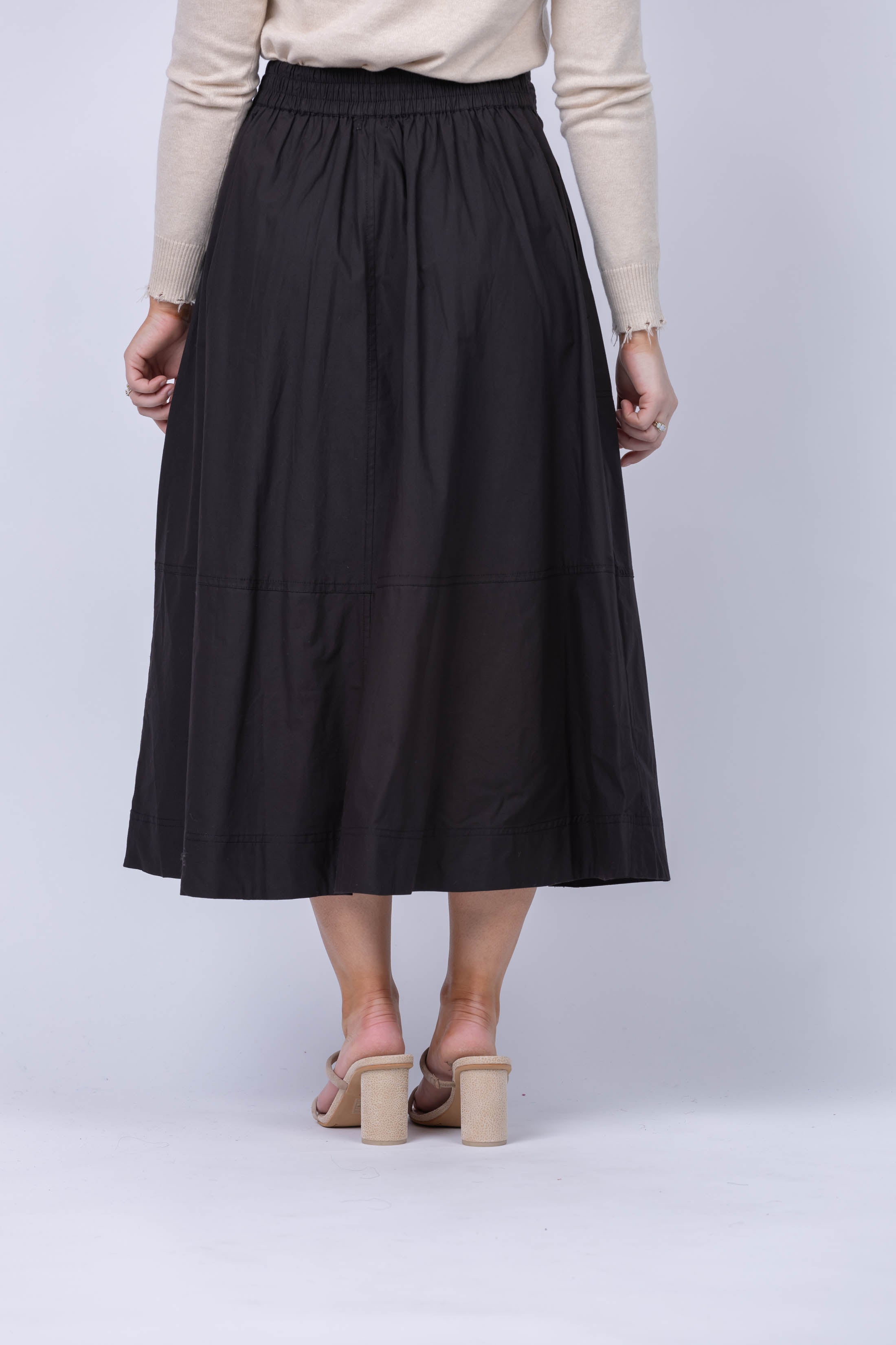 In our midweight cotton poplin, this midi skirt has a self belt that is attached at the sides, an elastic waist in the back for ease, and a flat front zipper. Whether you opt for one of the prints or the solid black, this is an incredibly flattering skirt - and one of our favorites! Pair this with our Rib Trim Puff Sleeve Sweater or a simple tee for the perfect outfit.