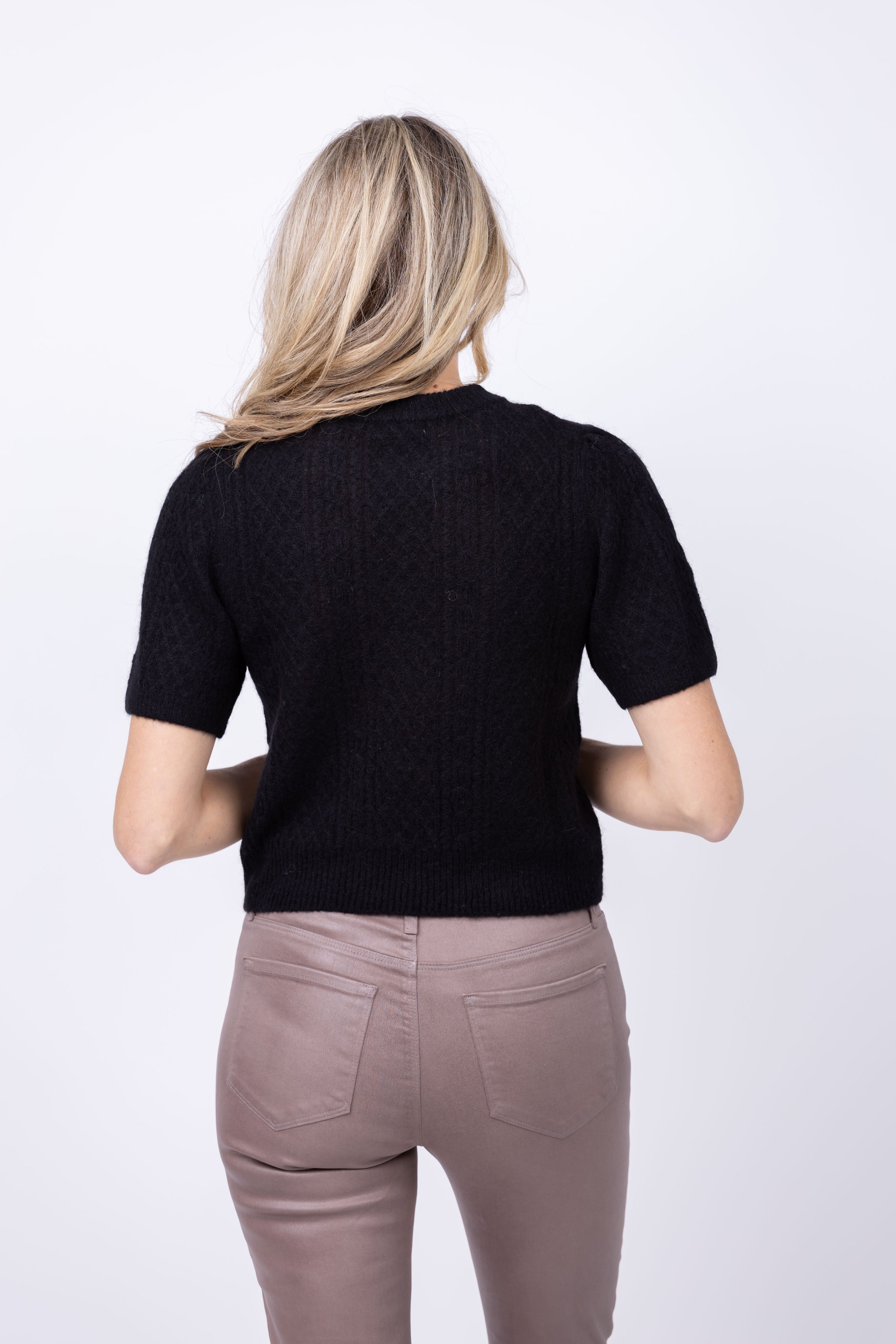 Stay warm and stylish with the Lilla P Cropped Cable Sweater! Made from a soft alpaca blend yarn, this short sleeve sweater has a short body length that skims the body without being too fitted. The small cable stitch adds a touch of detail to this versatile piece, perfect for pairing with skirts or higher-waisted bottoms.