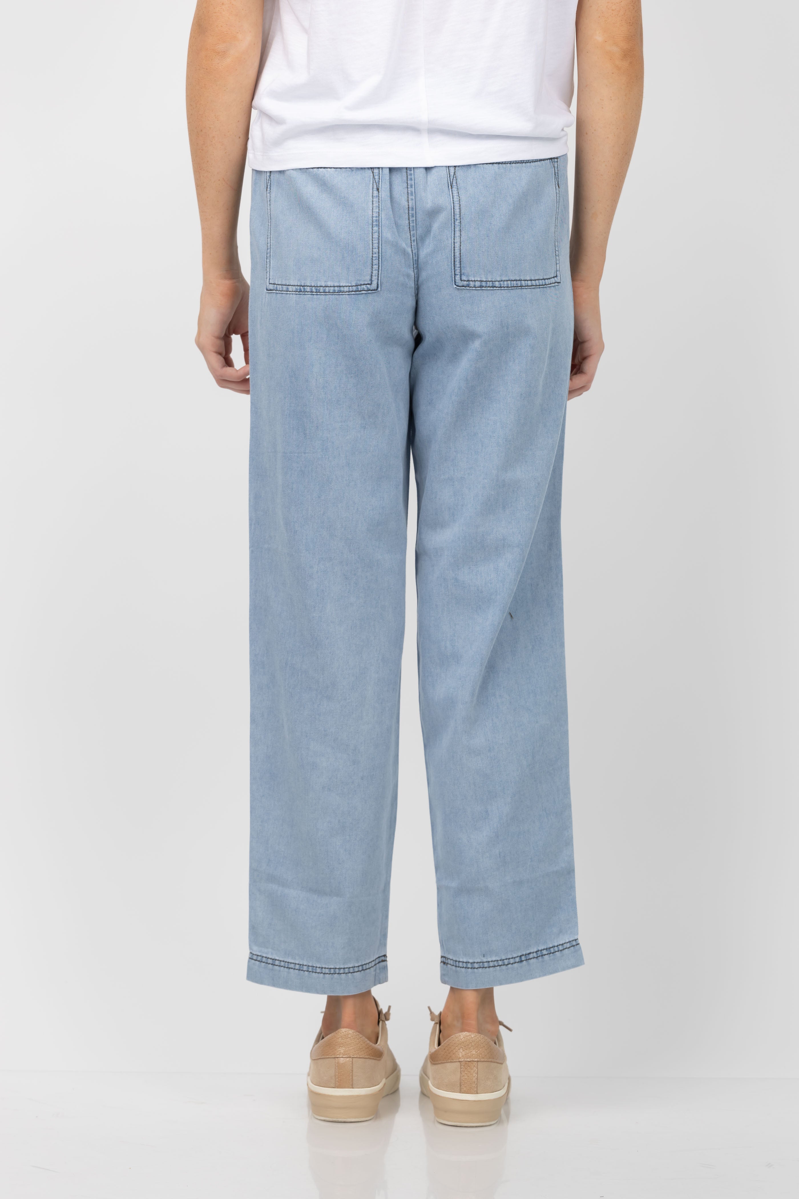 Embrace comfort and style with the Lilla P Denim Belt Pant in Light Wash. Made from lightweight denim fabric, these pants offer the perfect balance of fashion and ease. Complete with a self belt, these pants can be effortlessly paired with a cotton sweater or the coordinating denim top for a chic look.
