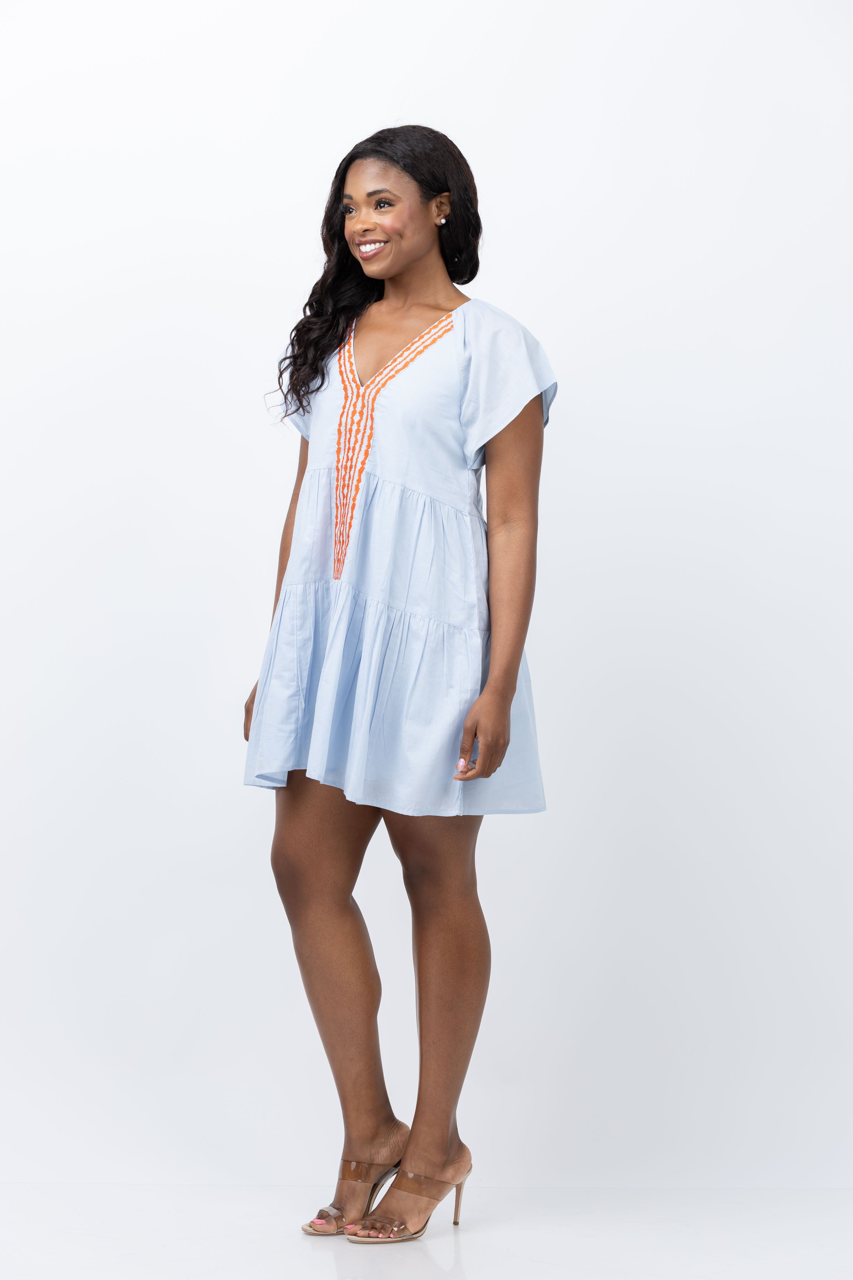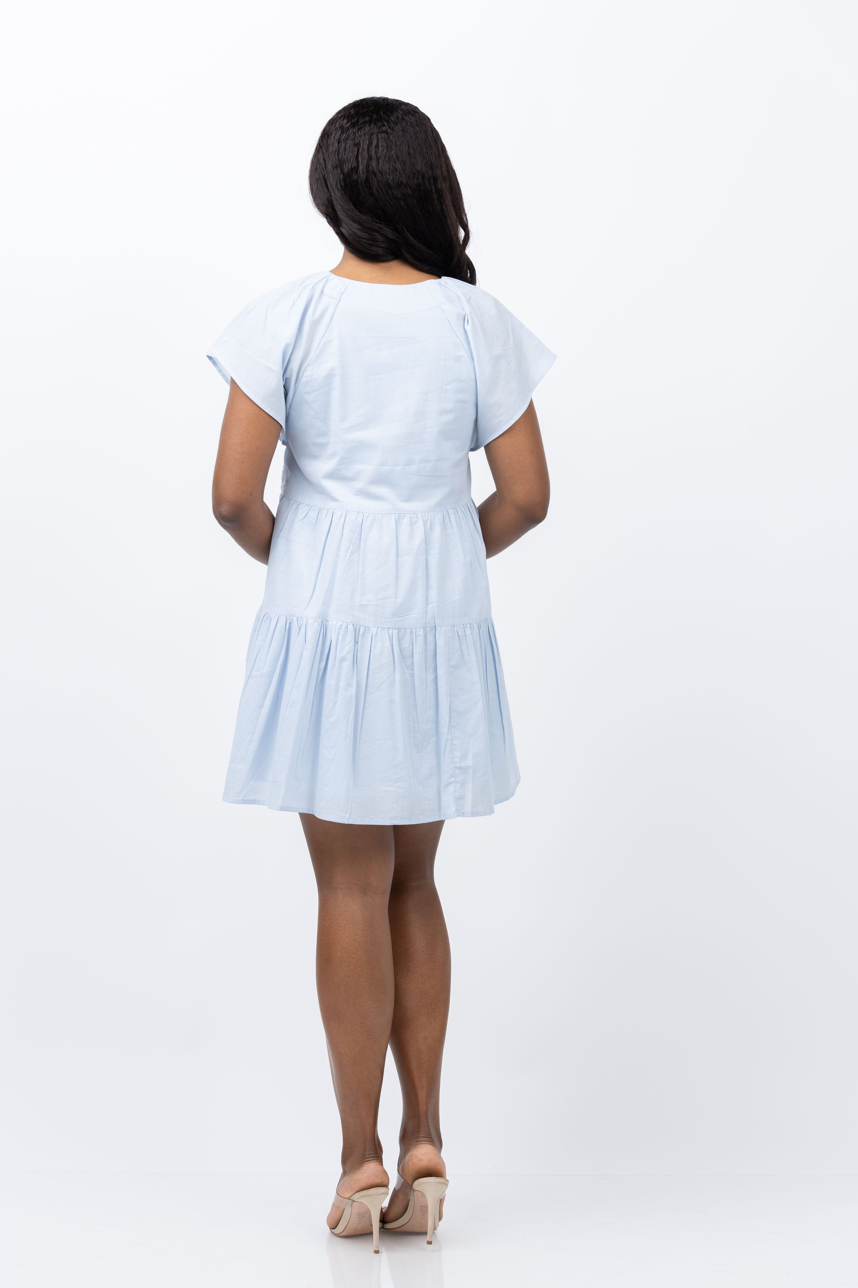 Elevate your summer style with the Lilla P Flutter Sleeve Dress in Crystal. Made of lightweight cotton voile, this dress features tiered flutter sleeves and intricate embroidery along the front placket. Stay comfortable and chic all season with the added bonus of a cotton lining.