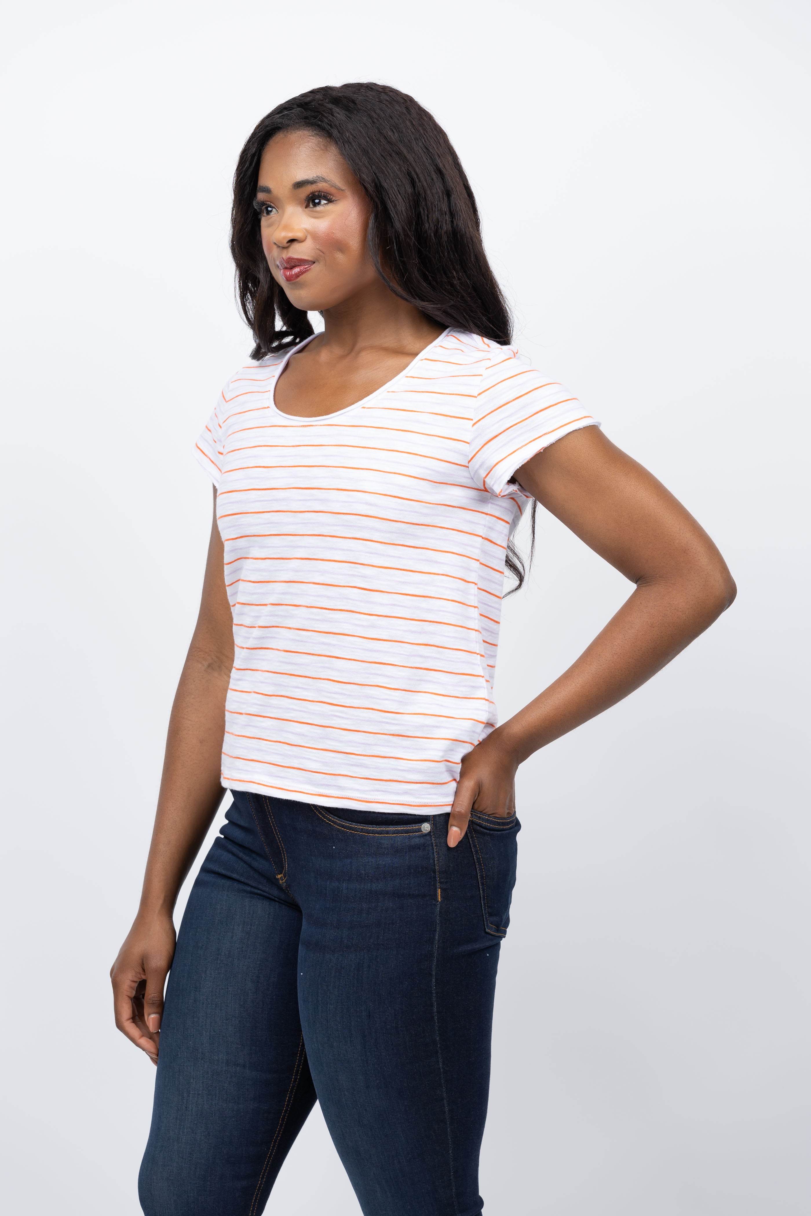 Elevate your summer wardrobe with the Lilla P Scoop Neck T-Shirt in Tangelo Lily. Featuring cap sleeves and rolled edge trim, this multi-color stripe tee offers effortless style. Mix and match with our gauze or canvas bottoms for endless outfit options. Upgrade your summer style effortlessly!