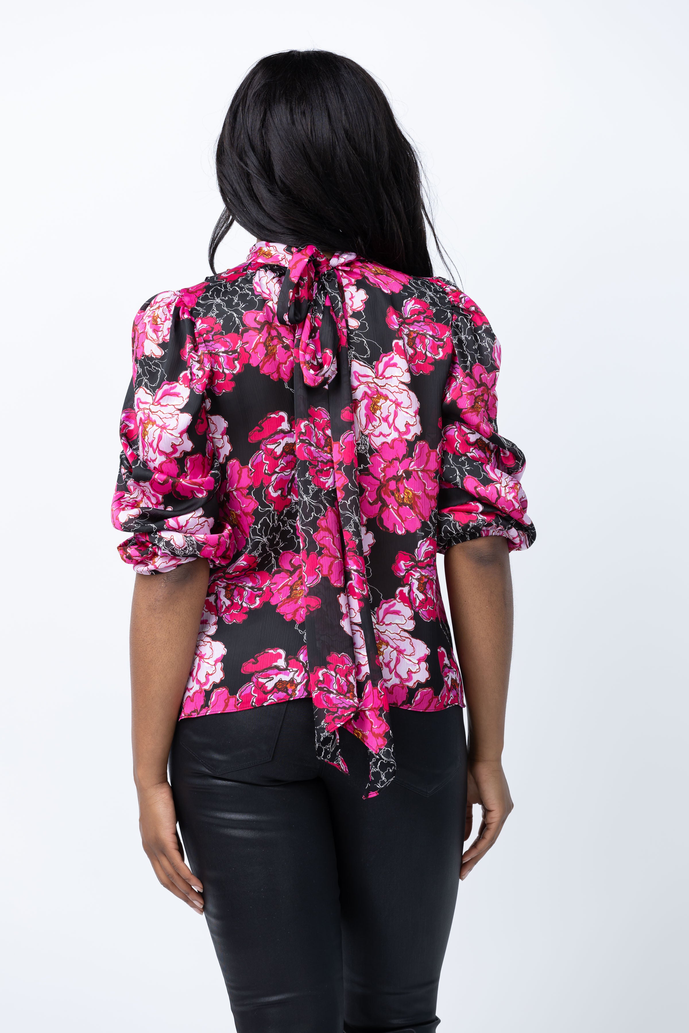 The Misa Los Angeles Luella Top in Pink Peony is made from a luxurious printed satin, with a high mock neck and tie closure for a sophisticated touch. The gathered shoulders and three-quarter ruched blouson sleeves create a flattering silhouette. Pair with our black Sierra skirt or dress down with jeans for a versatile and stylish look.