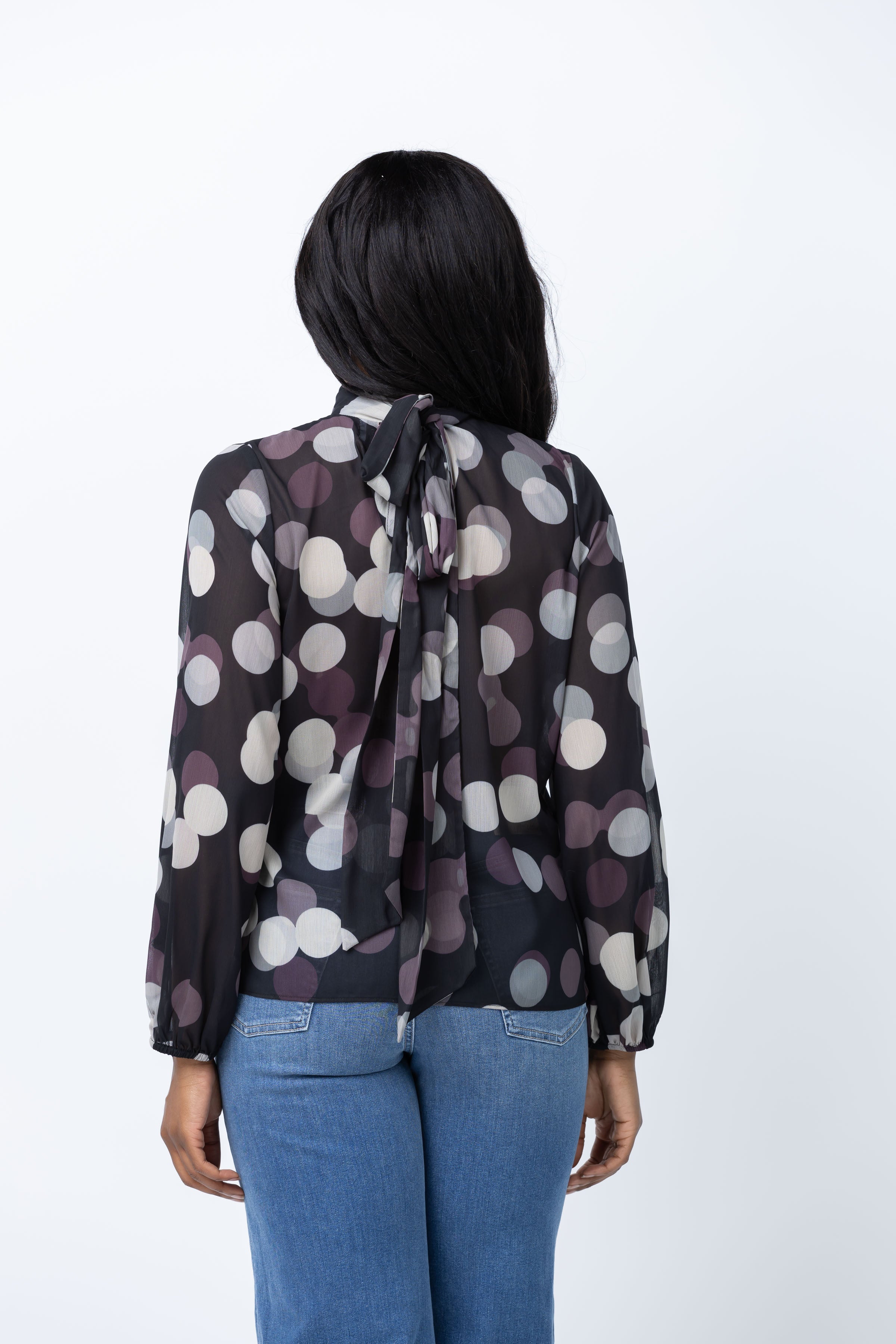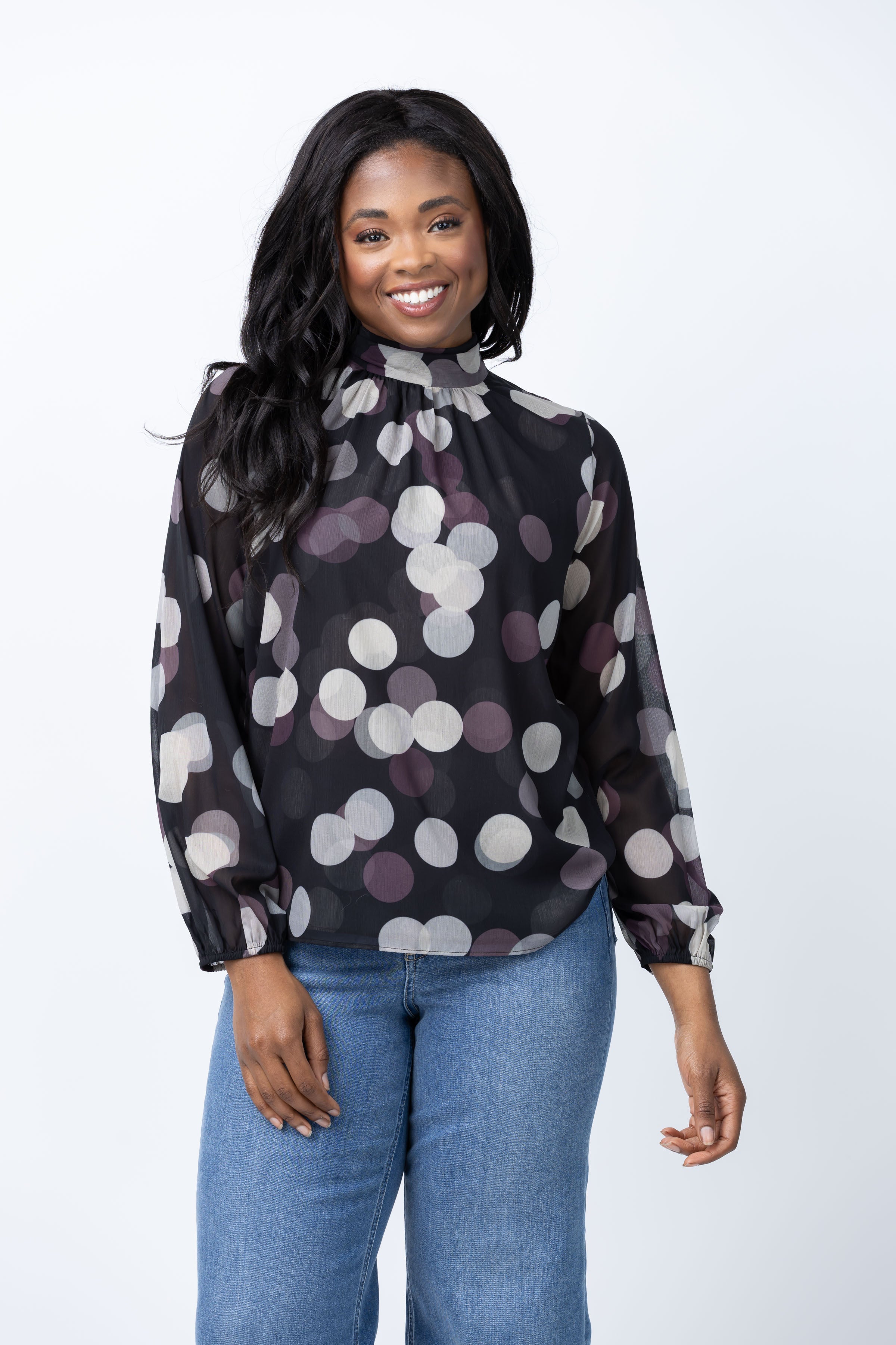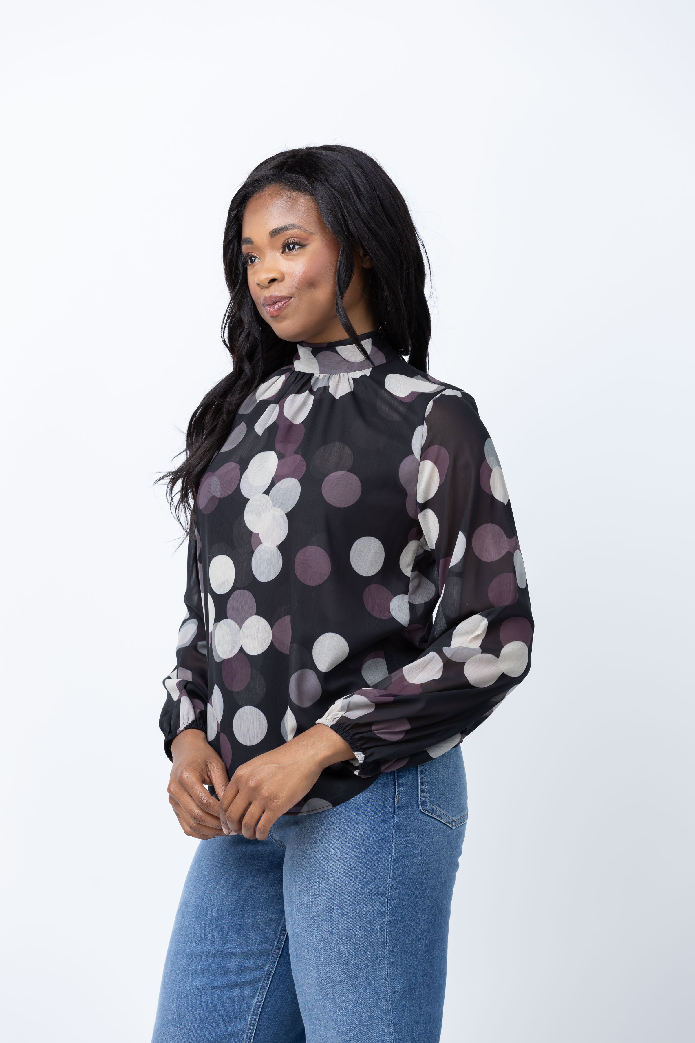 Elevate your wardrobe with the Misa Los Angeles Lulu Top In Polka Dot. This dreamy high neck silhouette is crafted from a chic polka dot print chiffon, and features a tie and hook closure for a touch of elegance. With long sleeves and a semi sheer design, this top is perfect for any occasion. Complete the look with denim or our coordinating Sky skirt for a perfect holiday set. Upgrade your style game now!