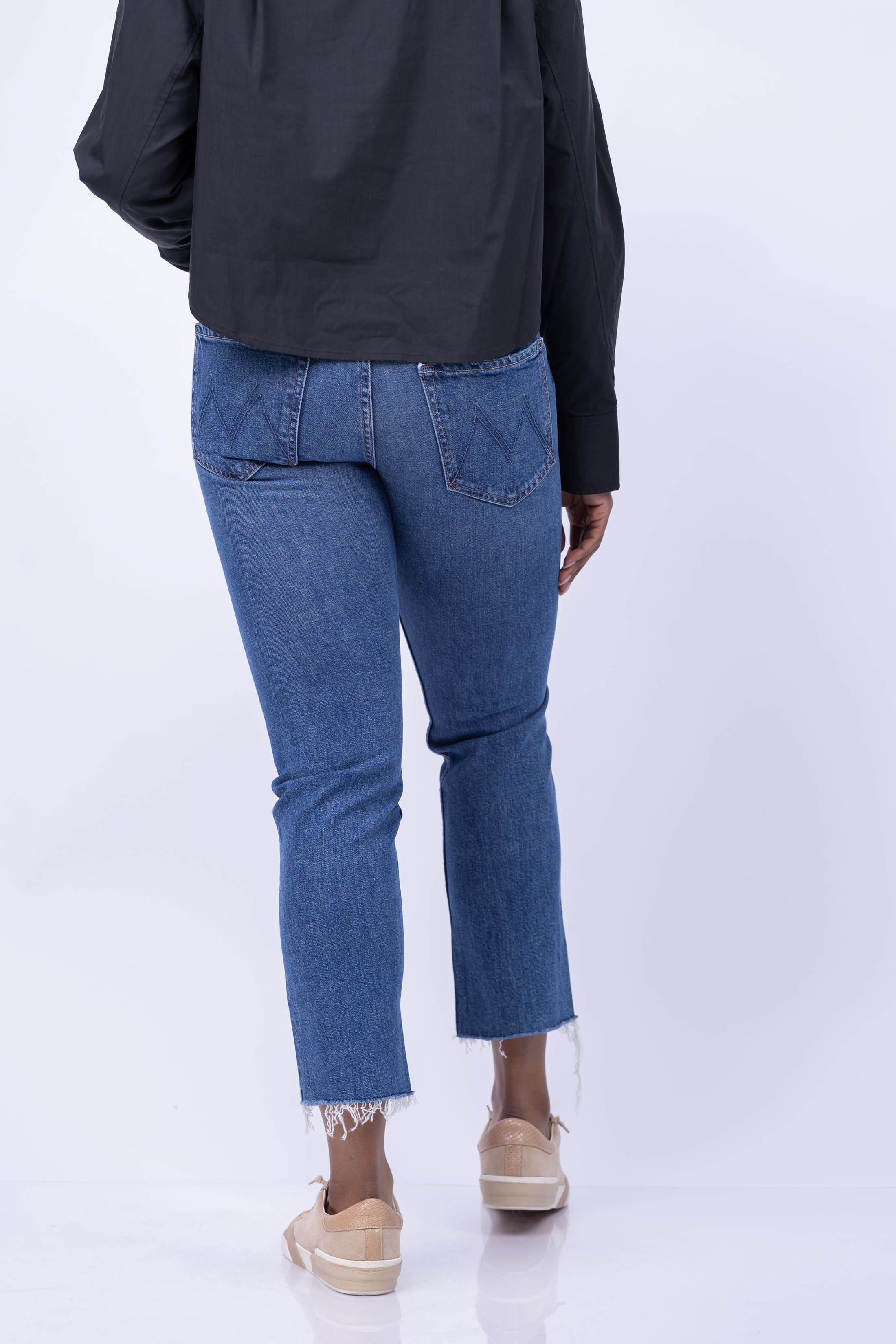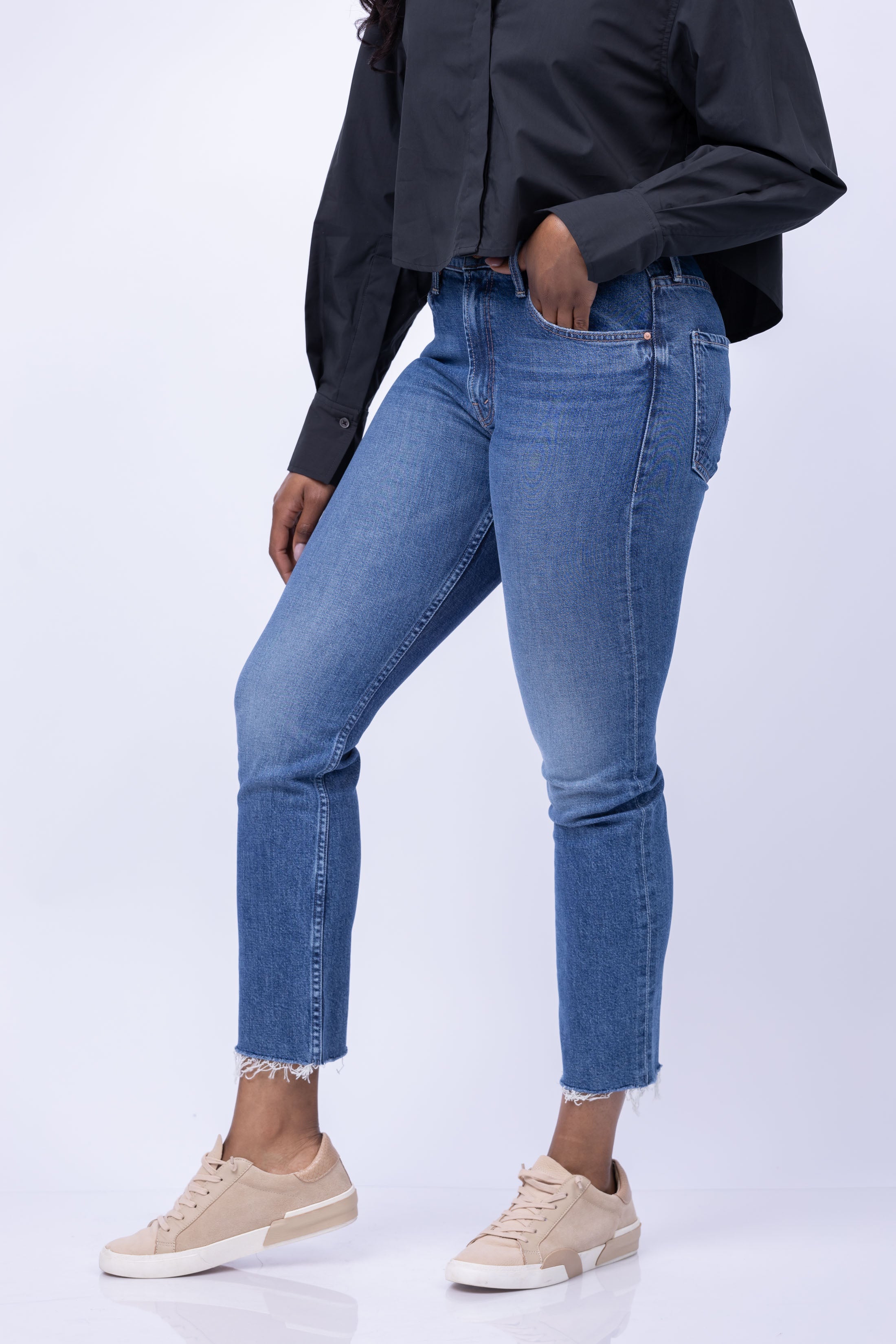 Elevate your denim game with MOTHER's Mid Rise Rider Ankle Jeans in Local Charm. The mid-rise and ankle-length inseam gives a flattering straight leg silhouette, while the frayed hem adds a touch of edginess. With its stretch denim, this mid-blue wash with whiskering and fading at the knees is both comfortable and stylish.