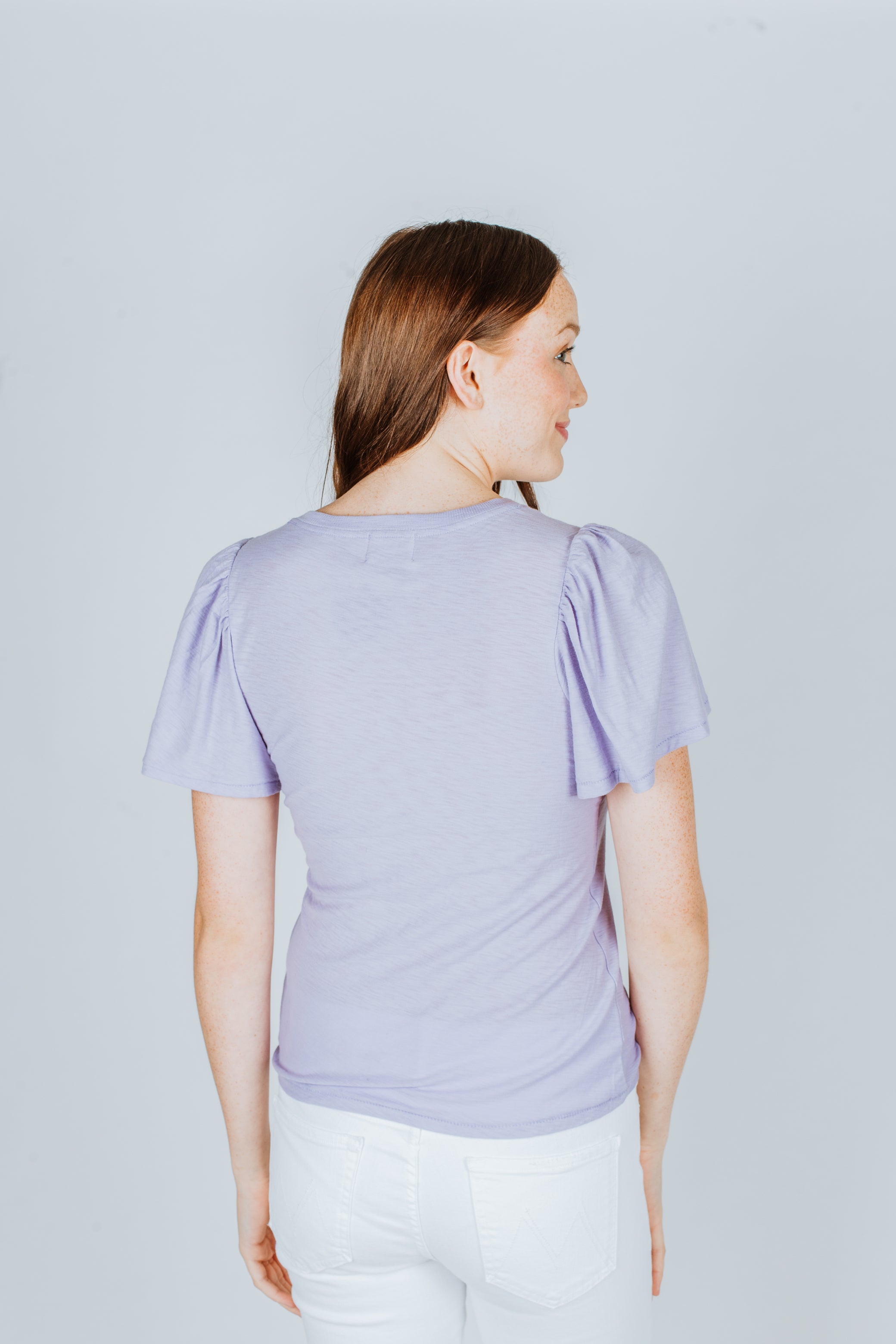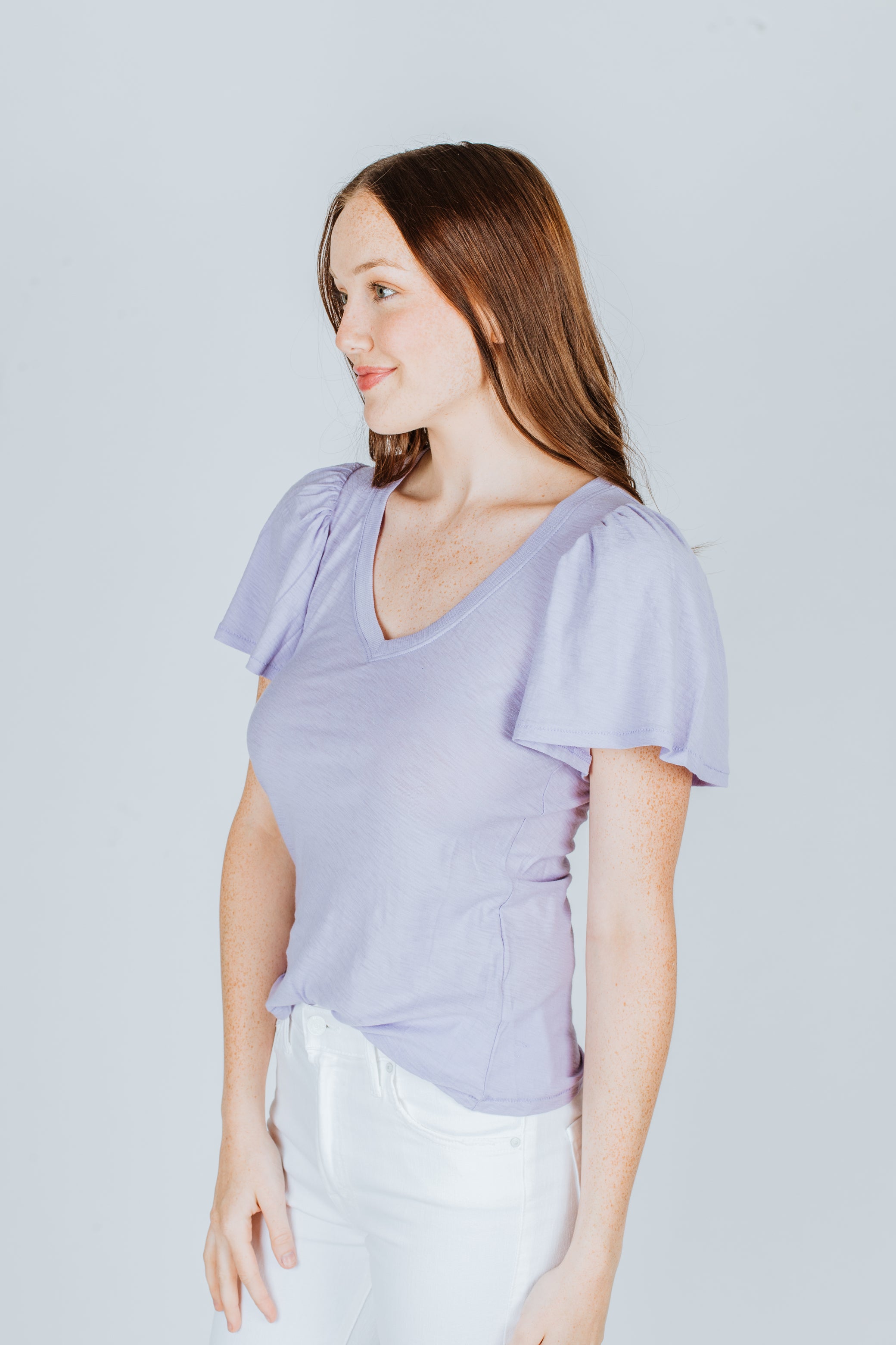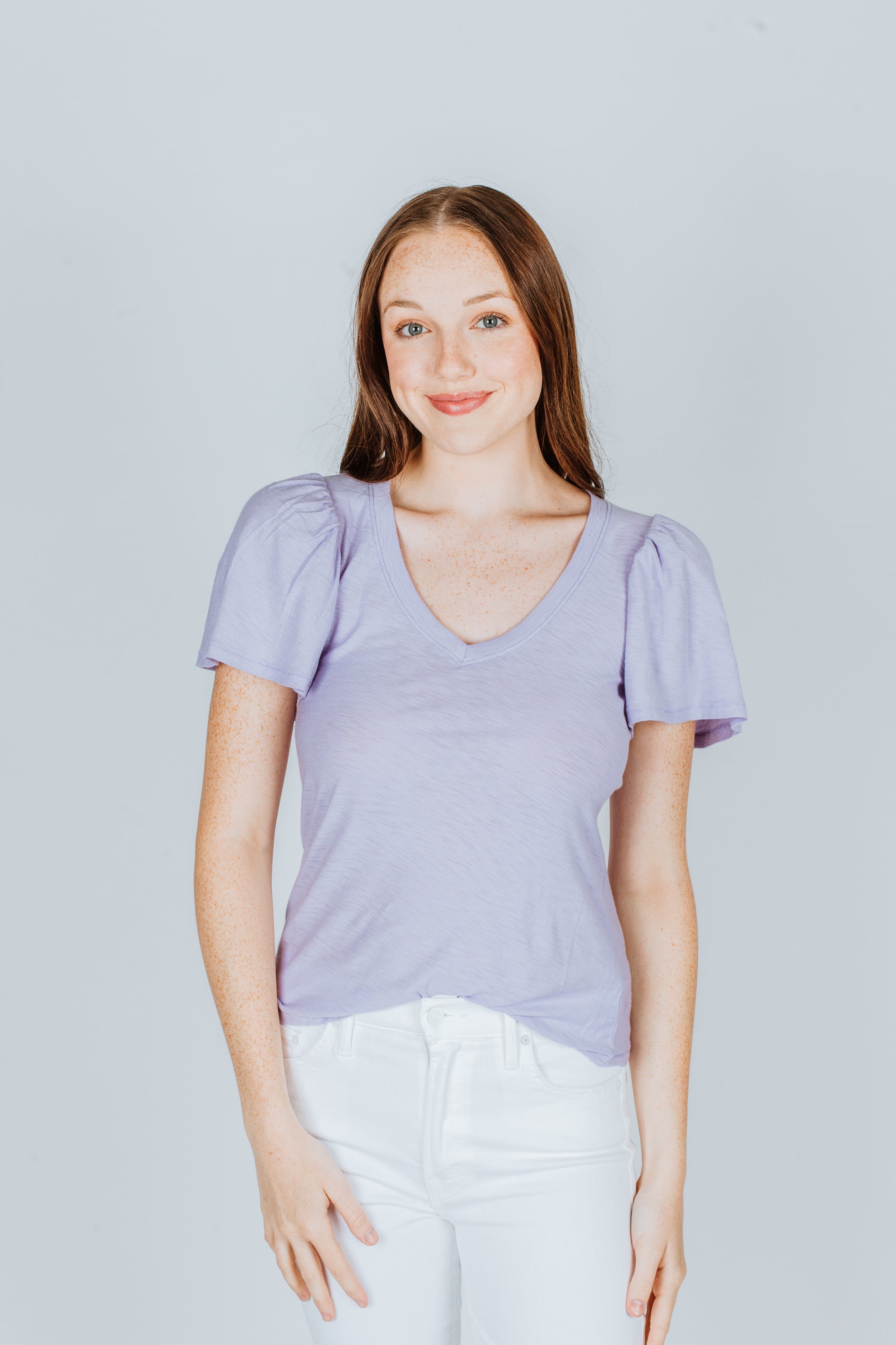 The puffed, flutter sleeves on this white, V neck tee make it the romantic version of an essential staple.