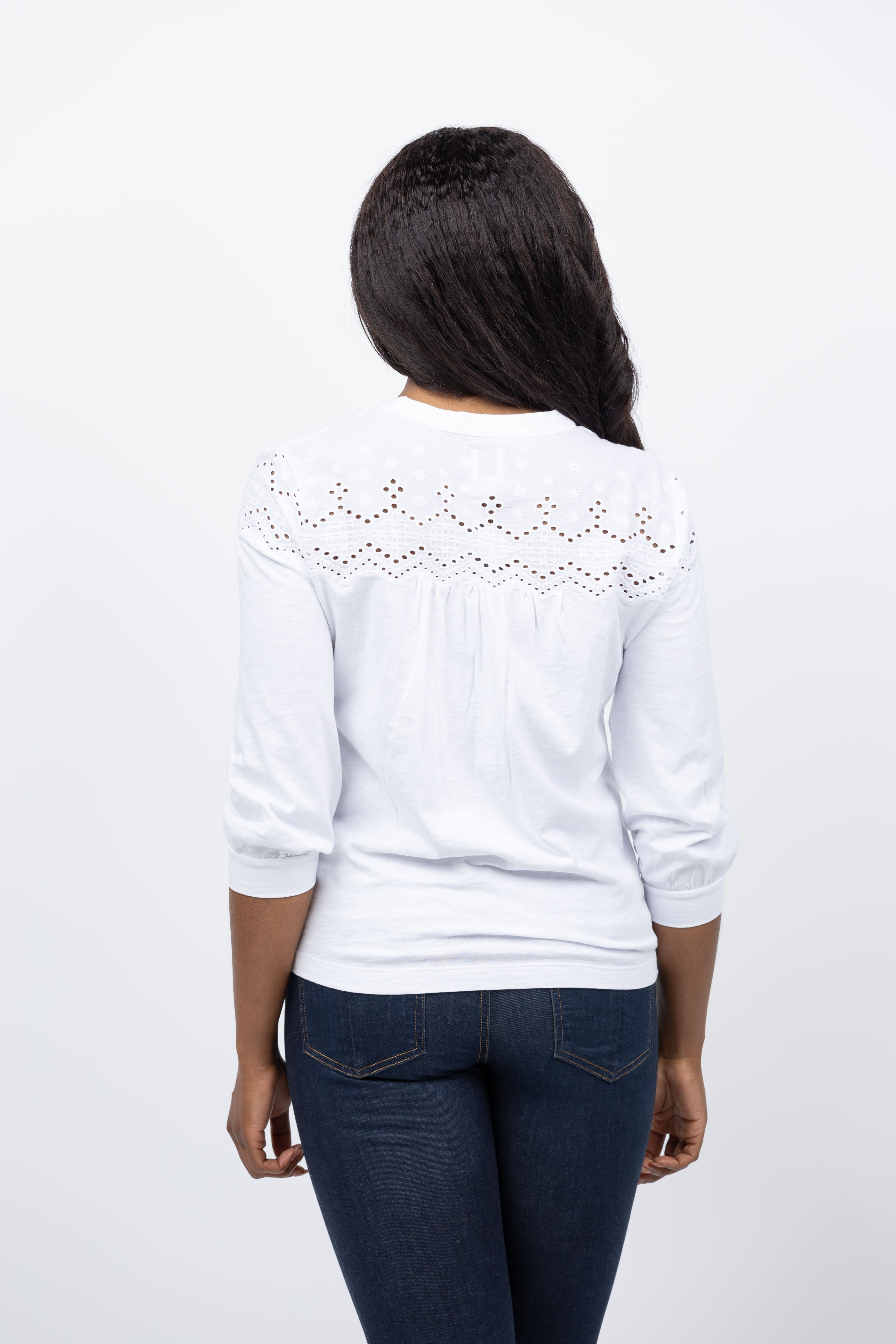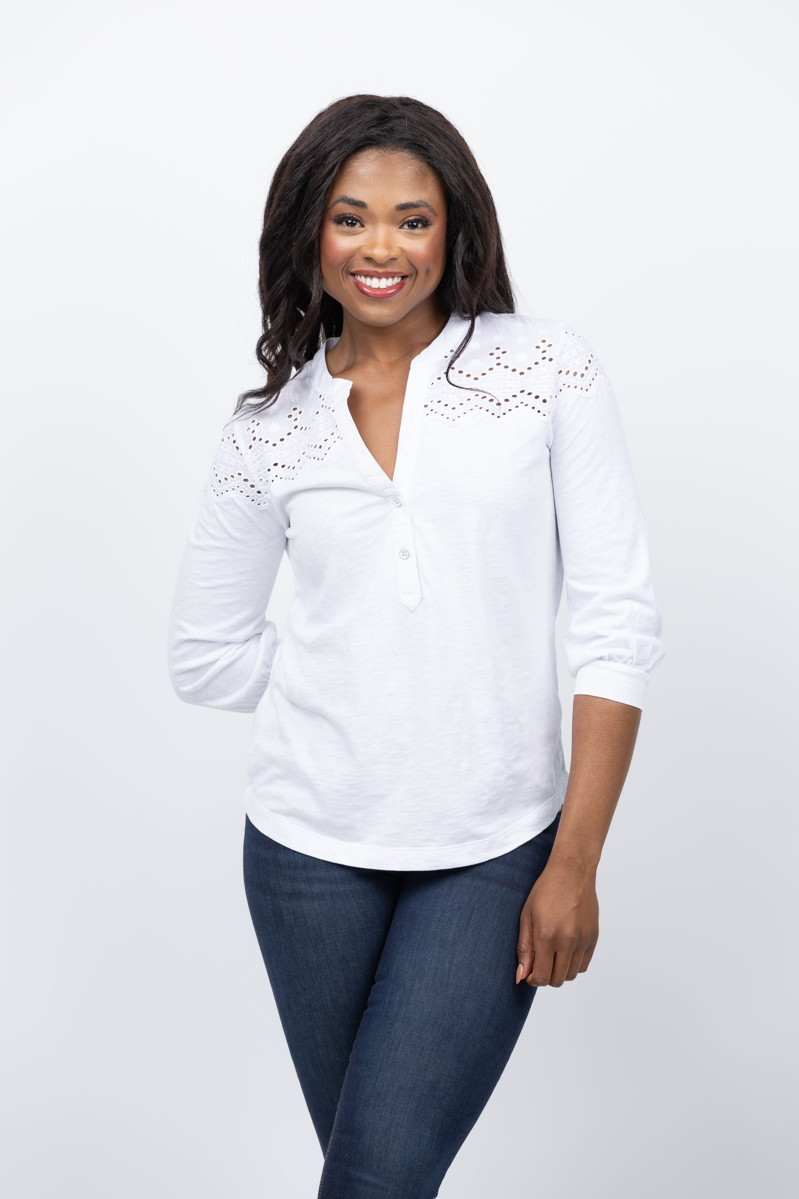 The Nic + Zoe Go to Top in Paper White is a mix of modern and vintage styles. Made with 100% cotton, this comfy top features woven eyelets on the shoulders and stretch cuffs for versatility. The easy pull-on silhouette and waist-length hem make it a must-have for any wardrobe.