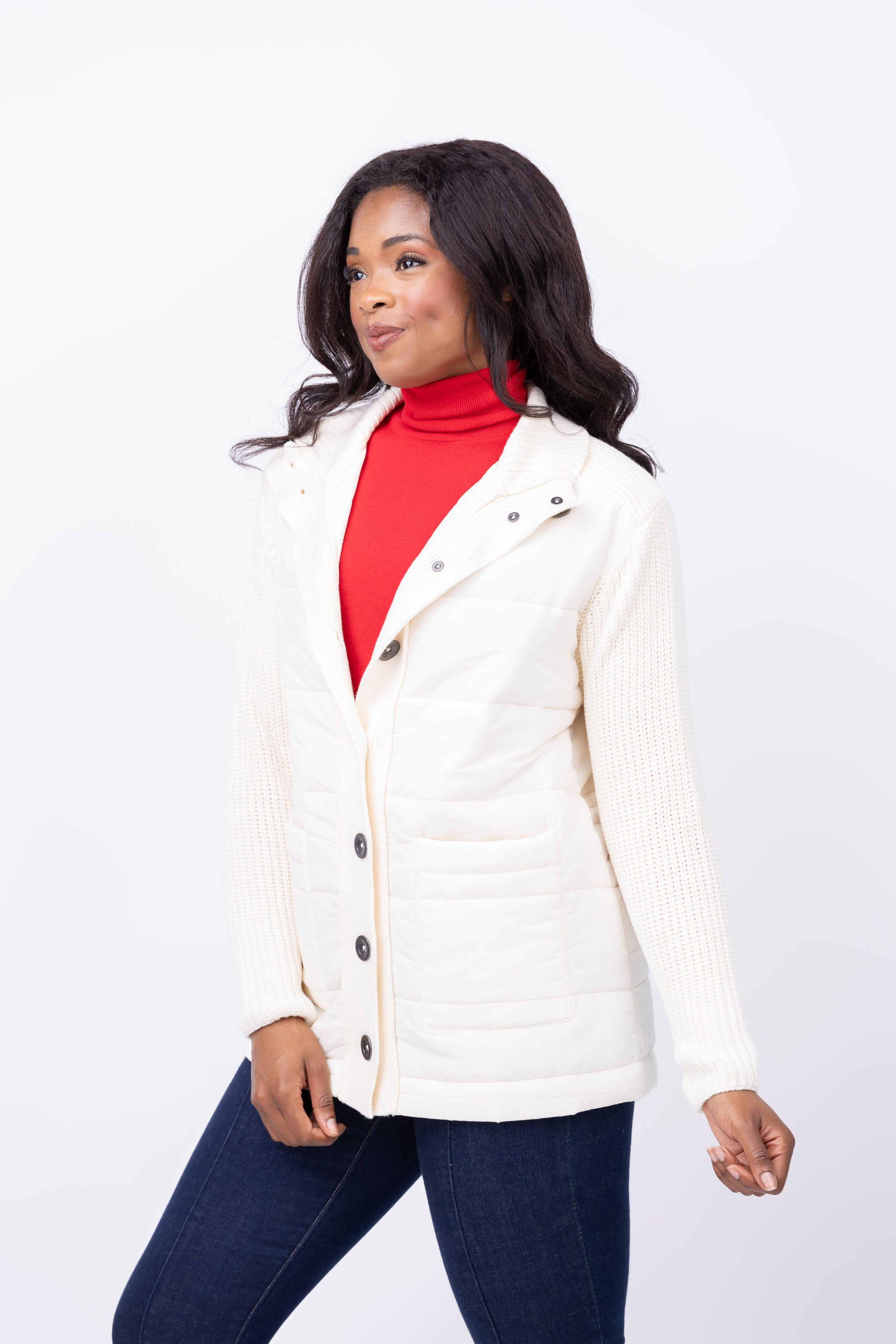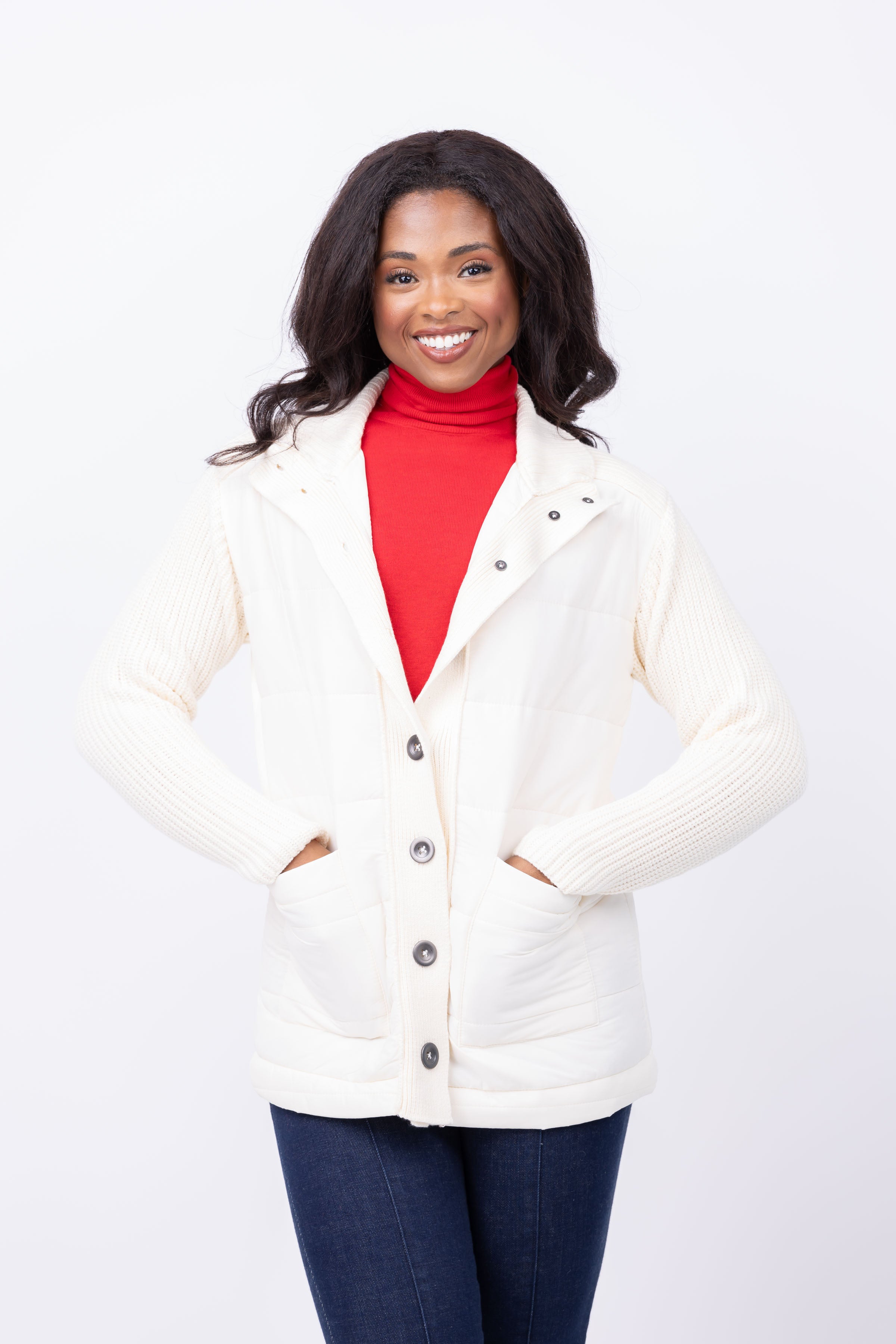 Experience the best of both worlds with the Nic + Zoe Mix Media Quilted Puffer Jacket! This unique piece features a lightweight yet cozy puffer construction on the chest, paired with luxurious shaker stitch sleeves. Complete with a ribbed collar, button closure, and hidden cinch for a customizable fit. Stay on-trend while staying warm. Is it a puffer or knitwear? It's both!