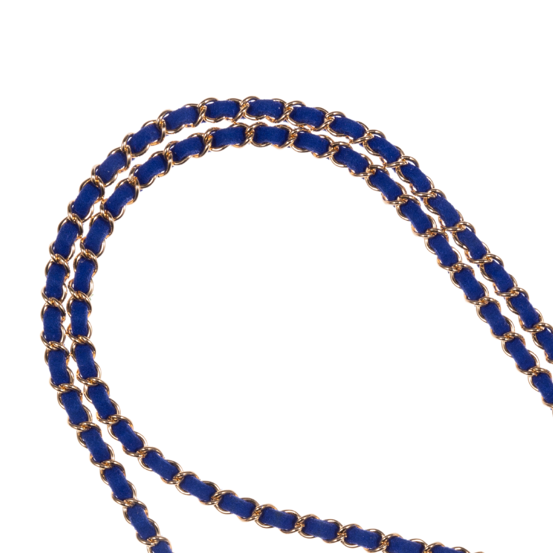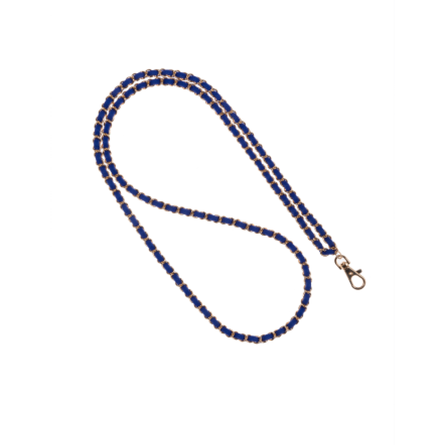 Gold Plated Crossbody Phone Chain with 100% Royal Blue Suede Woven Throughout. With Phone Chains this chic, there has never been a more convenient, lightweight, and fashionable way to keep your phone with you; hands-free.