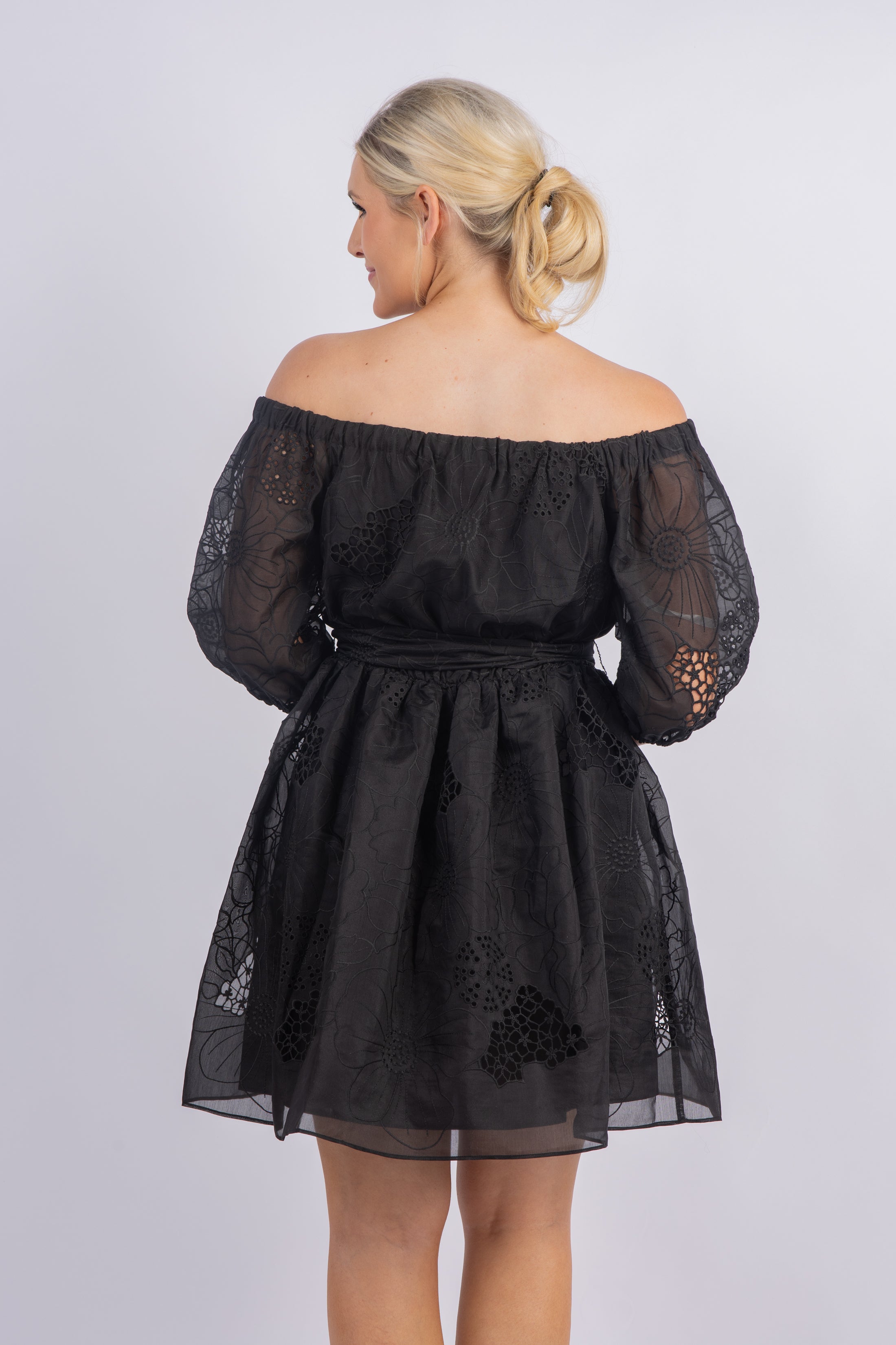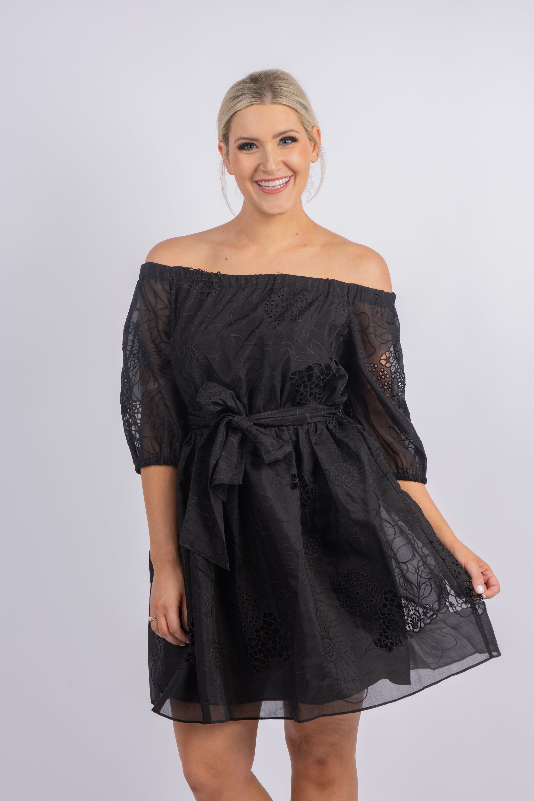 Indulge in the playfulness of the Shoshanna Salana dress, crafted with eye-catching floral embroidery and flirty cutouts. The off-the-shoulder neckline, blouson sleeves with elasticized cuffs, waist self-tie and A-line silhouette create a flattering fit, perfect for any occasion. Soft yet durable linen-cotton-polyester blend ensures lasting comfort. Dare to be beautiful!