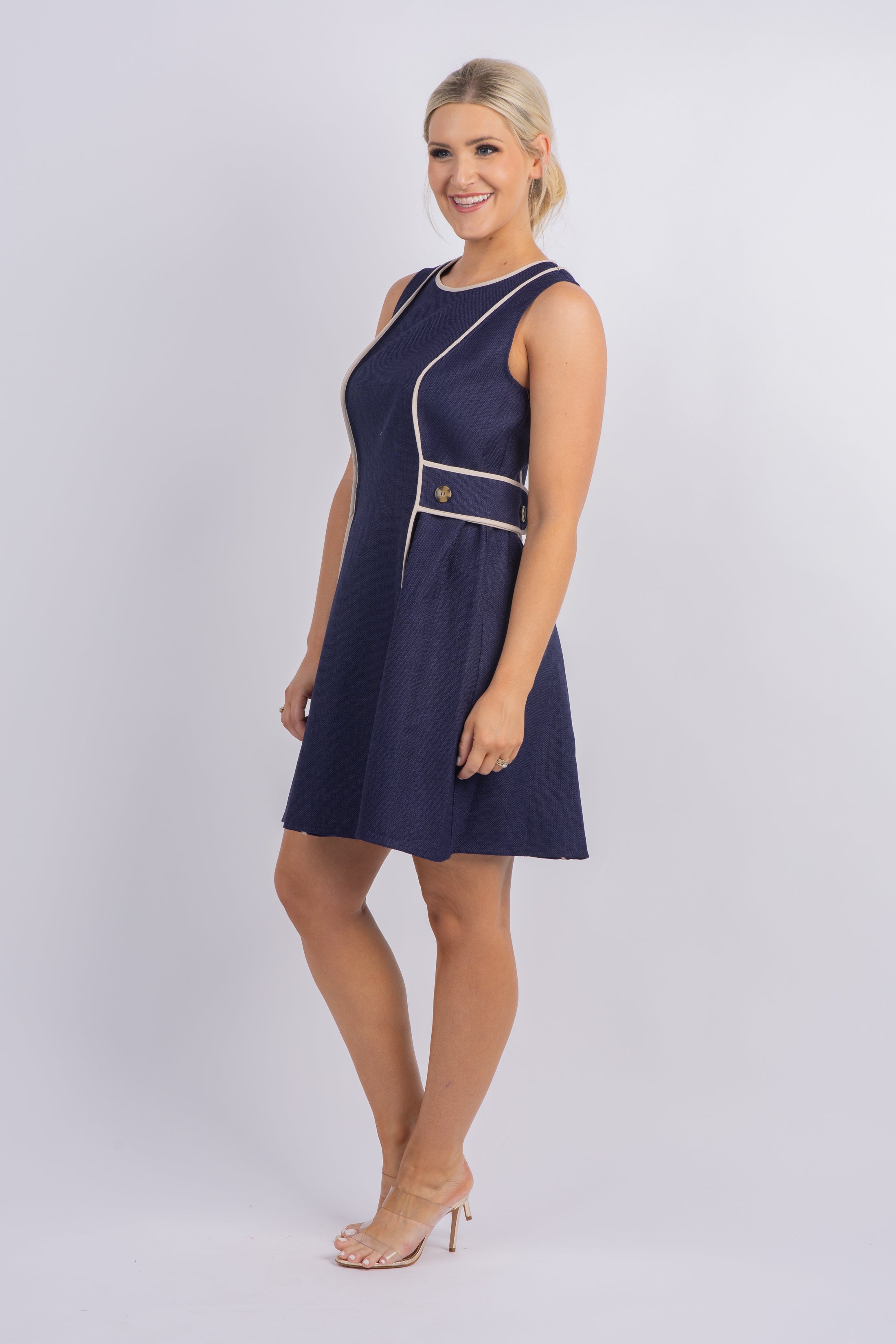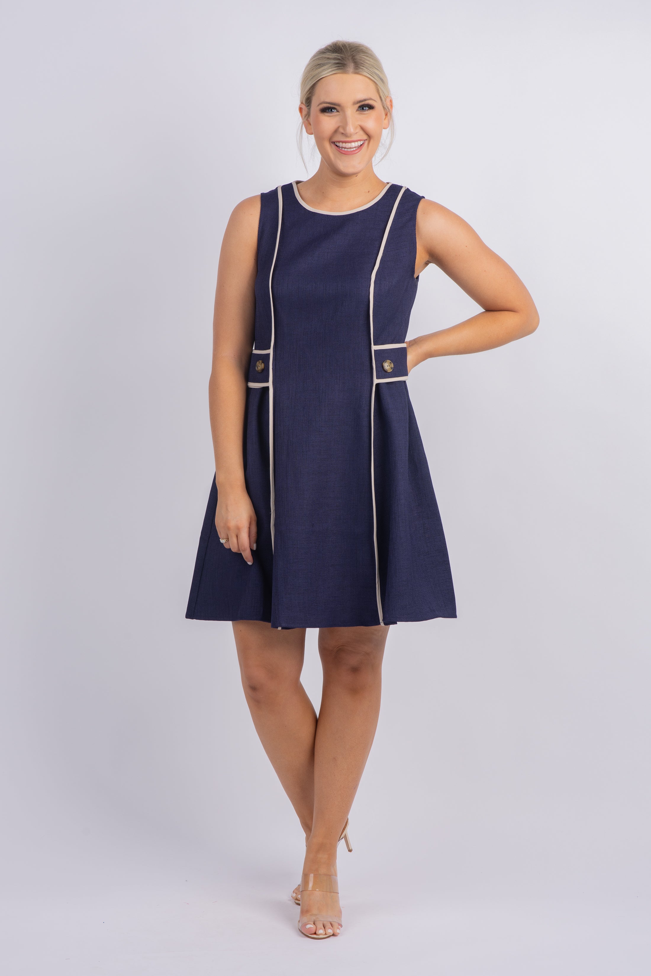 Look your best in the Shoshanna Samara Dress! Crafted from 100% Polyester, this fit-and-flare silhouette boasts a round neckline, sleeveless arms, and contrasting piping for a look that's both contemporary and timeless. Button tab detail on each side, along with a back zipper closure make it easy to wear and ensure you look great all day. Who doesn't want that? Try it now and find your perfect fit; it's true to size.