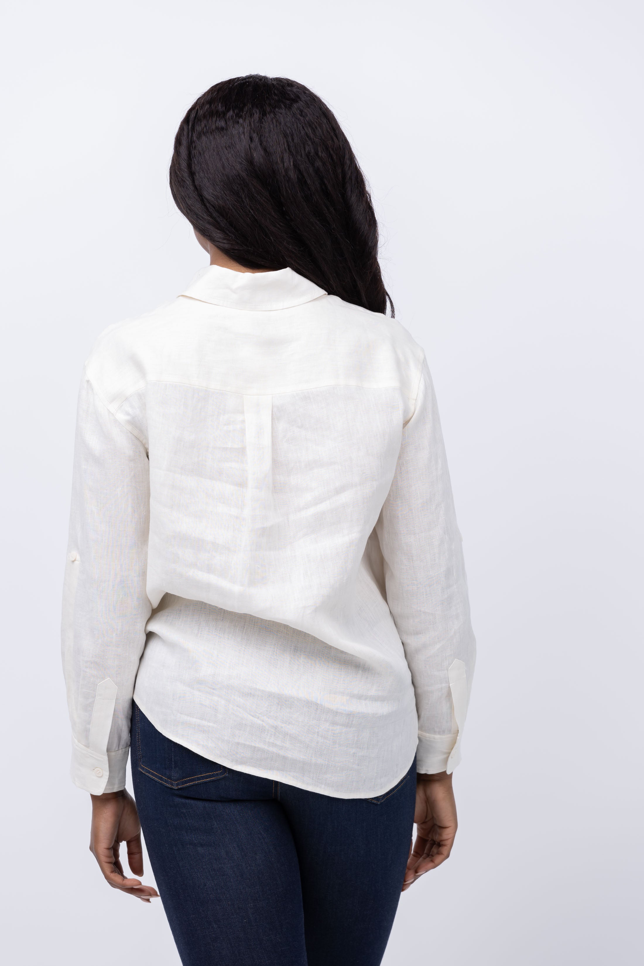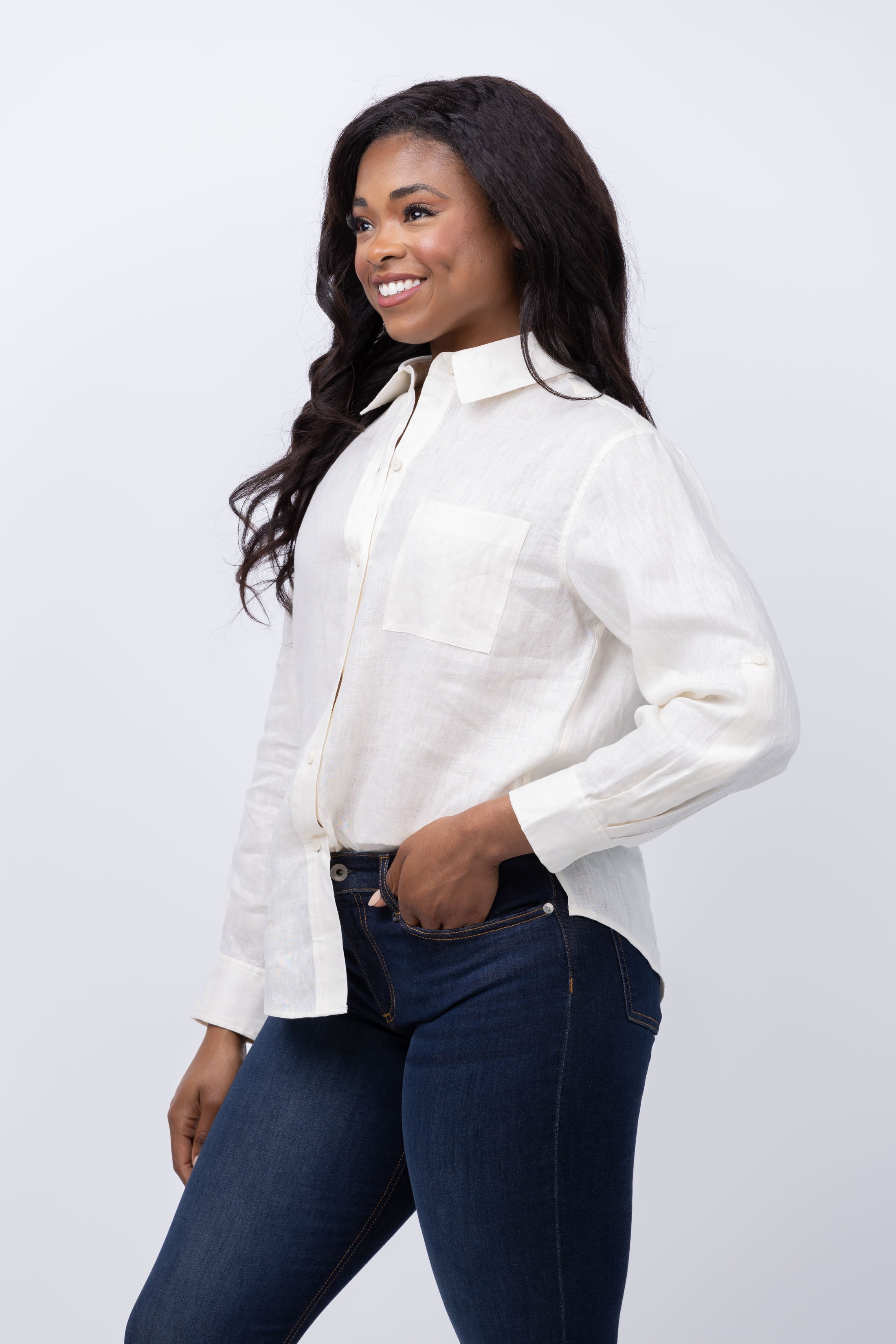 Elevate your summer style with the Simkhai Johanna Top in White. Made from high-quality linen, this button-up shirt is the perfect addition to your wardrobe. Its breezy design and collared neckline make it the perfect choice for warm weather, delivering effortless style and comfort. Show off your fashion sense with this must-have piece!