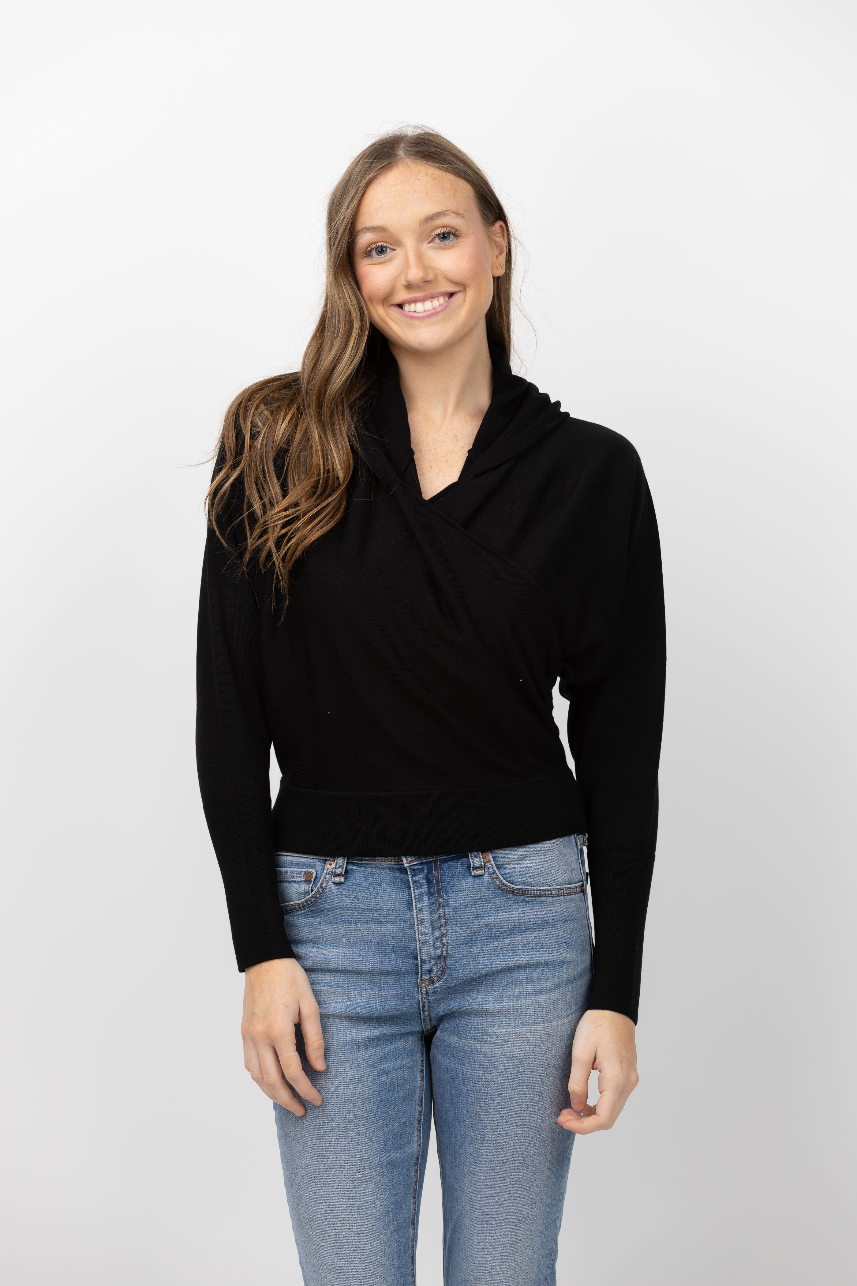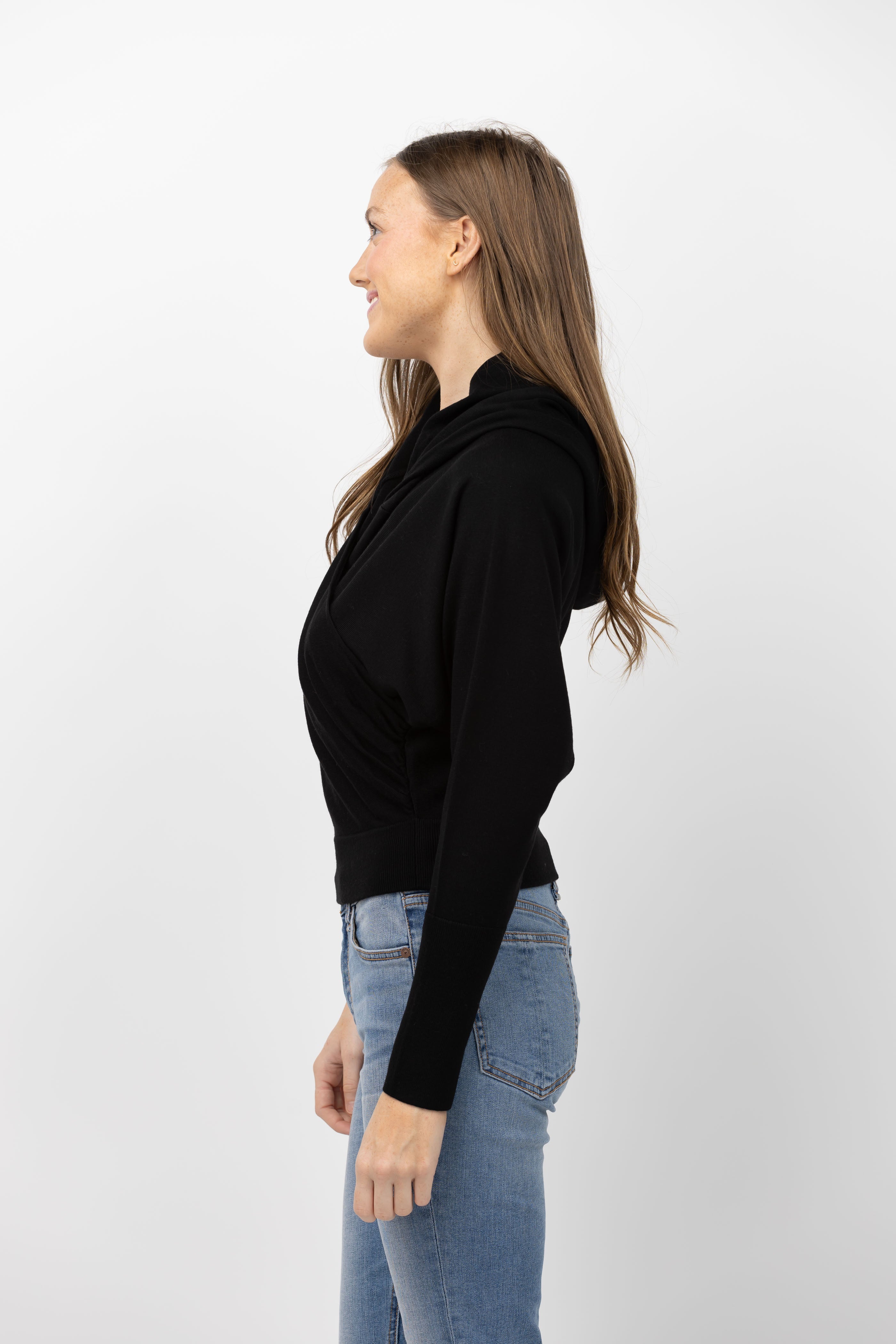 Indulge in luxury and comfort with the Simkhai Riley Wrap Hoodie in Black. Crafted from 100% merino wool, this relaxed fit hoodie boasts a unique front crossover design and cozy hood for style and warmth. Perfect for a casual and chic look.