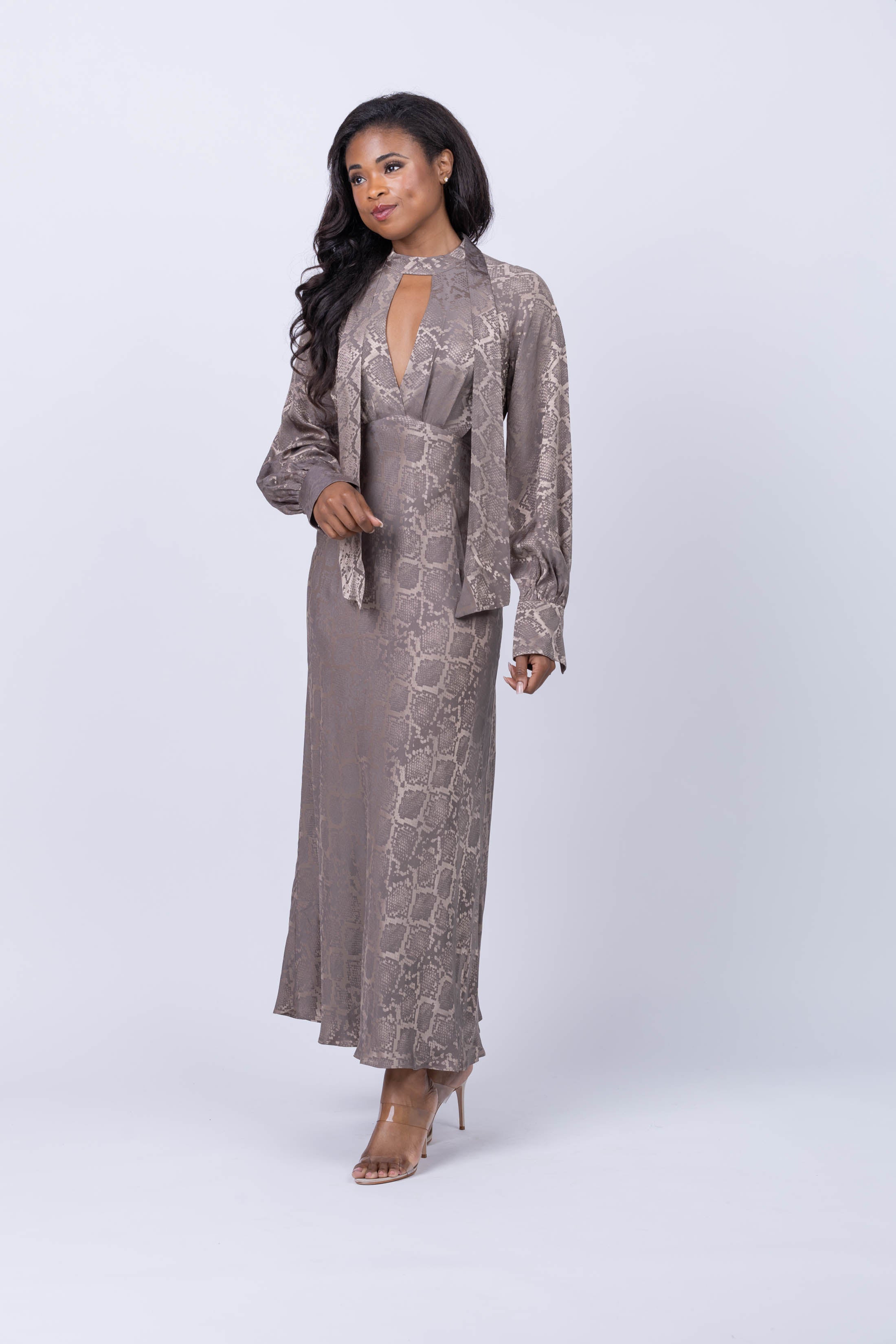 Elevate your look with this timeless Simkhai Tawney dress. Made from a luxurious Affogato Python print, it features a chic Empire waist and a captivating billowy tie detail draping from the back collar. Effortlessly graceful and elegant - are you ready to make a statement?