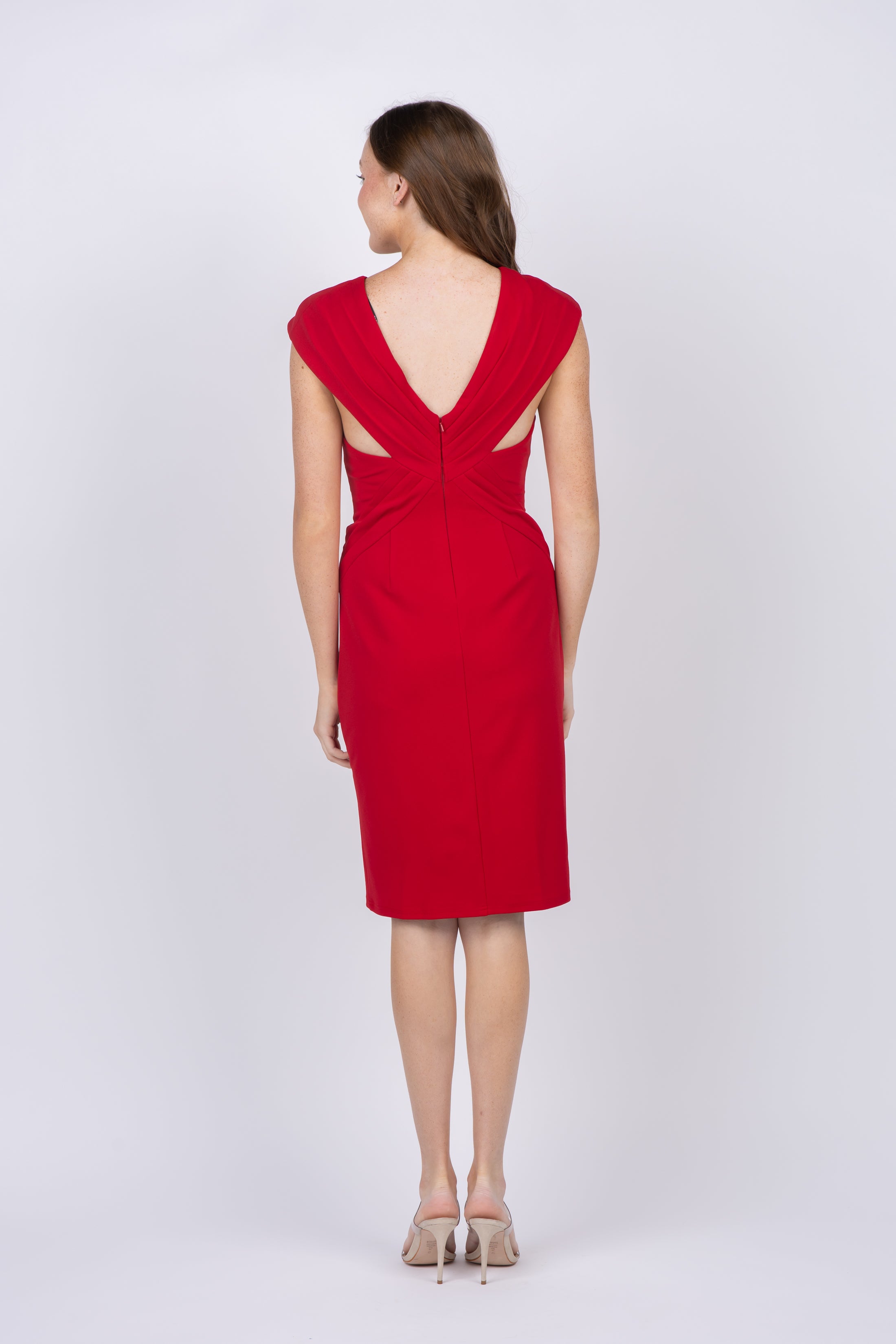 Turn heads in the Tadashi Twist Front Dress! This classic red cocktail dress features sophisticated back cut-outs and a tie neck for an unforgettable look. Whether you're attending a wedding or a night out, you'll look and feel fabulous in this timeless piece!