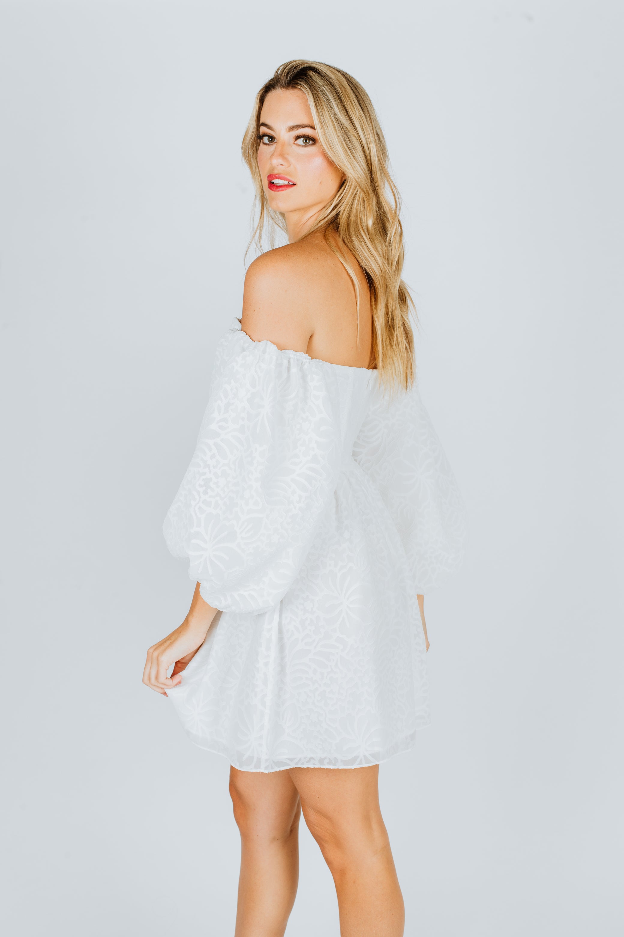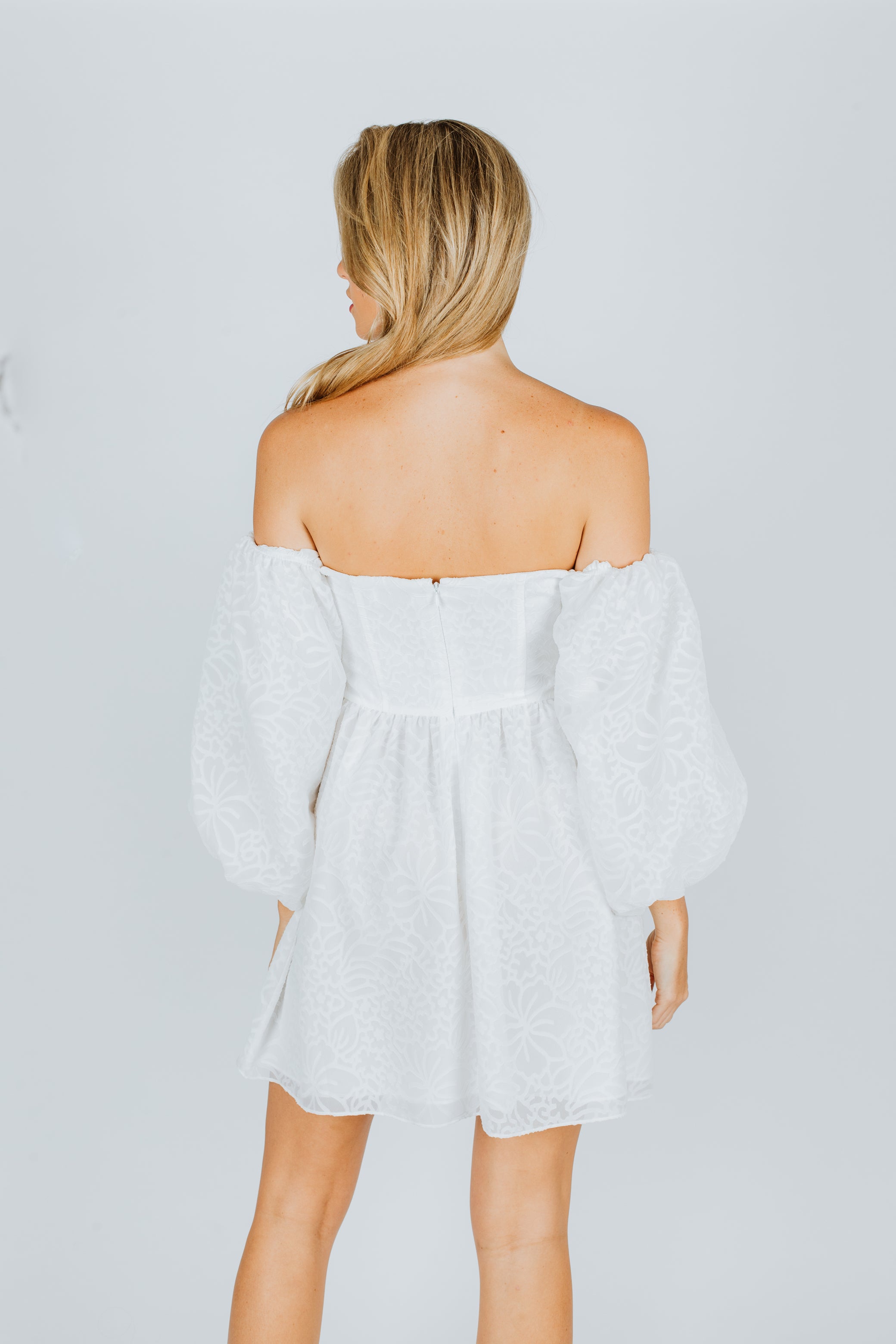 Designed for Tanya Taylor, the Josette minidress features an off-the-shoulder design with long puff-sleeves.
