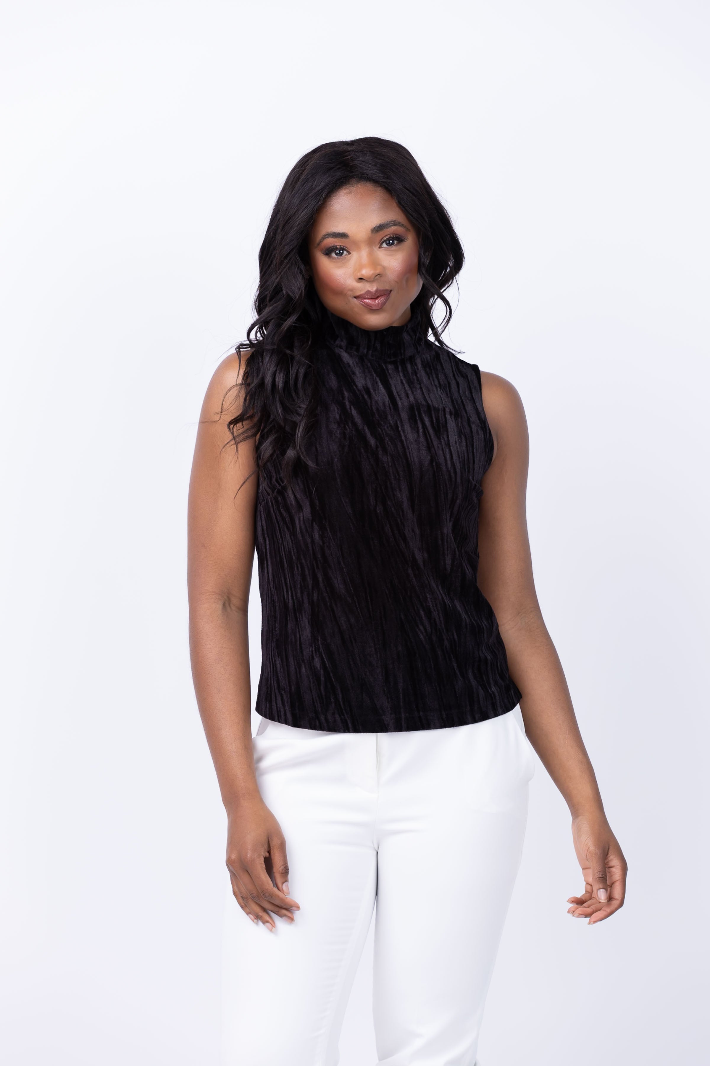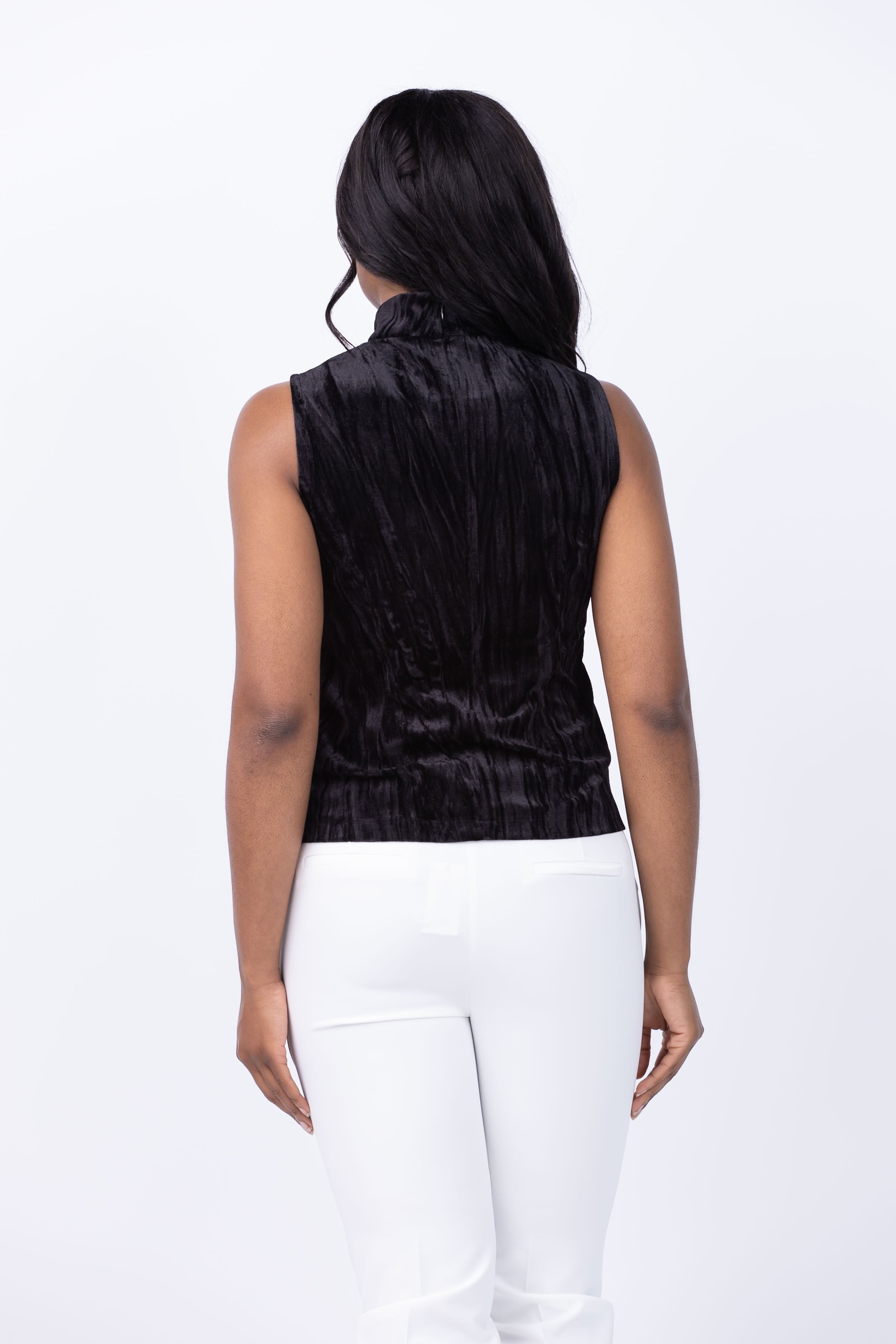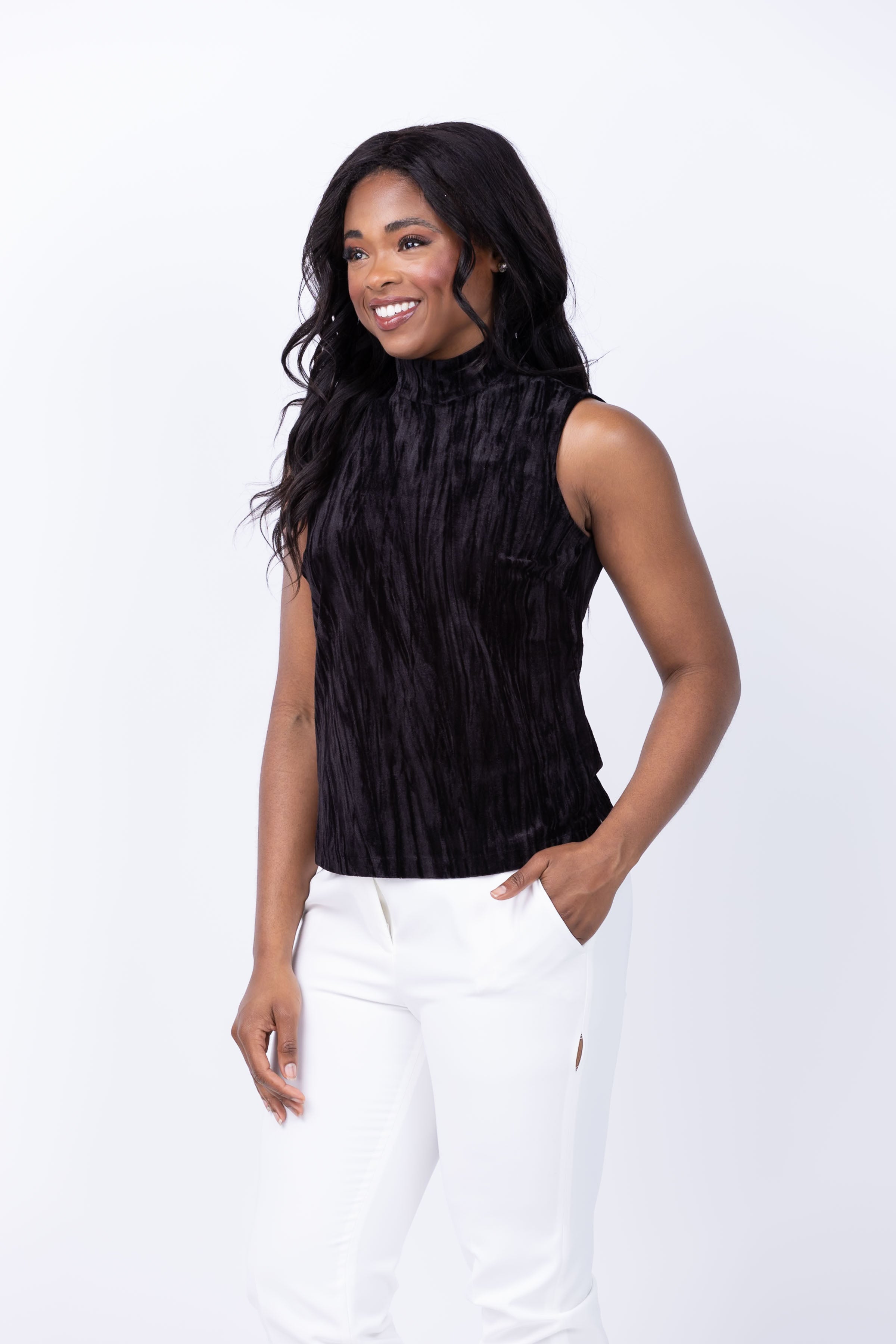 Get ready to turn heads at your holiday parties this season with the Tyler Boe Sid Crushed Velvet Mock Neck top in Black! Made from our luxurious and soft crushed velvet fabric, this festive top will have you feeling elegant and comfortable all night long. The sleeveless design and mock neck add a touch of sophistication, while the zip back closure ensures a perfect fit. Elevate your holiday style with this must-have piece!