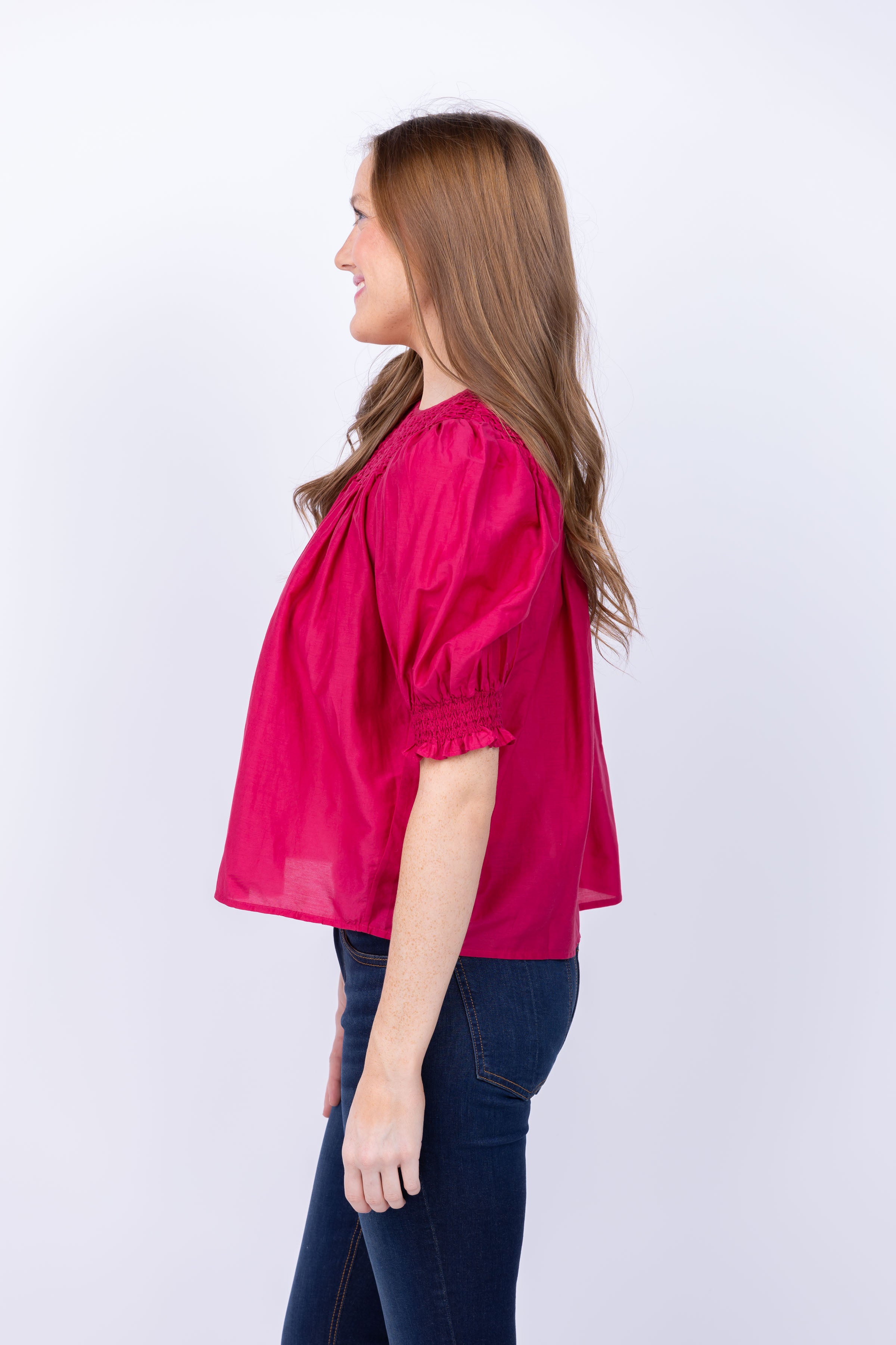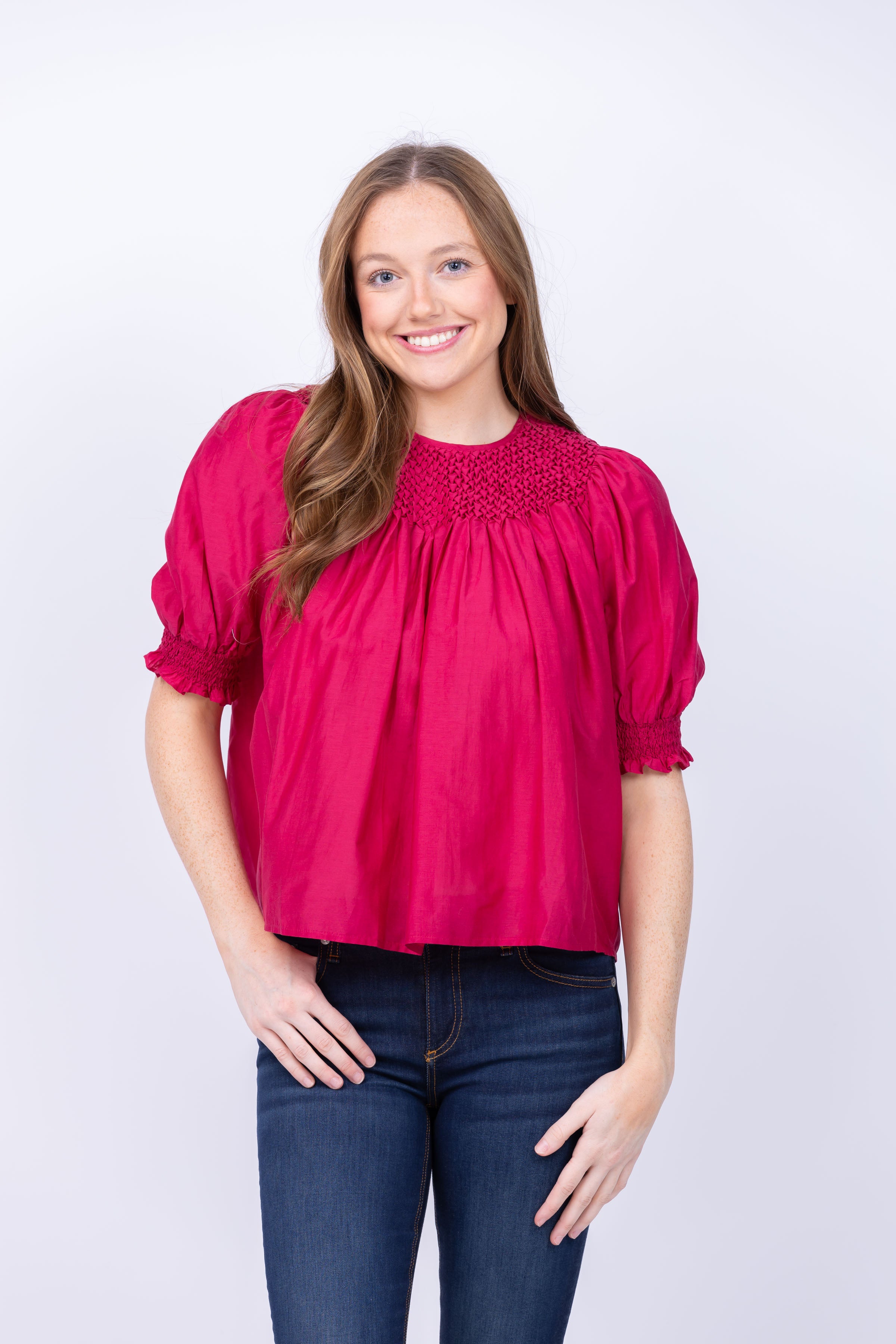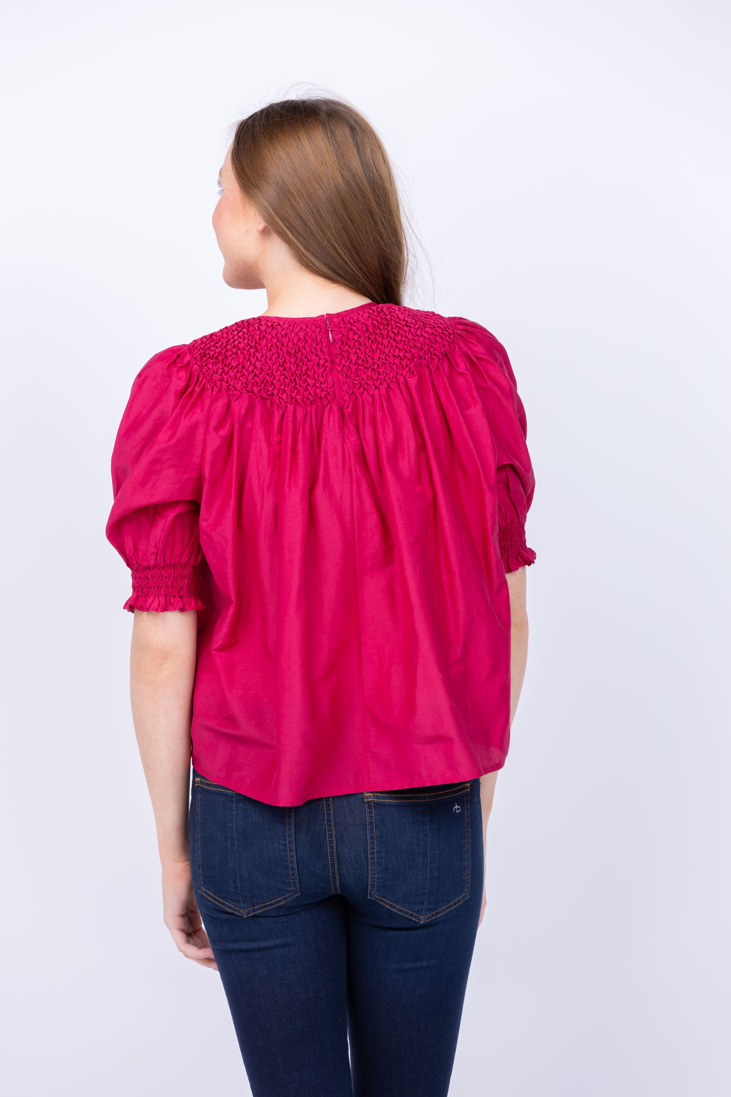 Experience effortless elegance and style with the Ulla Johnson Alita Top in Peony. The delicate puff sleeves and smocked details add a touch of femininity to this versatile blouse. Perfect for any occasion, this top will make you feel confident and chic.
