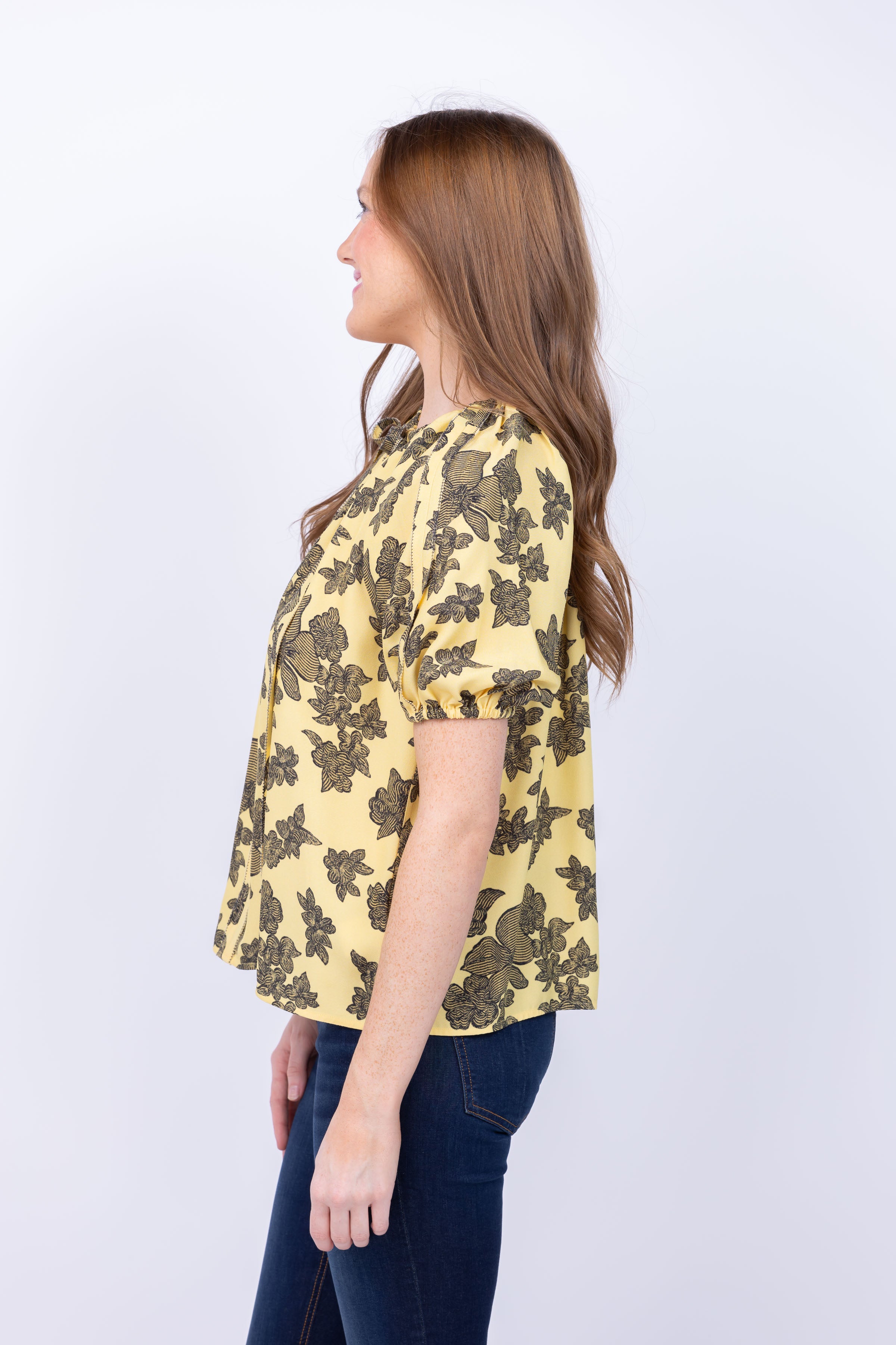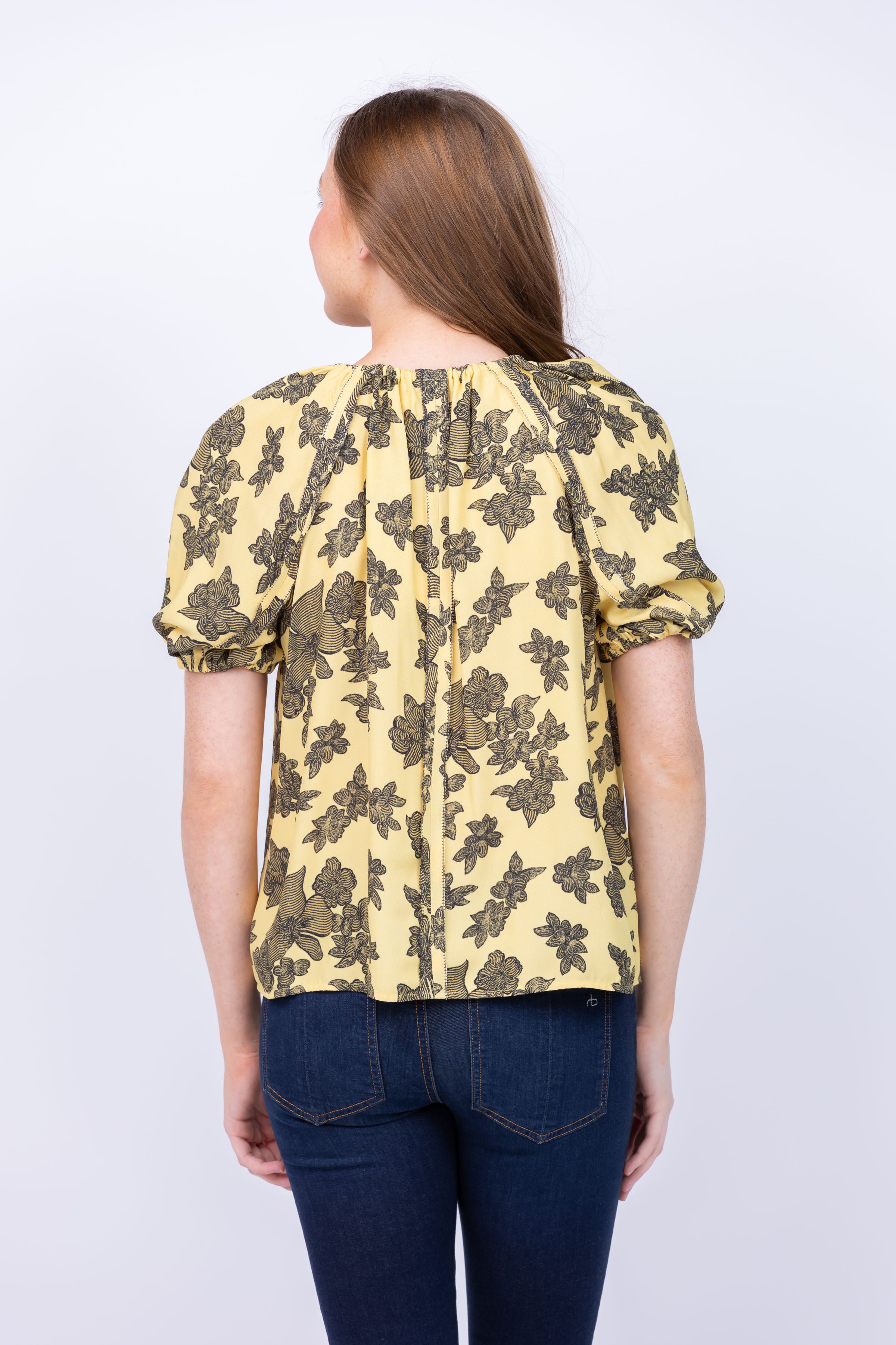 Elevate your style with the Ulla Johnson Marcelena Top in Solaris. Featuring a flowy silhouette and delicate, hand-painted floral motifs, this yellow satin-back crepe top is both elegant and comfortable. The puff shoulders add a touch of drama, while the neckties can be fastened or left undone for a versatile look. Perfect for pairing with your favorite wardrobe pieces.