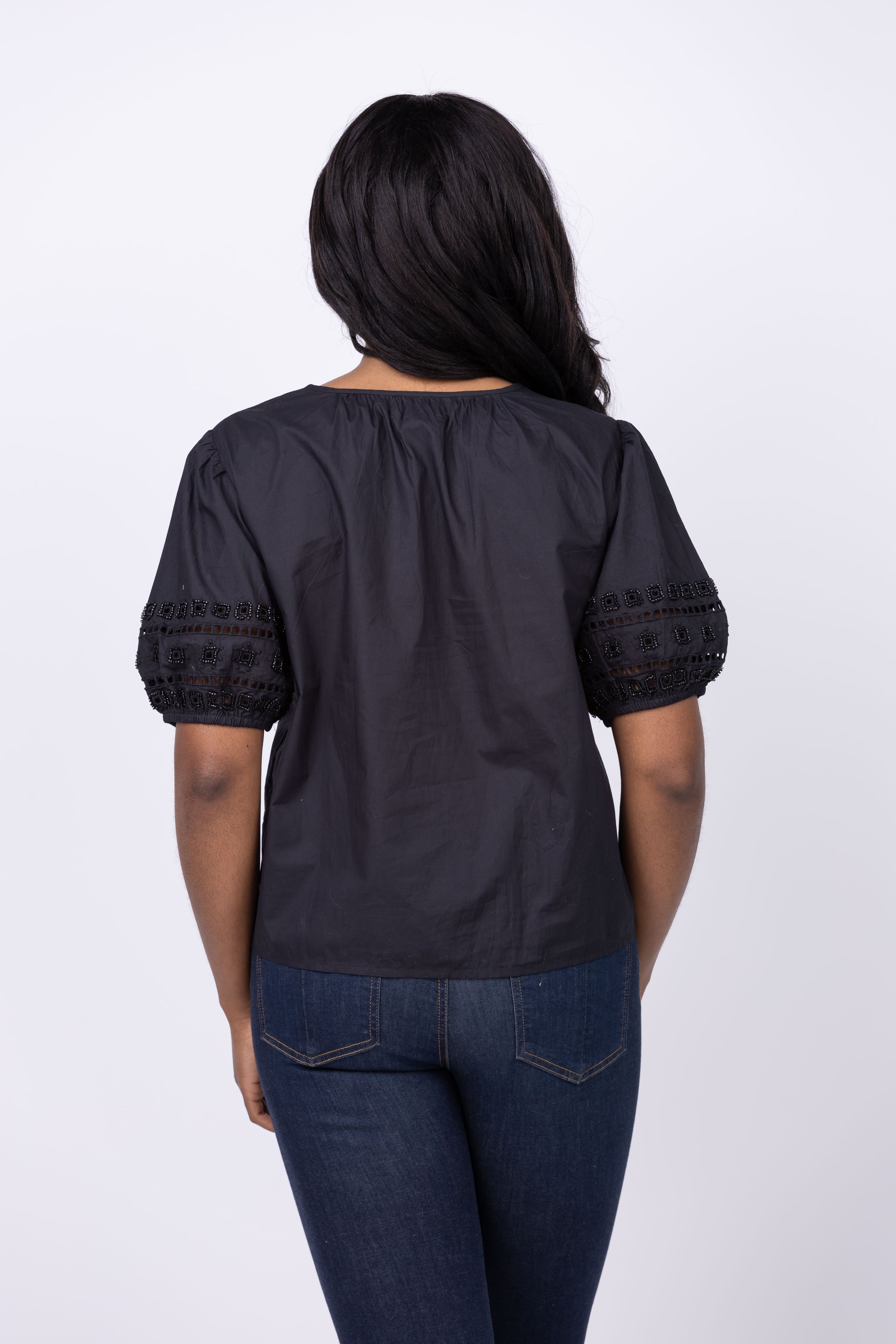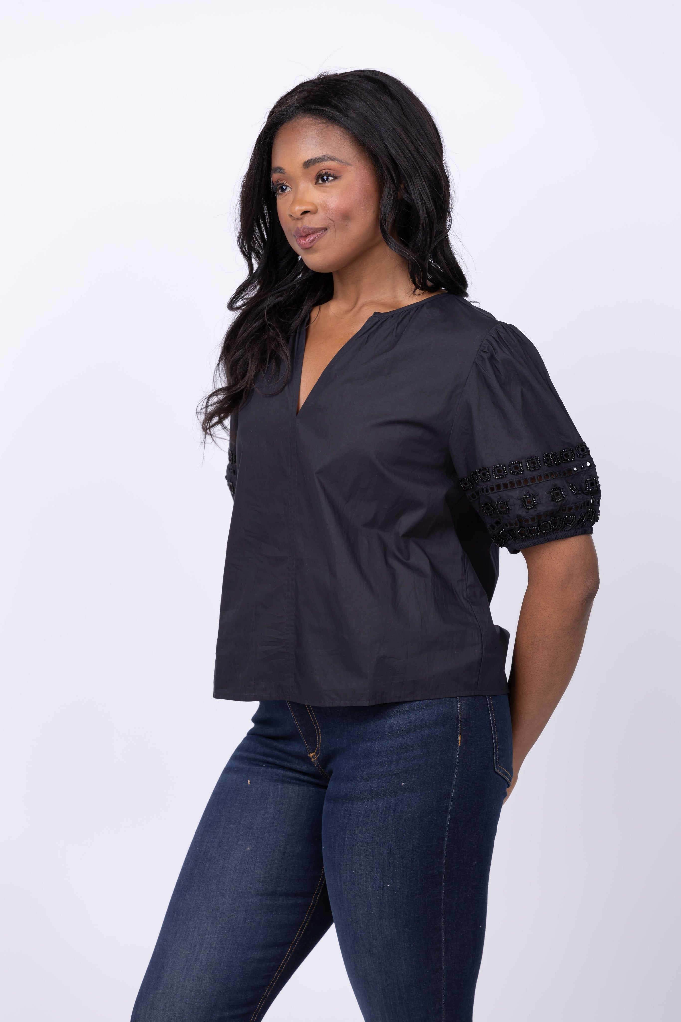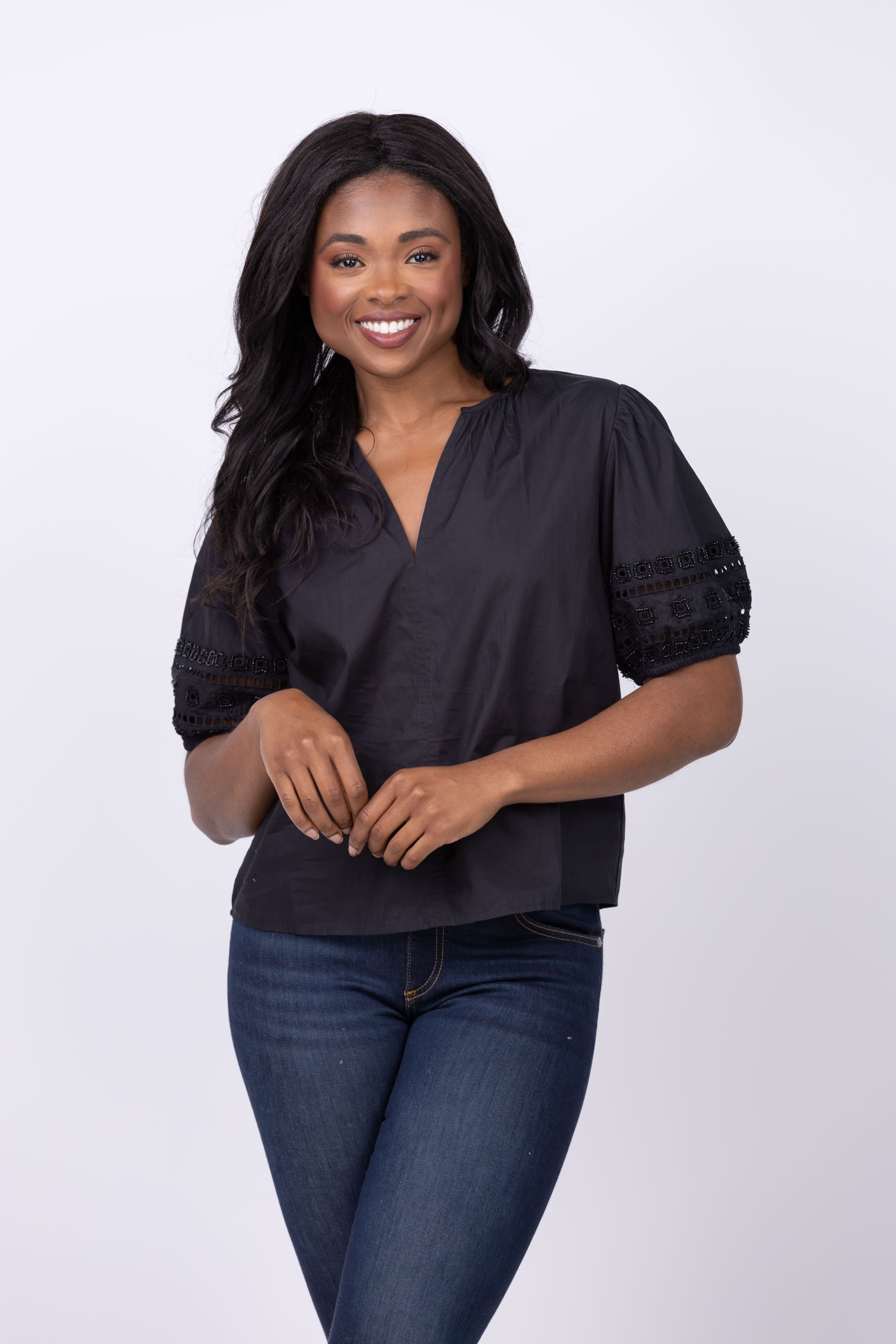 The Velvet By Graham & Spencer Martah Top is a must-have addition to your wardrobe. With a flattering v-neck, short puff sleeves, and delicate eyelet details, this top exudes a feminine and elegant charm. Perfect for any occasion, it will make you feel confident and stylish. Add it to your collection today!