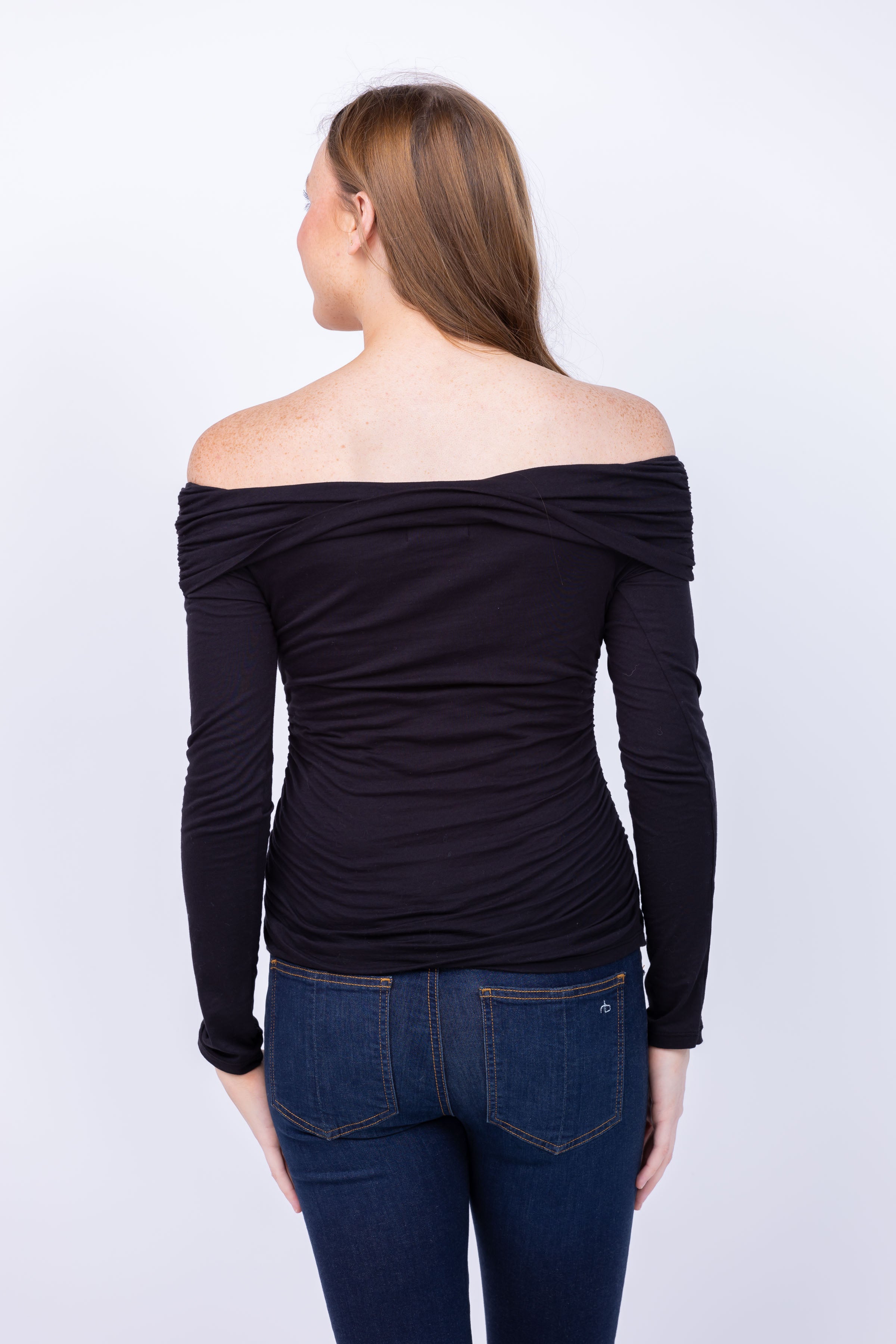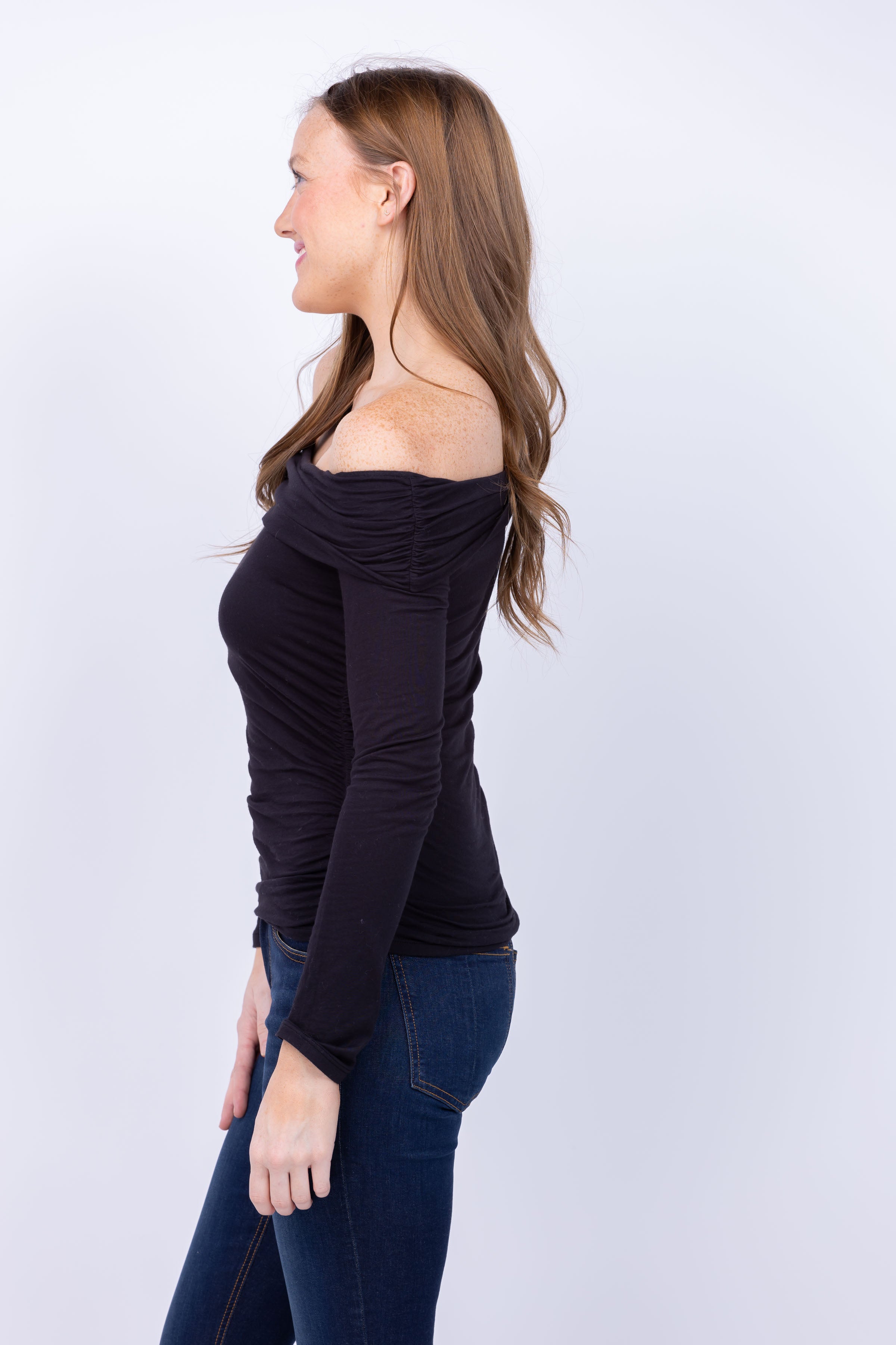 Unleash your effortless style with this ultra-soft Velvet By Graham & Spencer Regina tee in black. Made from signature gauzy whisper cotton with a touch of stretch, it features an off-the-shoulder neckline and shirred side seams for added texture. A must-have versatile essential for any wardrobe!