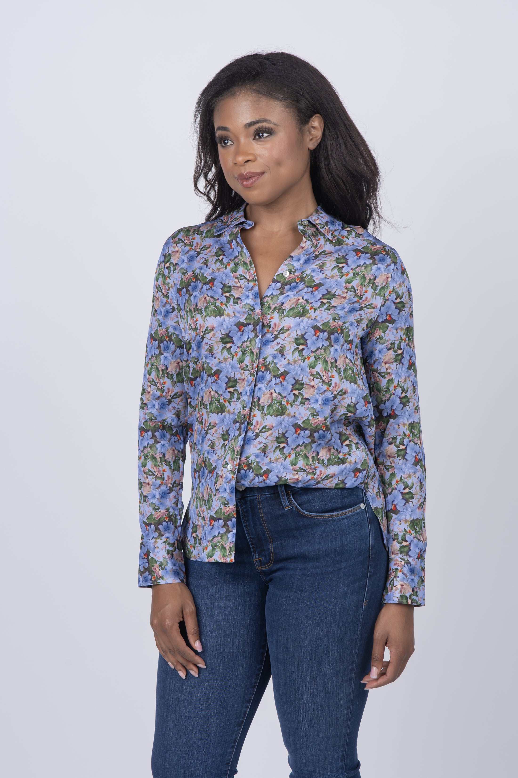 Cut on the bias, our slim-bodied silk blouse is woven with a hint of stretch for ease of movement. The classic menswear-inspired shirting details are softened in a vintage-inspired wild primrose print.