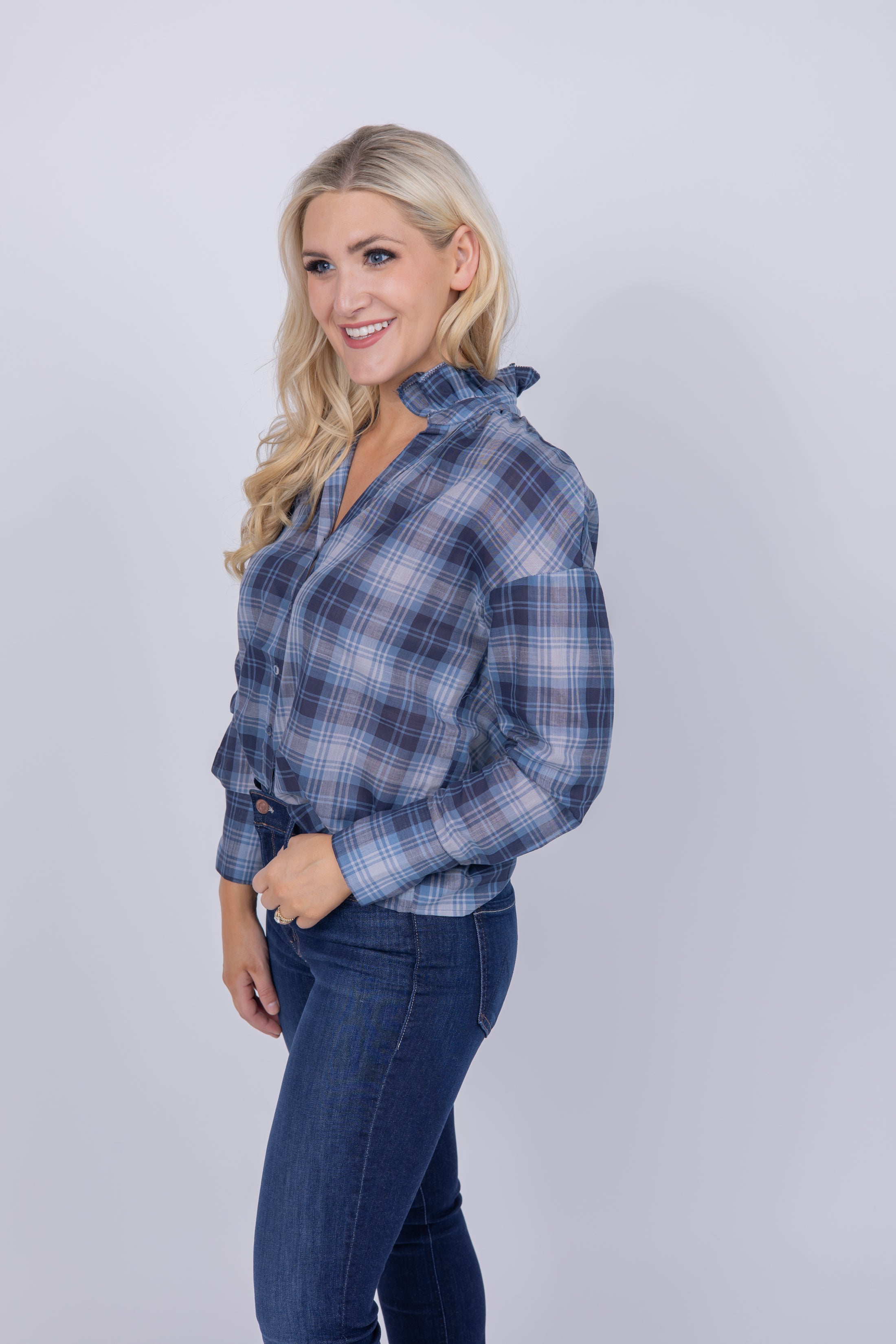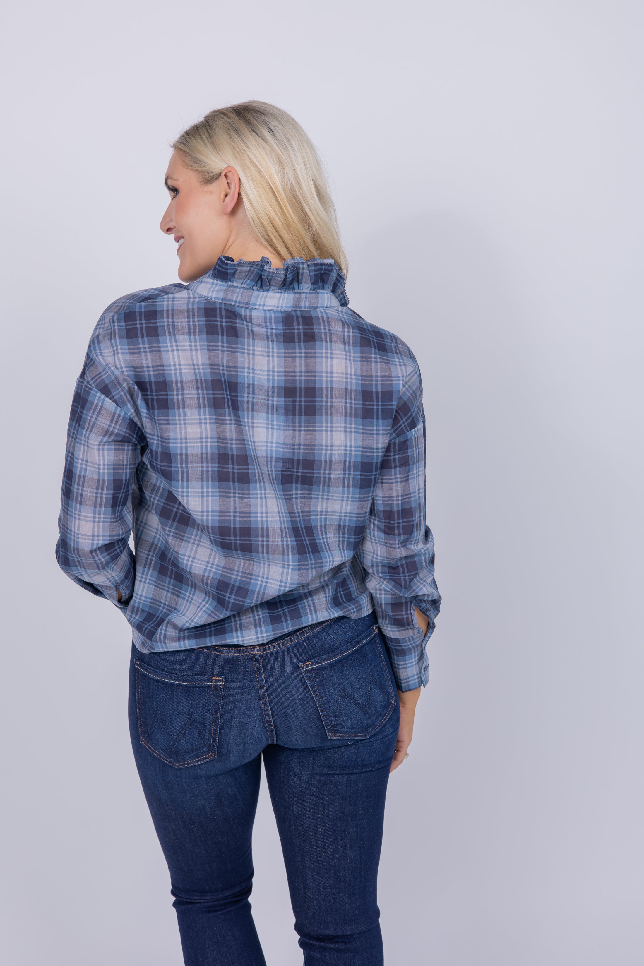 Introducing the Webber Shirt from We Are Sundays! Crafted with breathable, ultra-soft cotton voile, this elegant shirt features a button-down front with elevated two-hole covered buttons and a timeless double ruffle stand-up collar for a classic and chic look. Look and feel your best in the timeless Midnight Plaid!