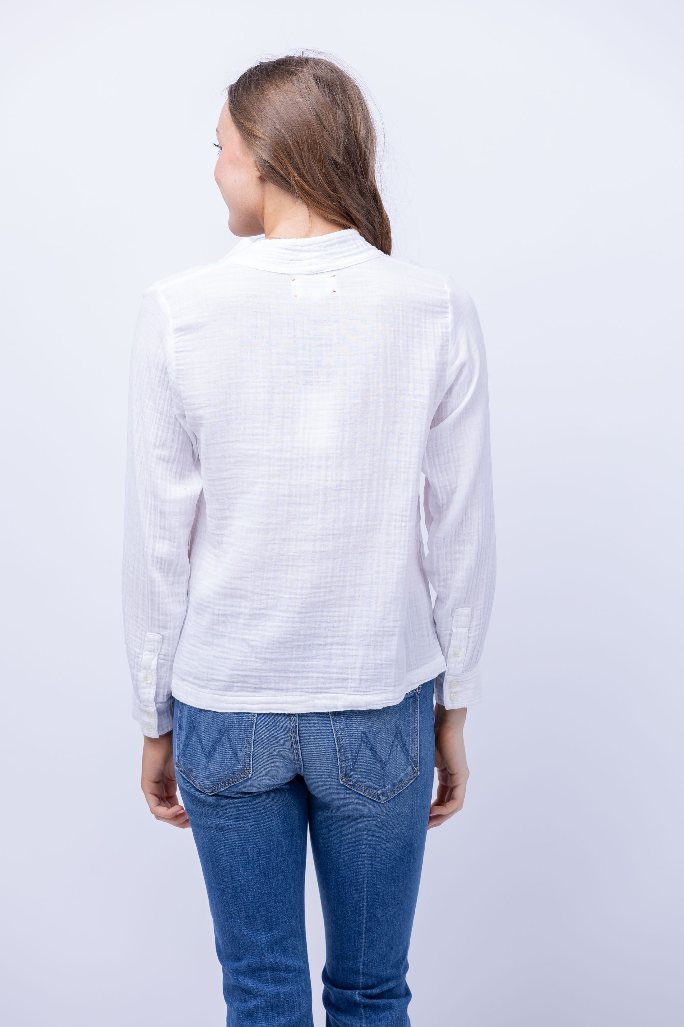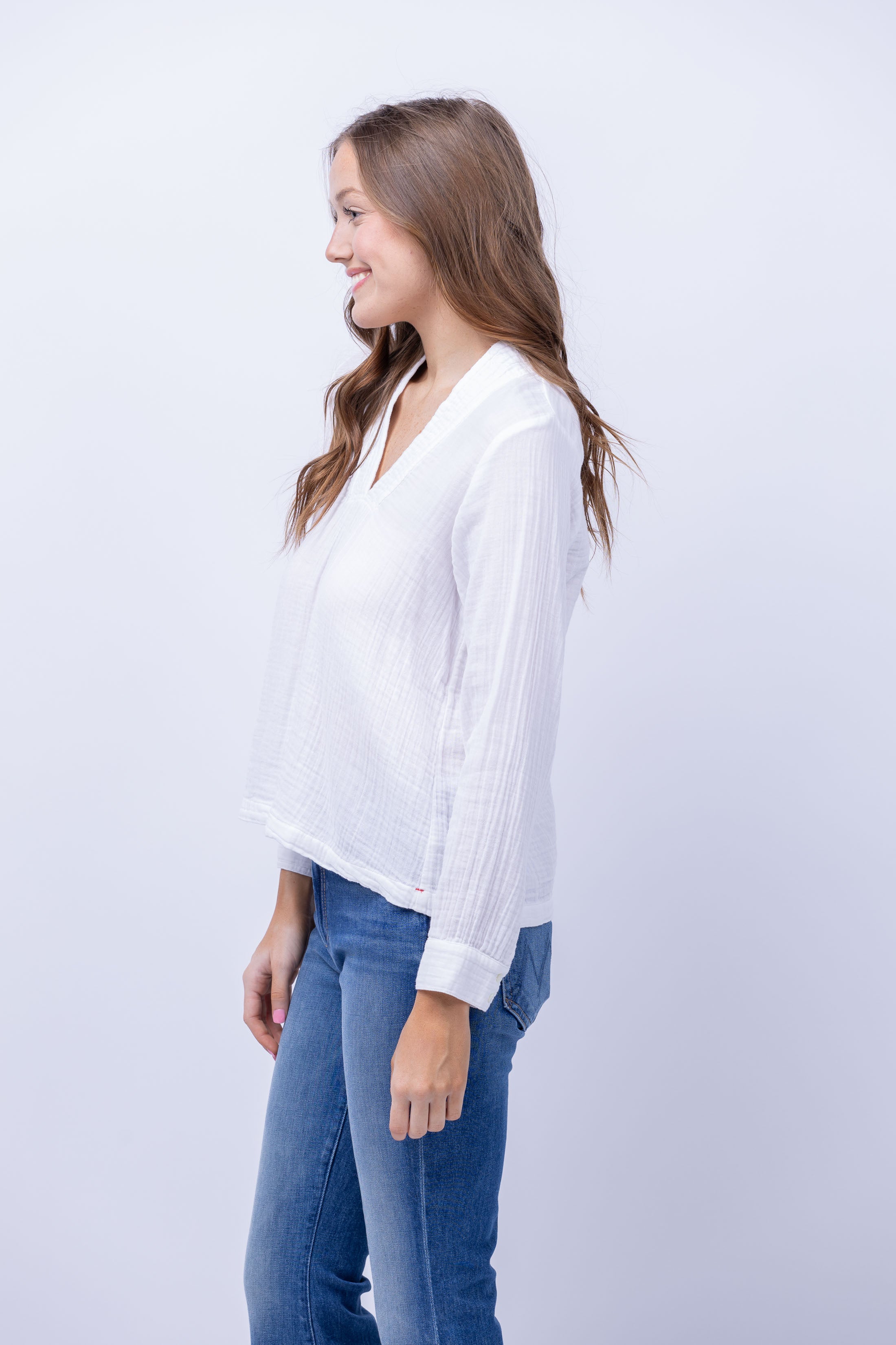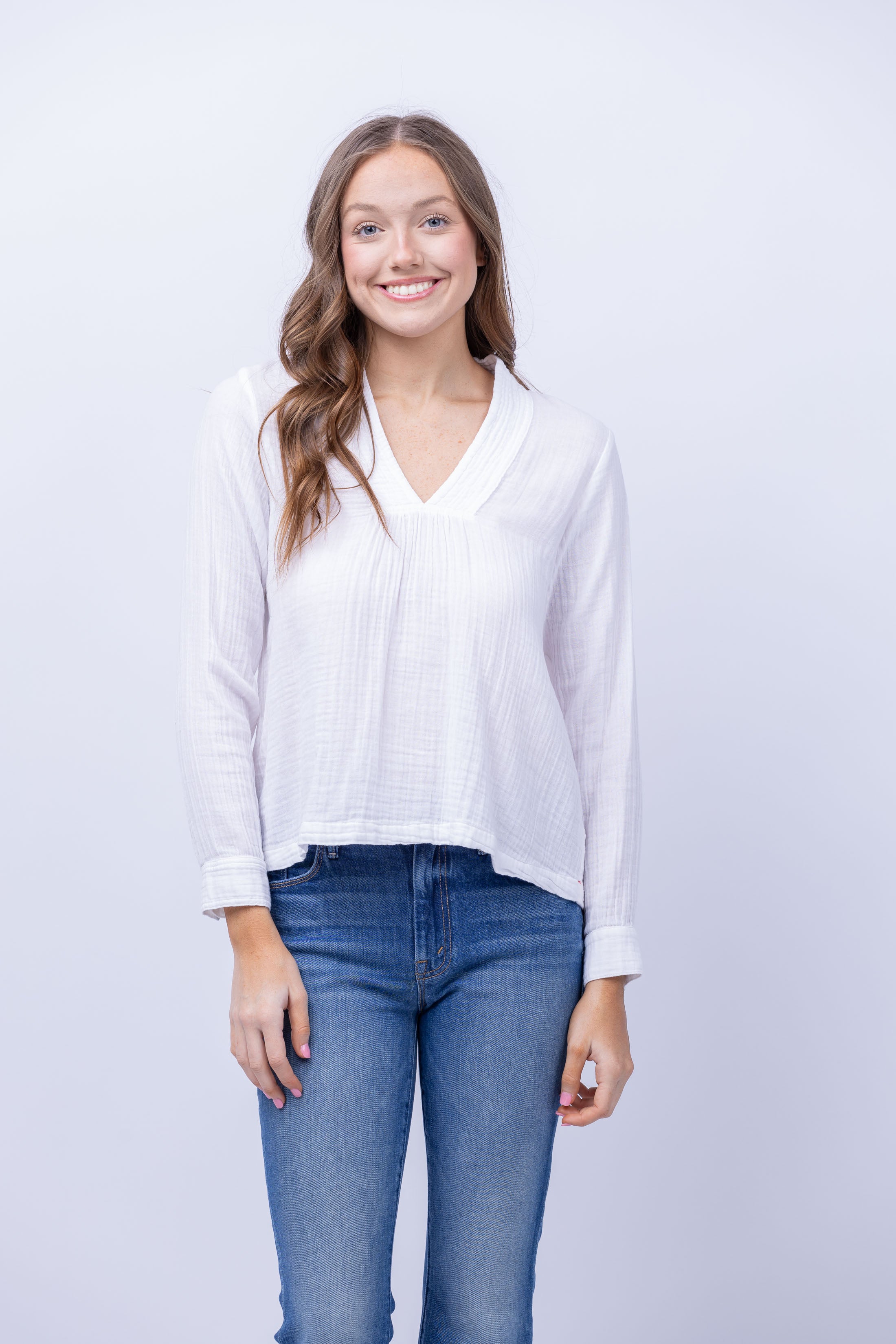 Indulge in the bare essentials with XiRENA's Hutton Top in White. Made from washed double faced cotton gauze, this top offers a soft, crinkled texture. The quilted V-neck and shirred details add a touch of elegance while the button cuffs provide a comfortable fit. Elevate your wardrobe with this easy popover top.