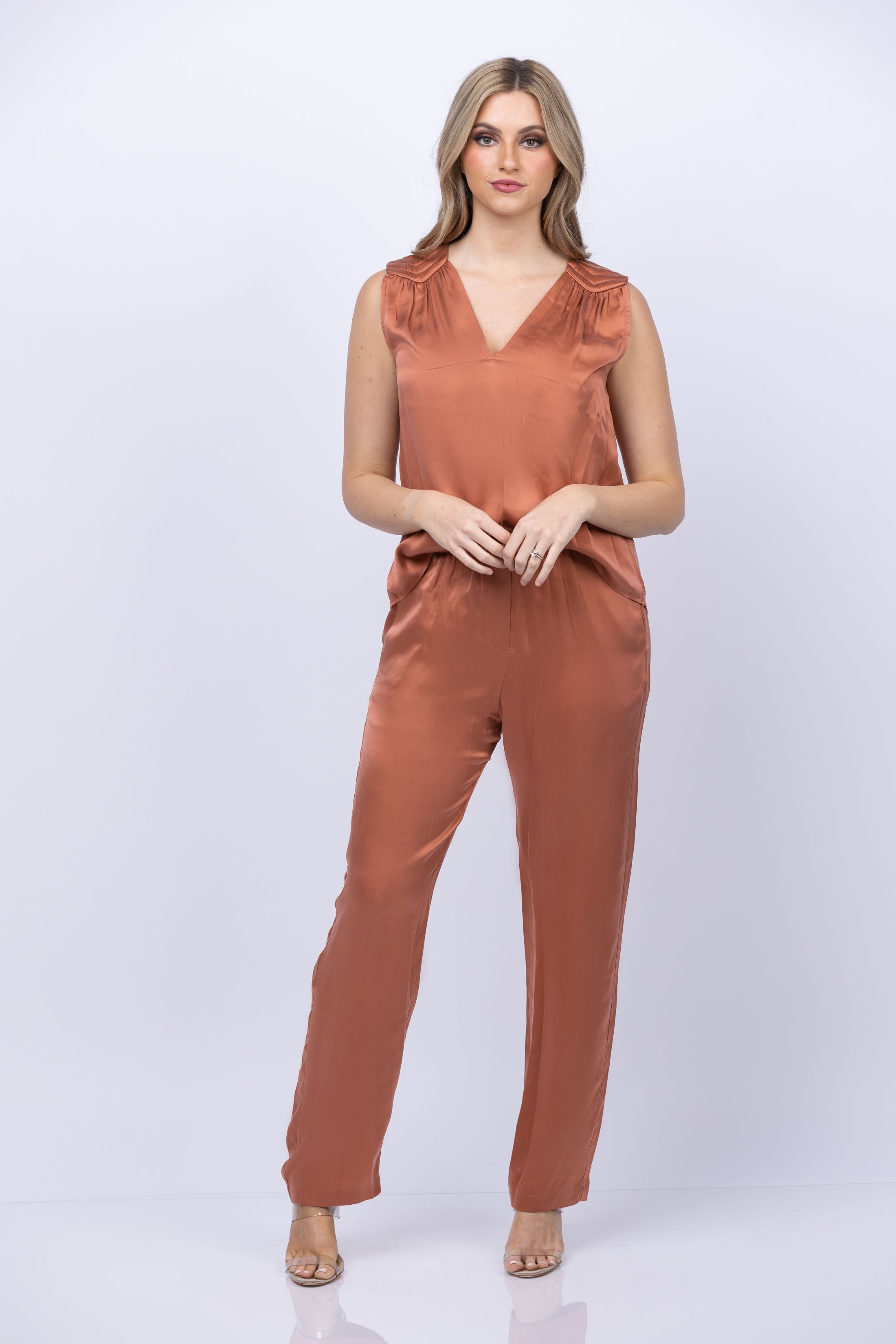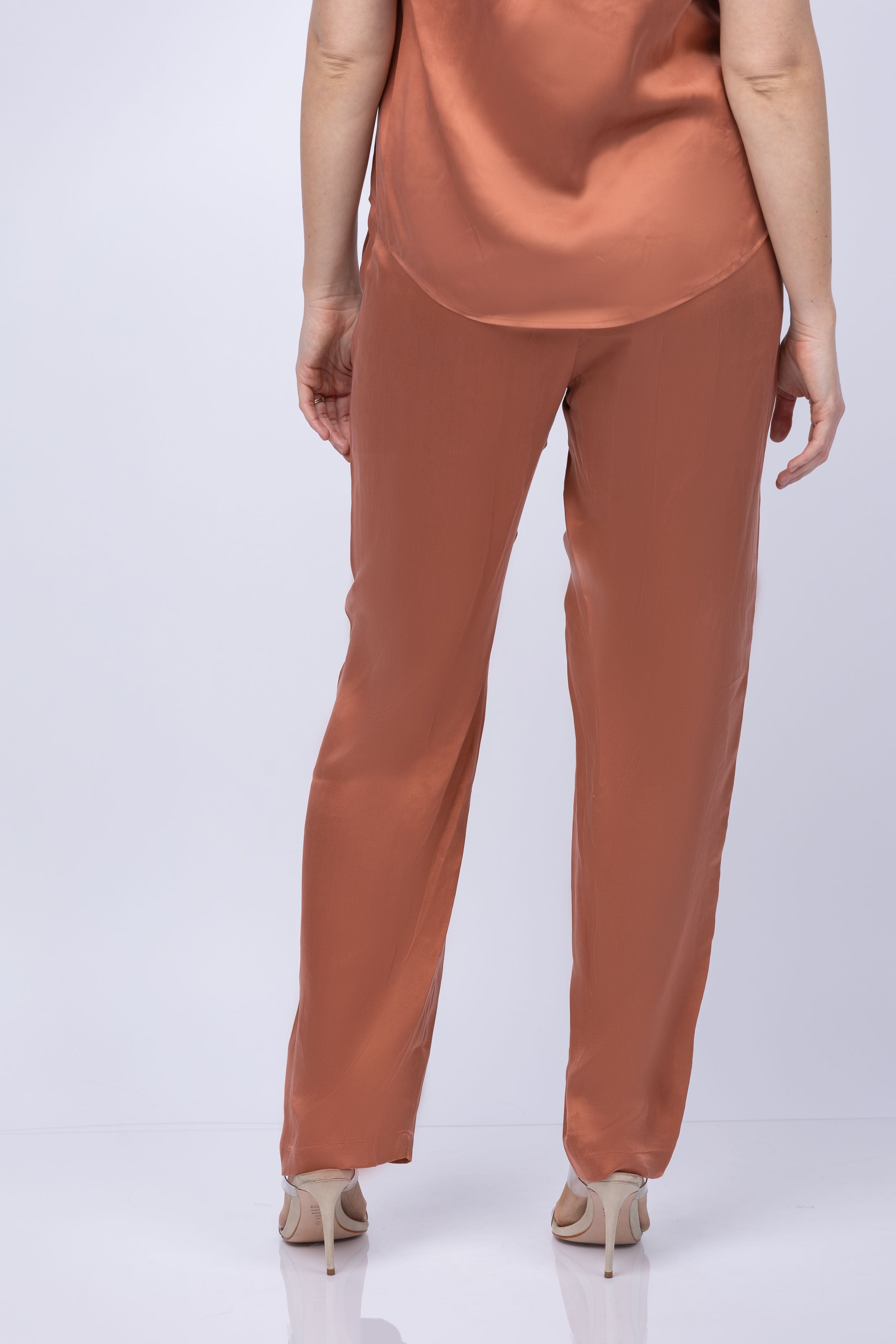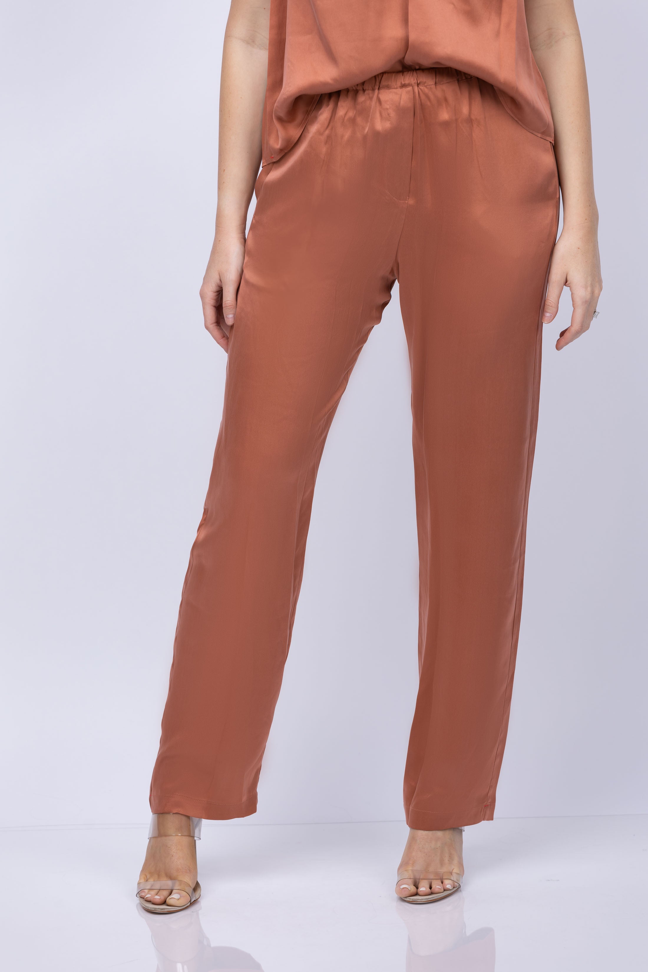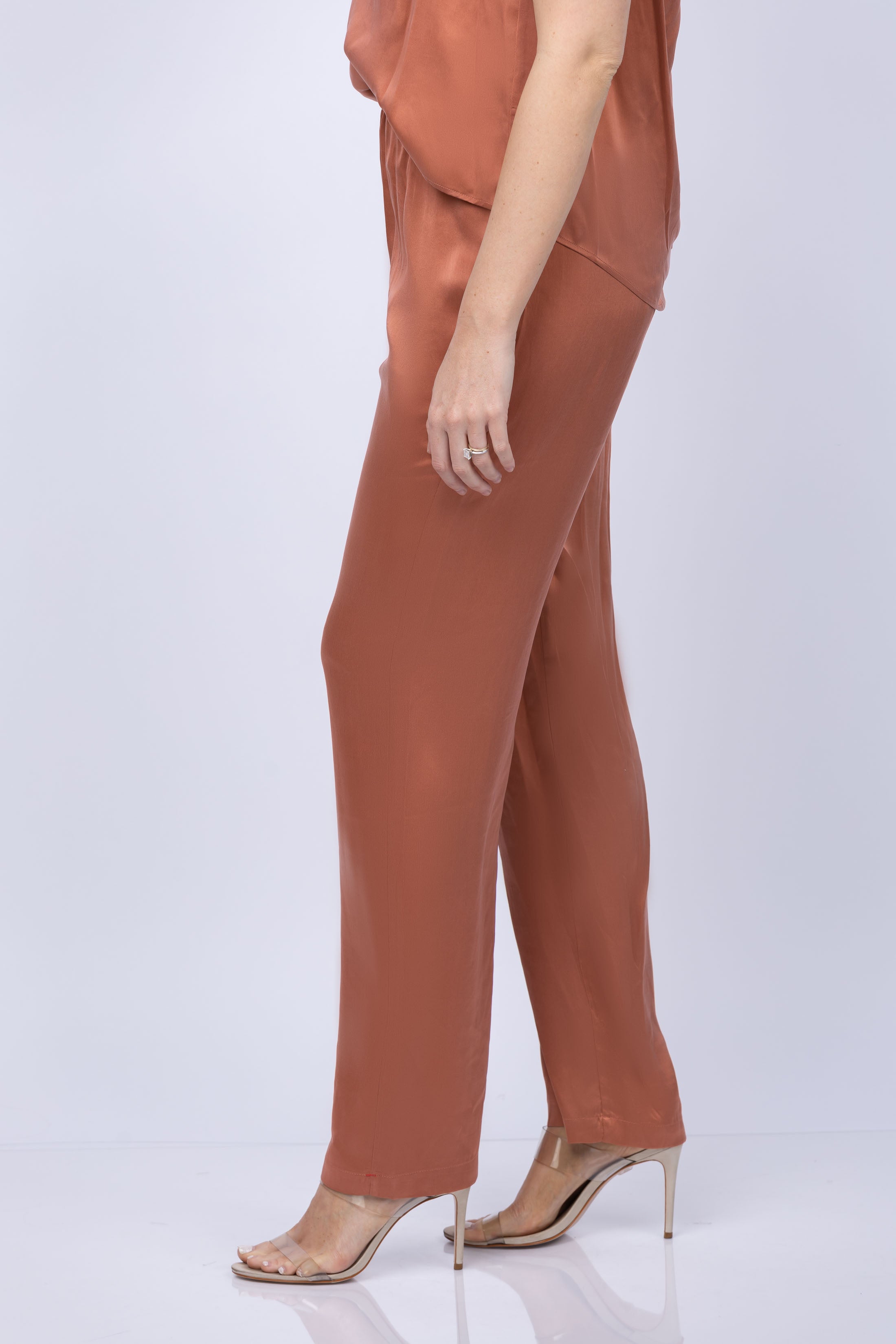 Let Wells be your secret weapon! This soft, luxe charmeuse pant with an elasticized waist and side seam pockets is perfect for any occasion. Hidden gems await you in Copper Opal! Find your comfort and chic style now.