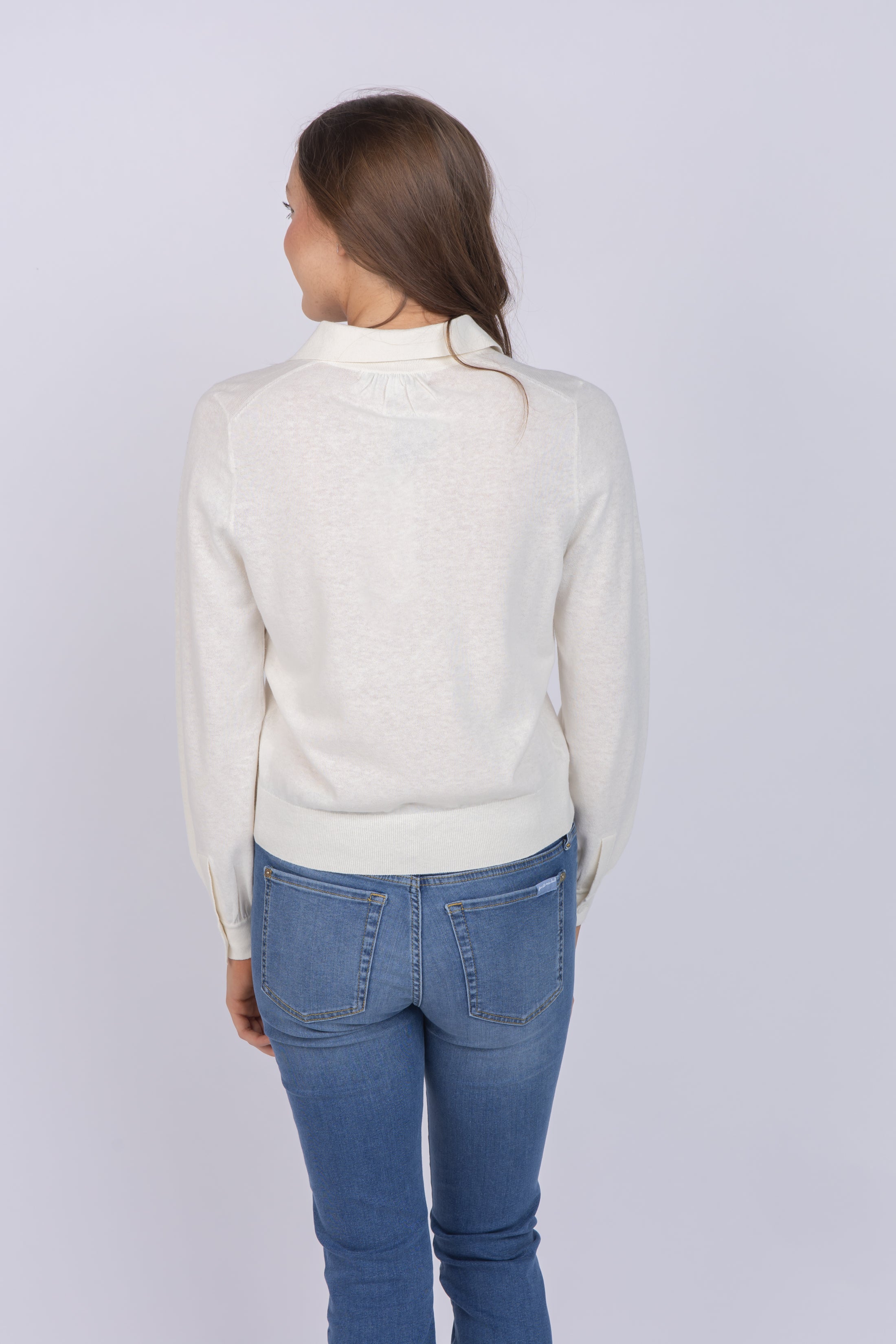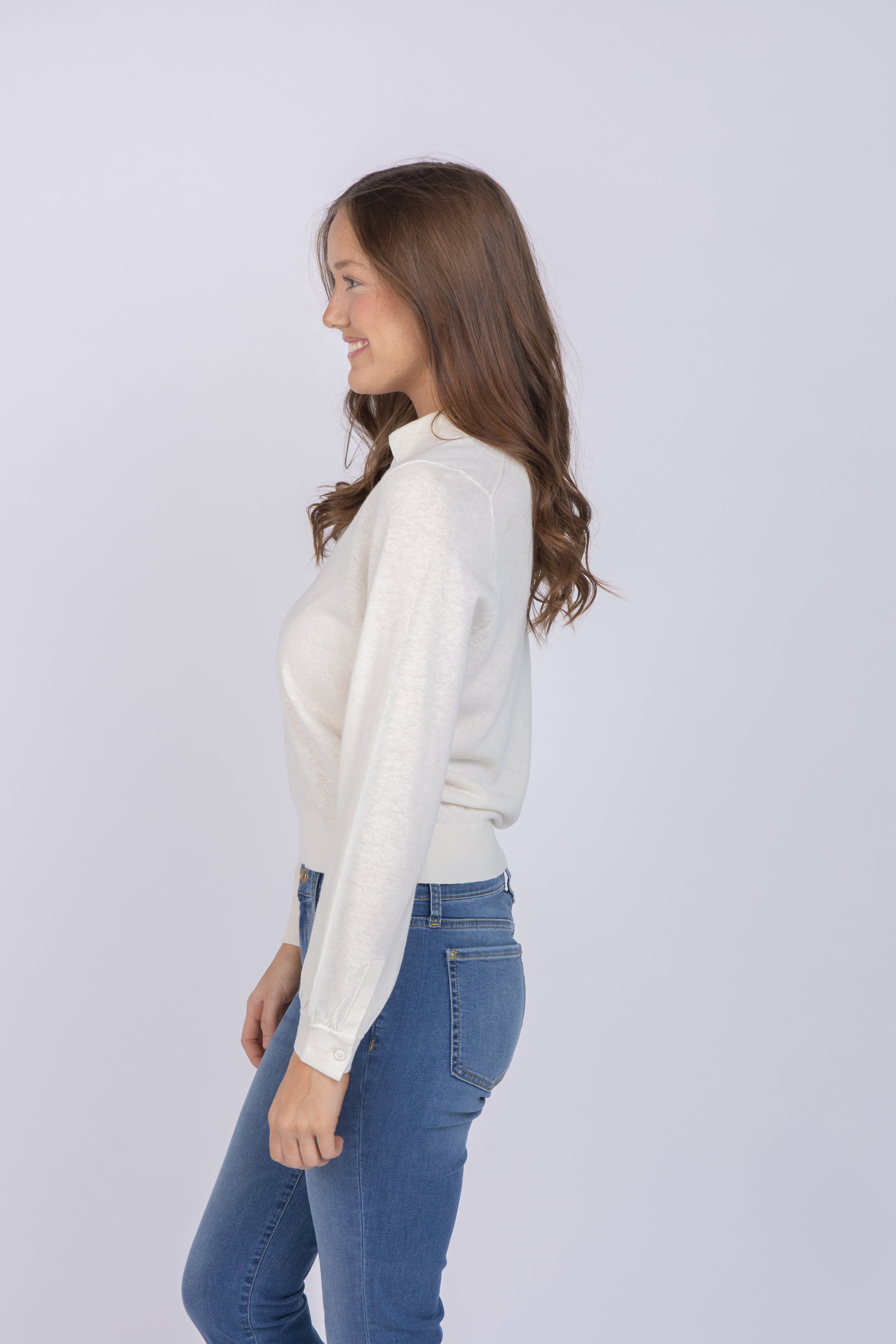 This sweater combines Supima cotton and organic hemp with a touch of nylon to create a cool-handed knit that’s both soft and breathable. The classic polo neckline lends a preppy feel, while blouson sleeves add a touch of romance. The light and gauzy handle makes this style the perfect choice for transitioning from midday walks under the sun to cold nights along the seaside.