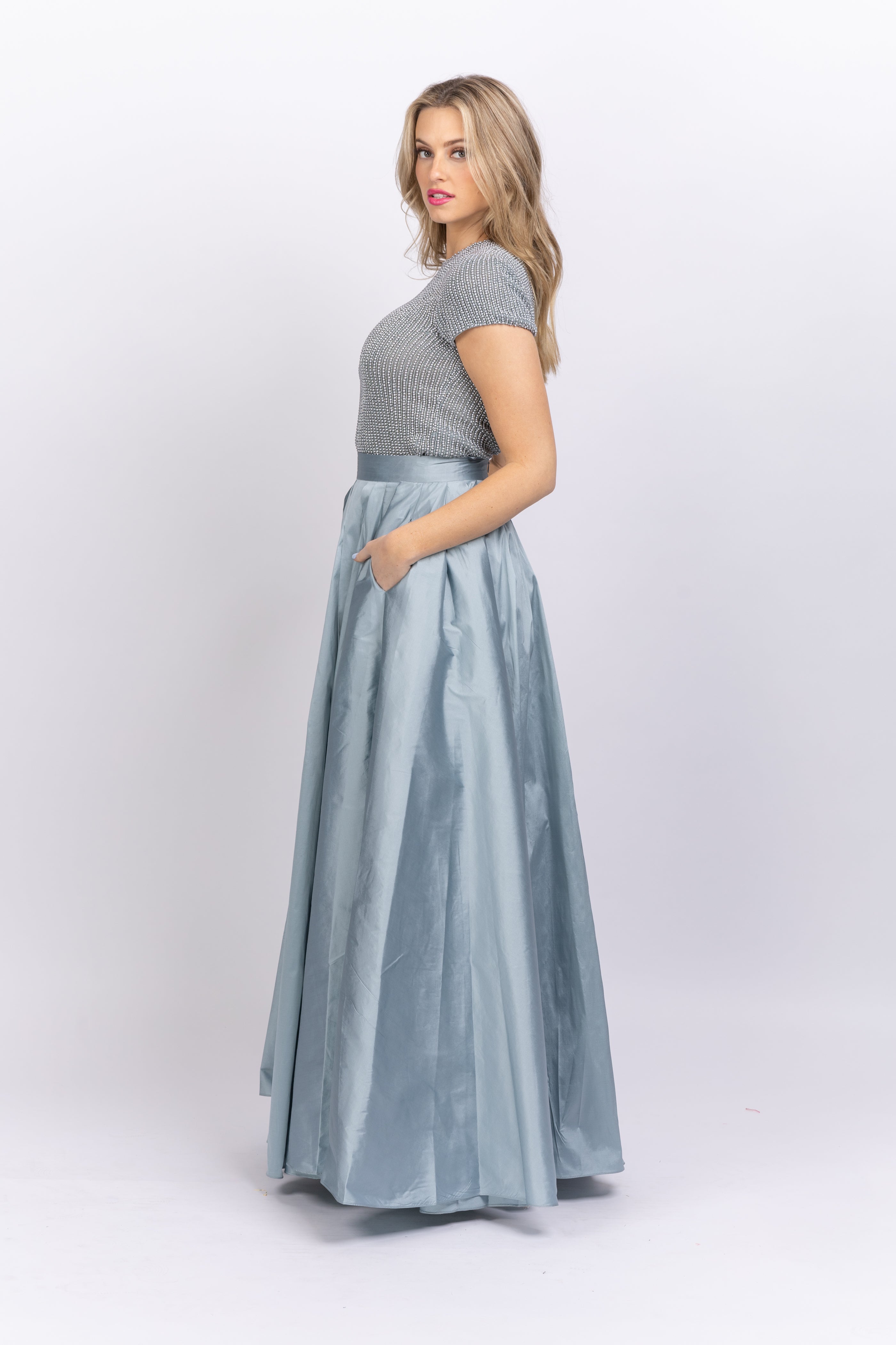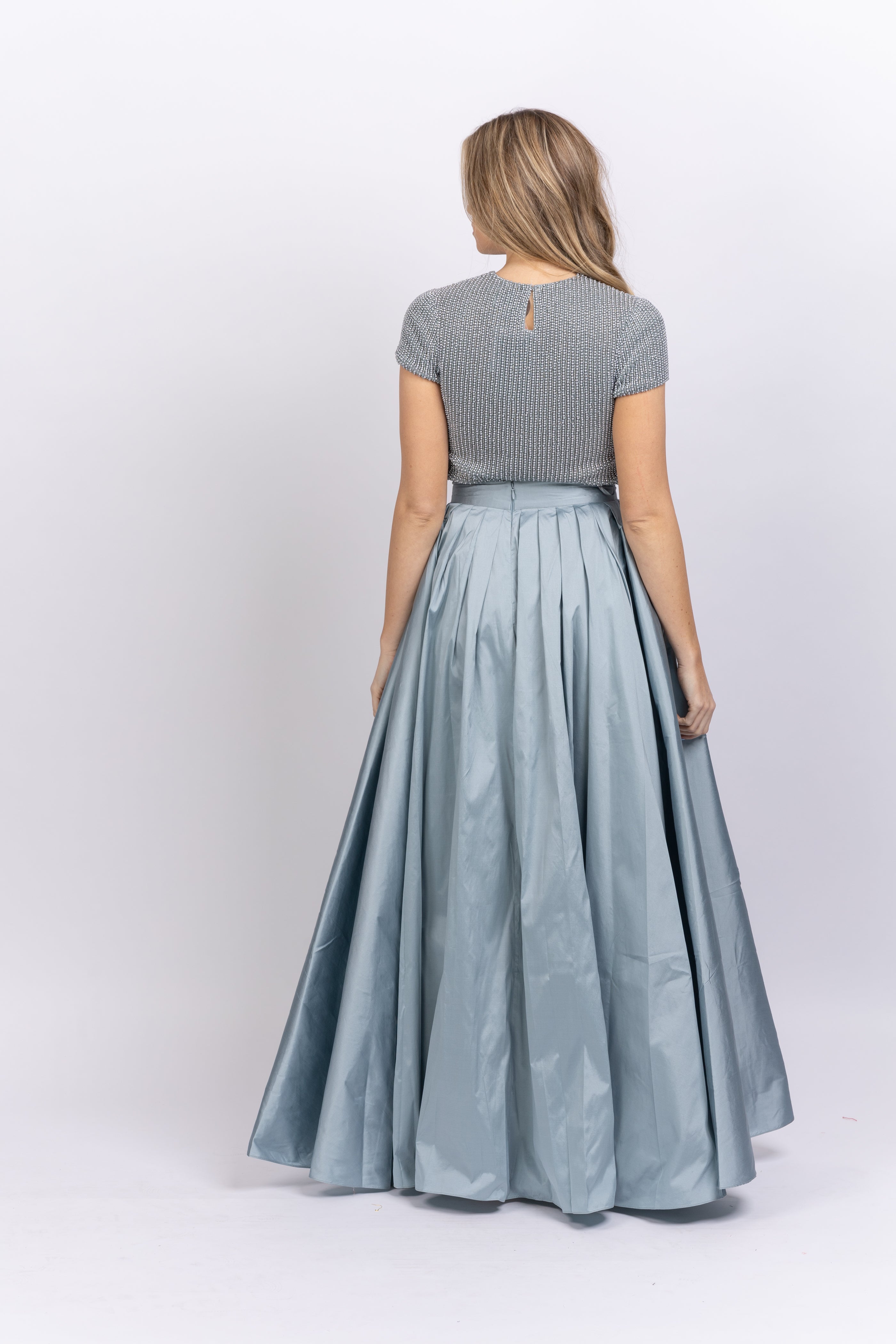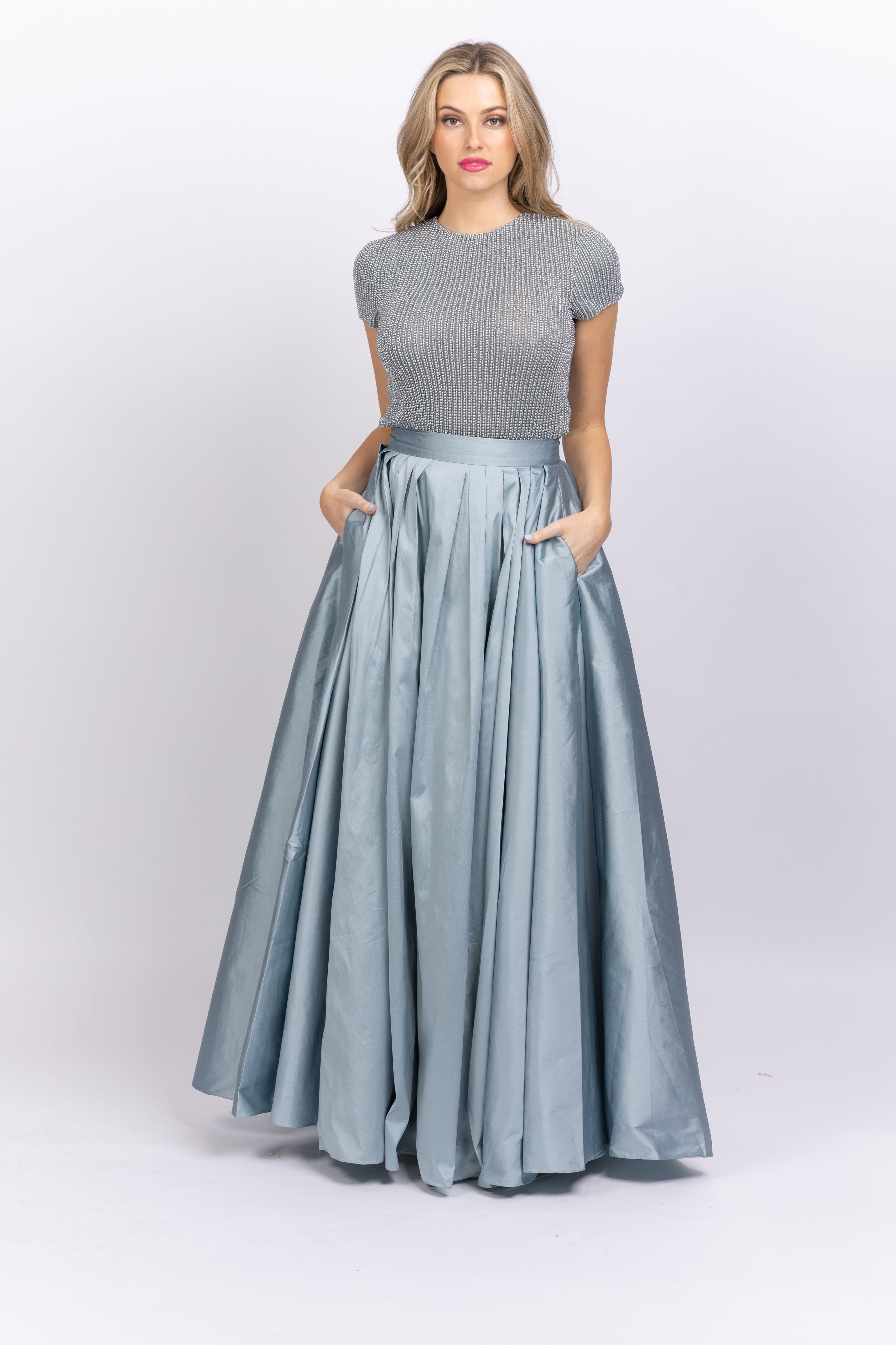 Your favorite short sleeve top is encrusted in tiny pearls. Wear with a taffeta skirts or to a special event or a pair of jeans for a fancy brunch or dinner out.