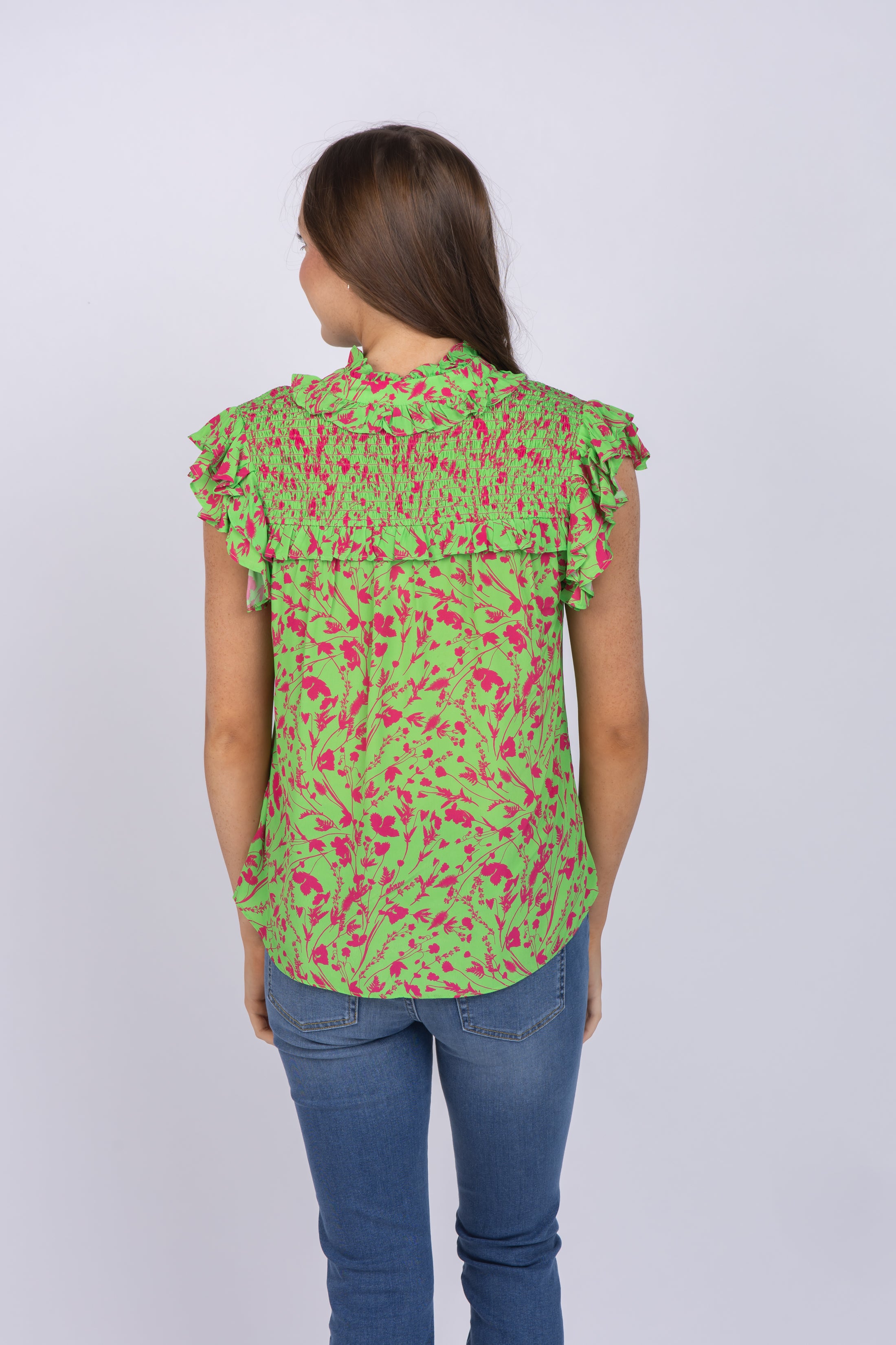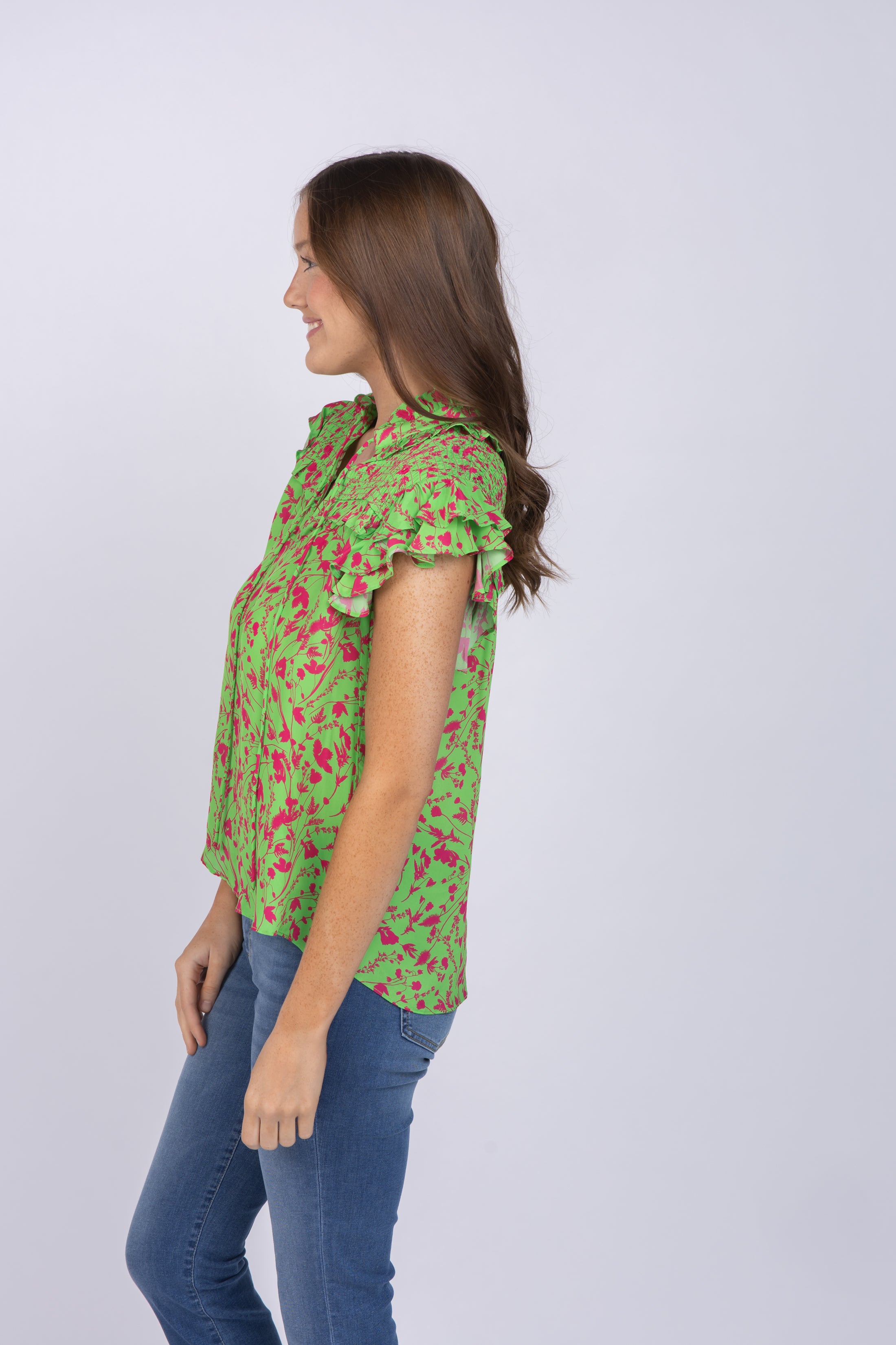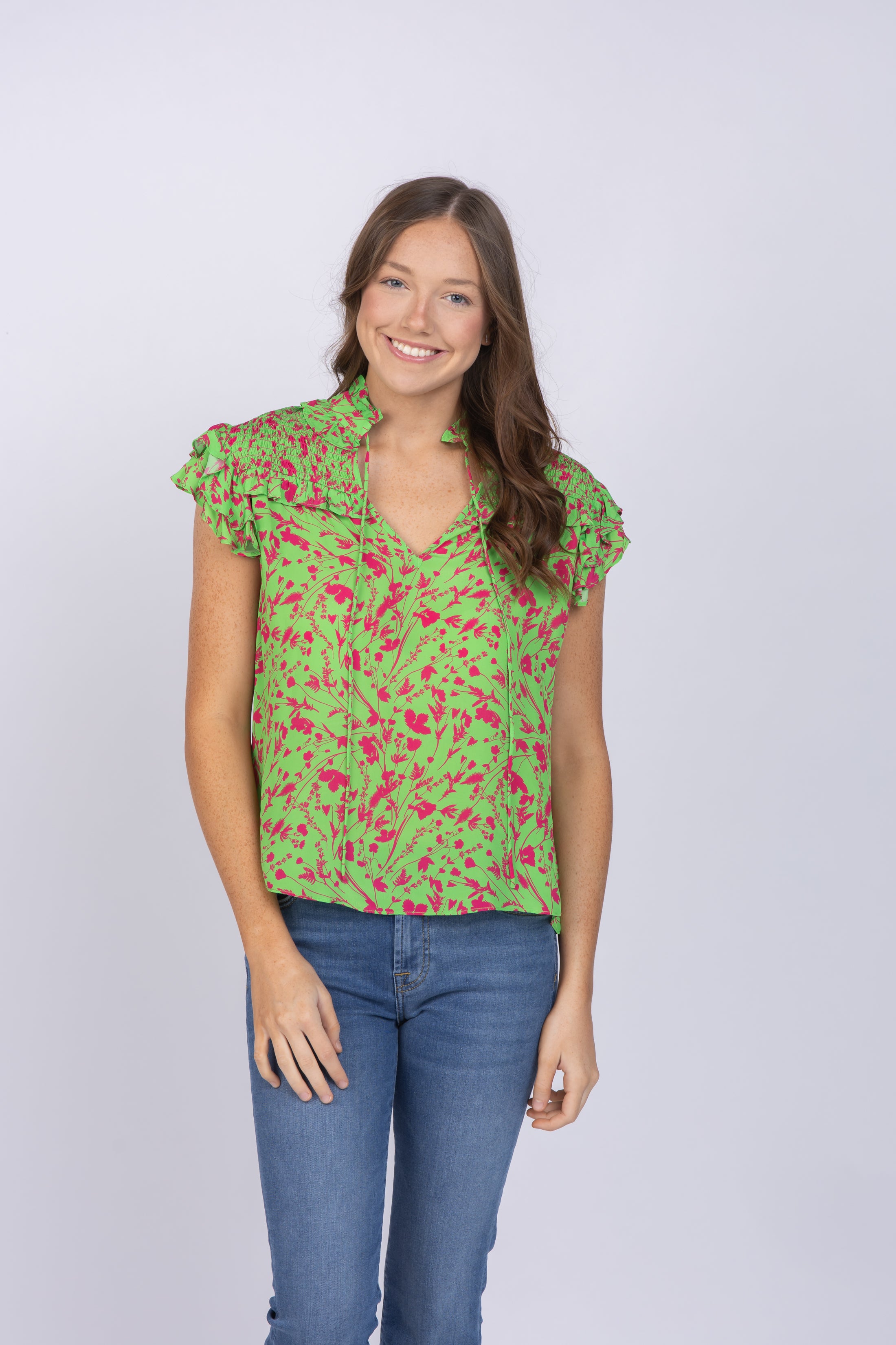 Featuring a floral pattern, the Gilner Farrar Sienna Blouse is complete with smocked details along the front and back shoulders plus high open pleating framing the v-neckline with tie details. Crafted from 100% lightweight viscose, this blouse boasts fluttery ruffle sleeves for a romantic finish.