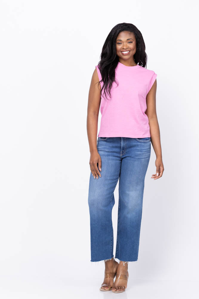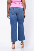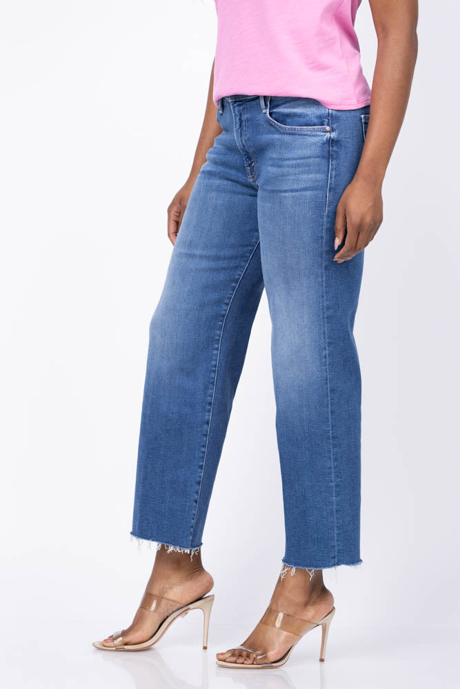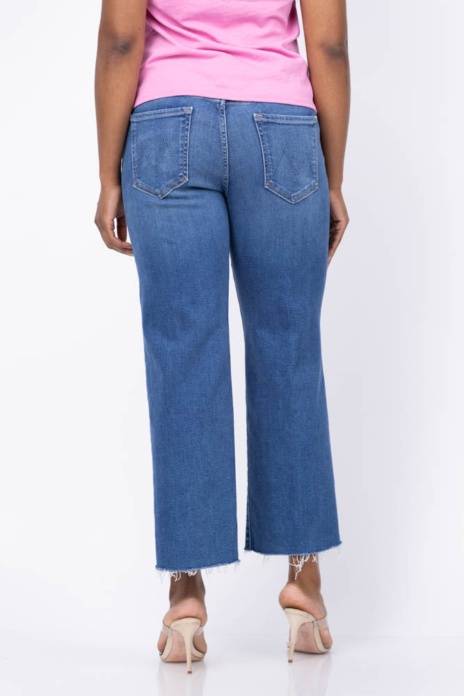 Experience effortless style with the Mother Denim Mid Rise Rambler Zip Ankle Fray Jean in Dugout Doobies. These mid-rise jeans feature a wide straight leg and a zip fly for a comfortable, secure fit. Made from stretch denim, they offer flexibility and ease of movement. The mid-blue wash is beautifully accented with whiskering and fading at the knees, while the frayed ankle-length inseam adds a trendy, laid-back touch. Perfect for casual days, these jeans blend comfort and fashion seamlessly.