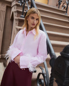 Meet the Largaux Feather Top—where classic meets whimsical! Crafted from crisp cotton shirting, this collared button-up reimagines the timeless shirt with a playful feathered twist. The slightly cropped silhouette flatters your frame, while built-in sleeve loops let you style the sleeves exactly how you want them. But here's where it gets fun: delicate feathered cuffs add an unexpected pop of personality that'll have everyone asking where you got it. Feminine, flirty, and undeniably chic.