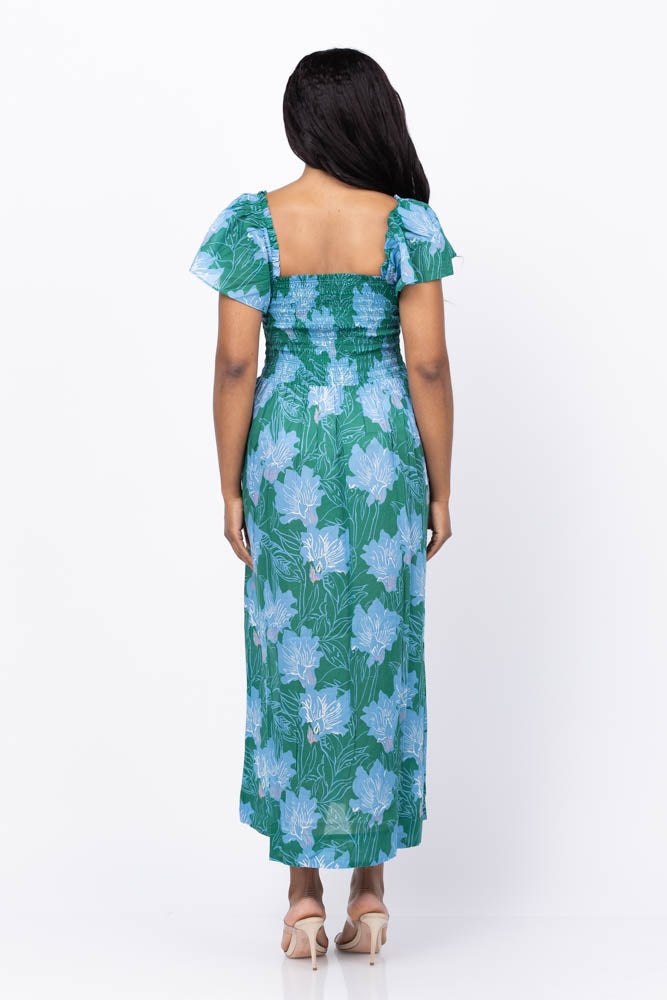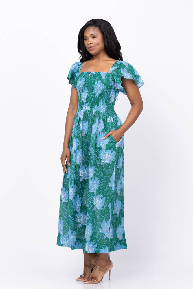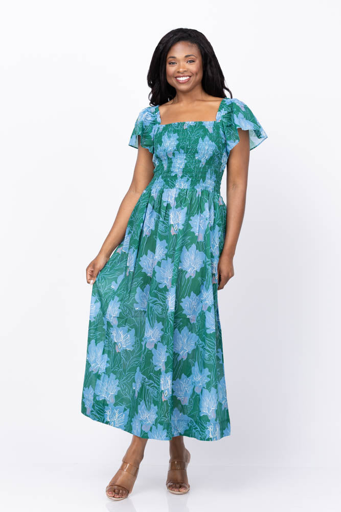 The Trovata Esme Dress in Blue Orchid features a flattering smocked bodice and delicate ruffle-trimmed neckline that elongates your silhouette with ease. Soft flutter sleeves offer graceful shoulder coverage, while hidden side seam pockets add practical charm. Crafted from lightweight cotton voile, this maxi dress combines comfort and style for effortless elegance.