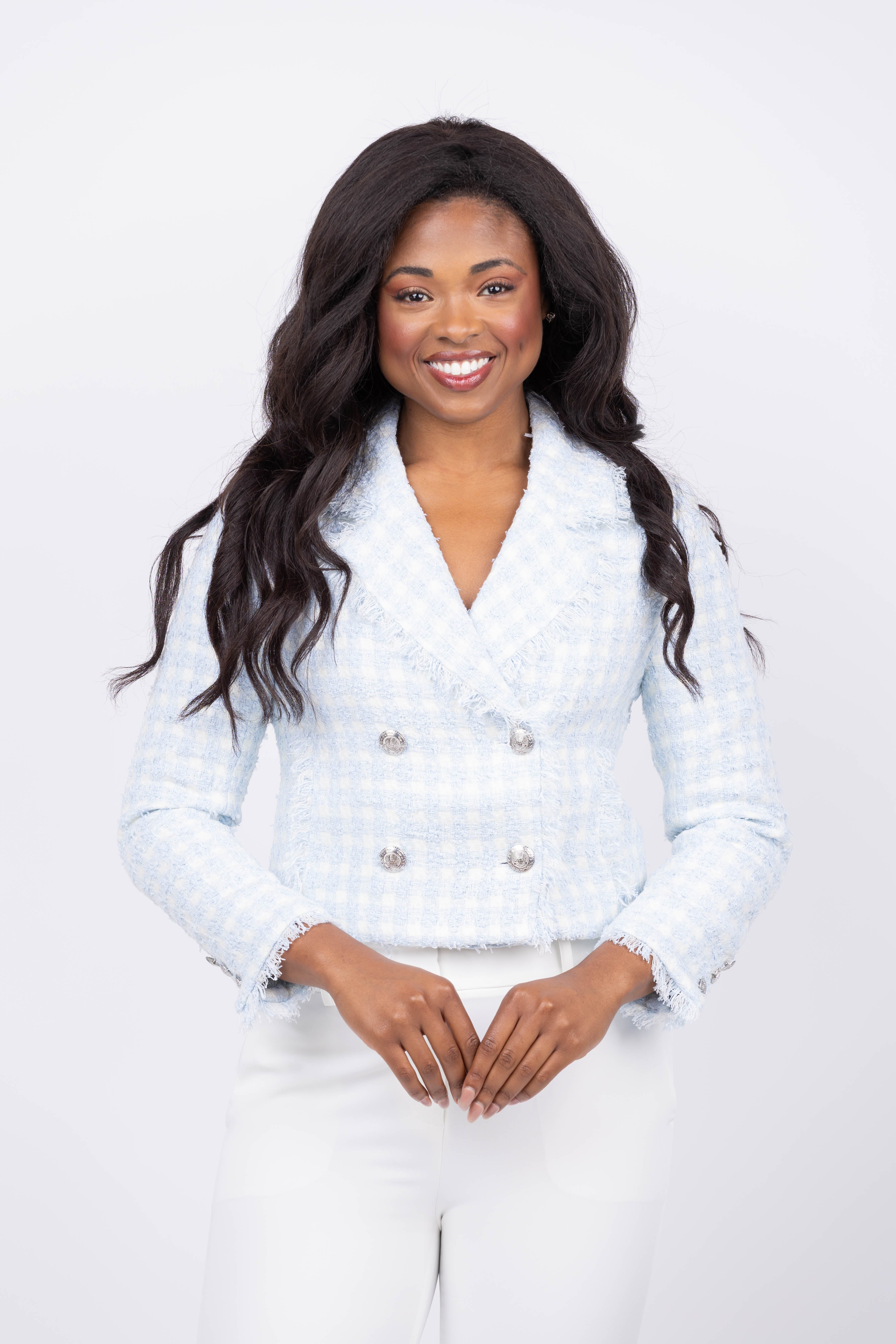 Elevate your wardrobe with the Tyler Boe Leah Boucle Jacket in Above the Clouds. Its luxurious tweed texture and modern cropped silhouette offer timeless sophistication. Featuring a classic double-breasted front with decorative buttons, notched lapel, and practical flap pockets, this jacket seamlessly blends style with function. Subtle fringe trim on the hem, cuffs, and collar adds a refined touch, making it perfect for pairing with the Ashley Bouclé Skirt to complete your elegant ensemble.