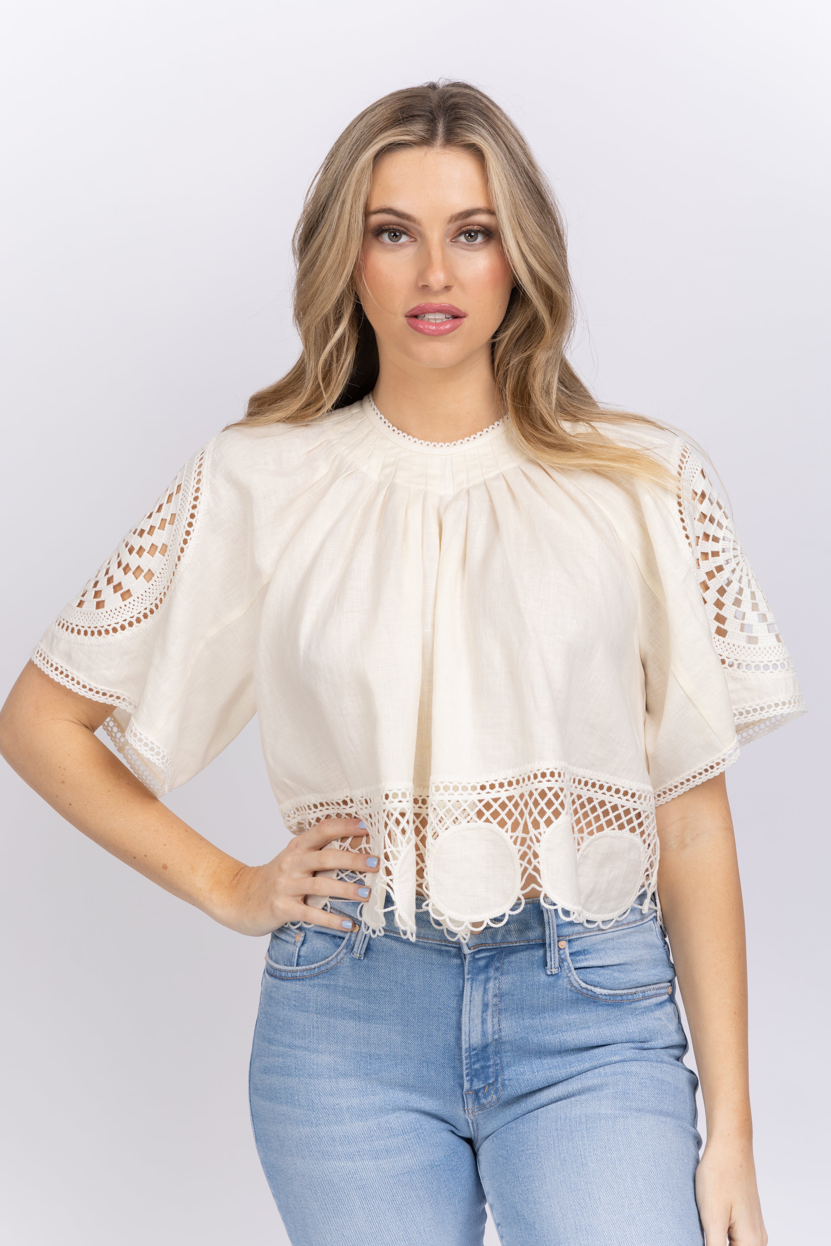 The Cymbeline Top features a sweet silhouette adorned with embroidered floral and geometric shapes inspired by antique linens. Crochet mesh is hand-stitched to soft linen, while each motif is strategically placed to emphasize the delicate juxtaposition between openness and opacity of the fabrication. This short, yellow bell-sleeve blouse has an airy shape and is finished with a pleated neckline and center back button closure. Length is 21 inches from highest point on shoulder.