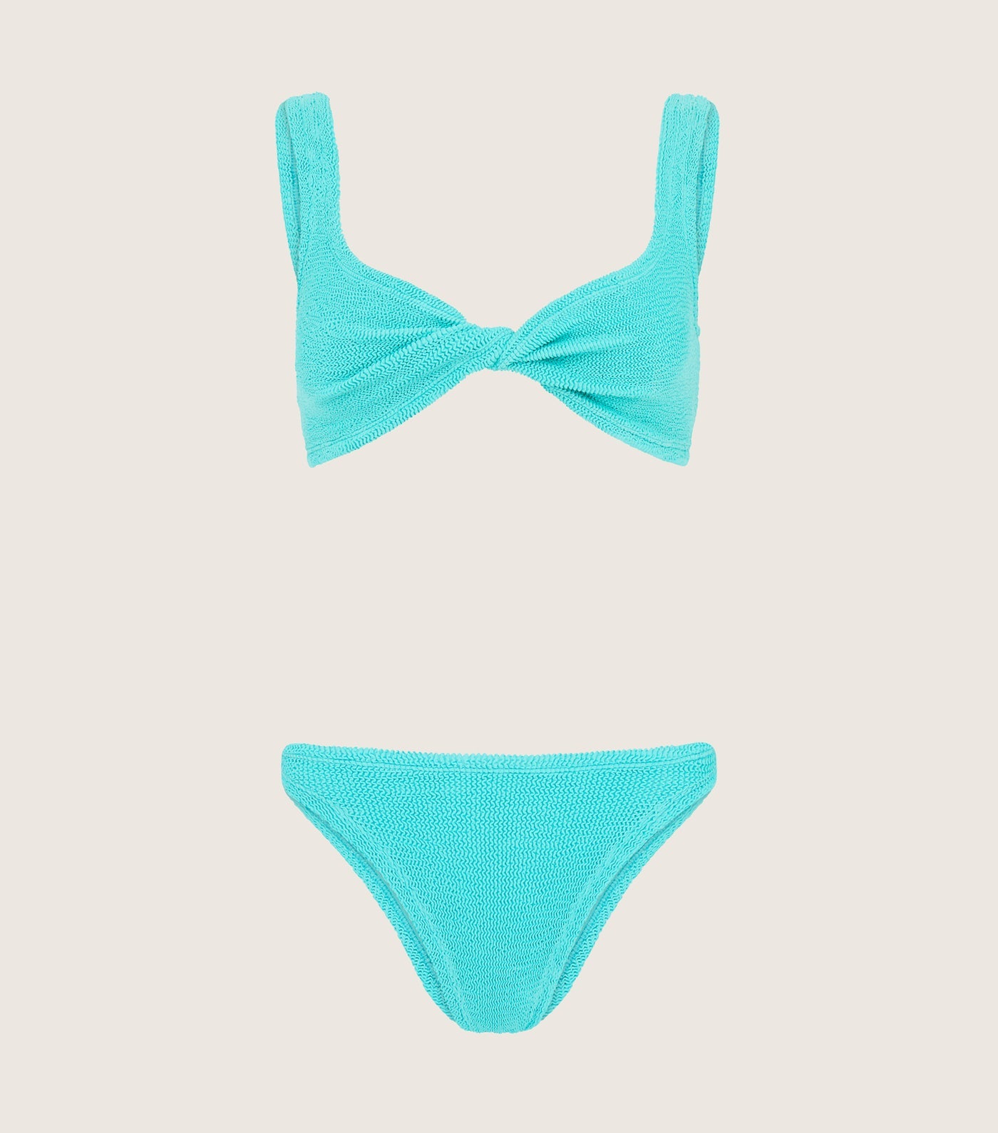 Unleash your inner goddess with the Hunza G Juno Crinkle Bikini in Aqua. This stunning bikini combines support and style with its twist detail top and versatile bikini bottoms. Easily adjust the coverage by wearing the bottoms high or low on the hip. Plus, the lighter colors add a touch of elegance, but be warned - they may appear translucent when wet. And don't forget, the neon colors may fade over time, but that just adds to the unique charm of this must-have bikini!