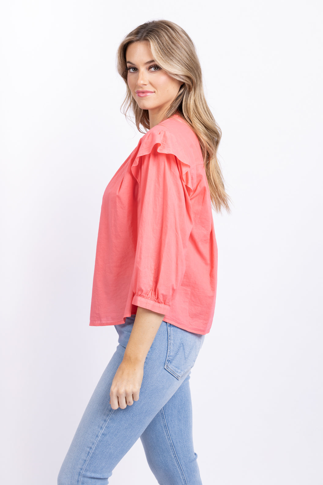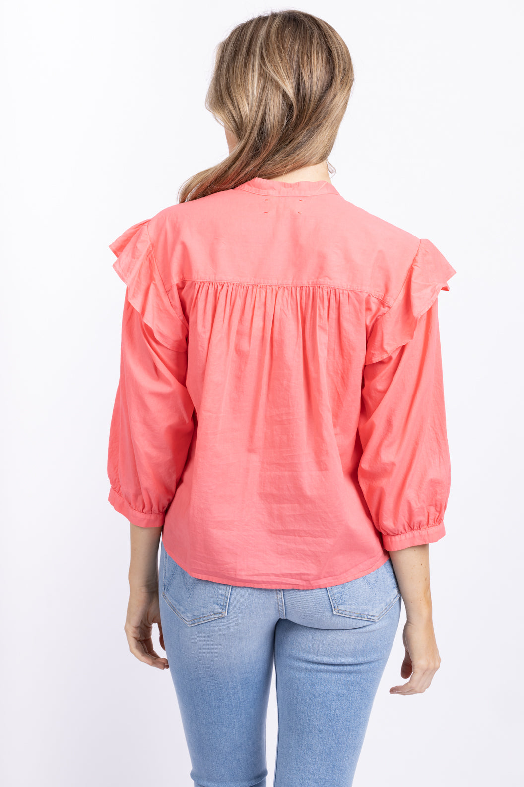 The Aria top is made in Xirena's classic lightweight woven cotton poplin for a lived-in look and feel. This easy pullover top has a V-neck, ruffle blouson sleeves, back yoke, shirring throughout, and a shirttail hem.
