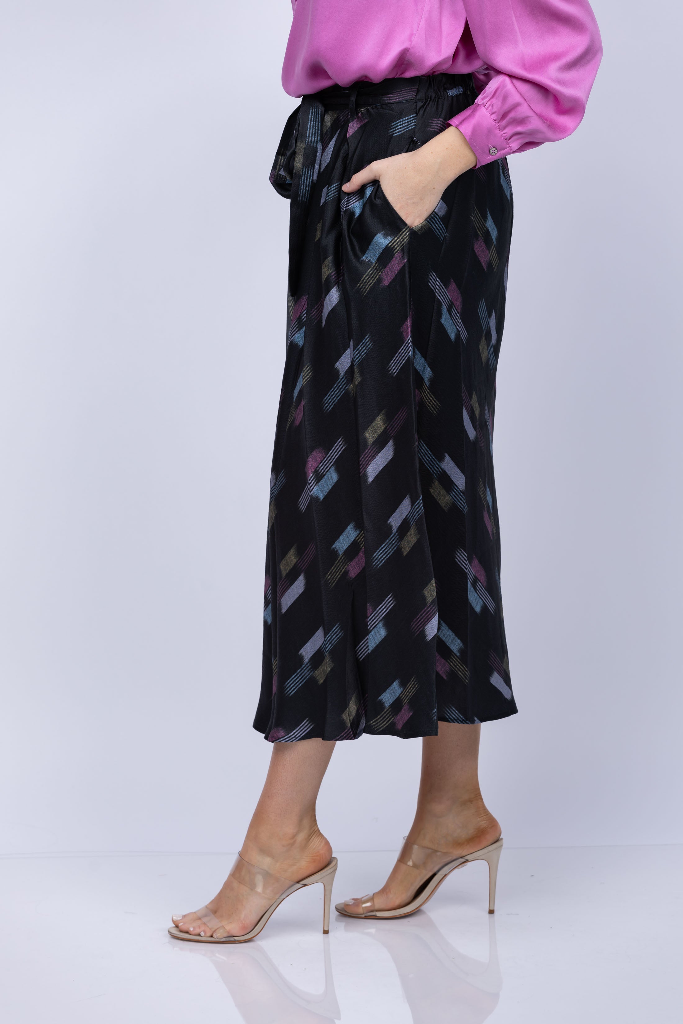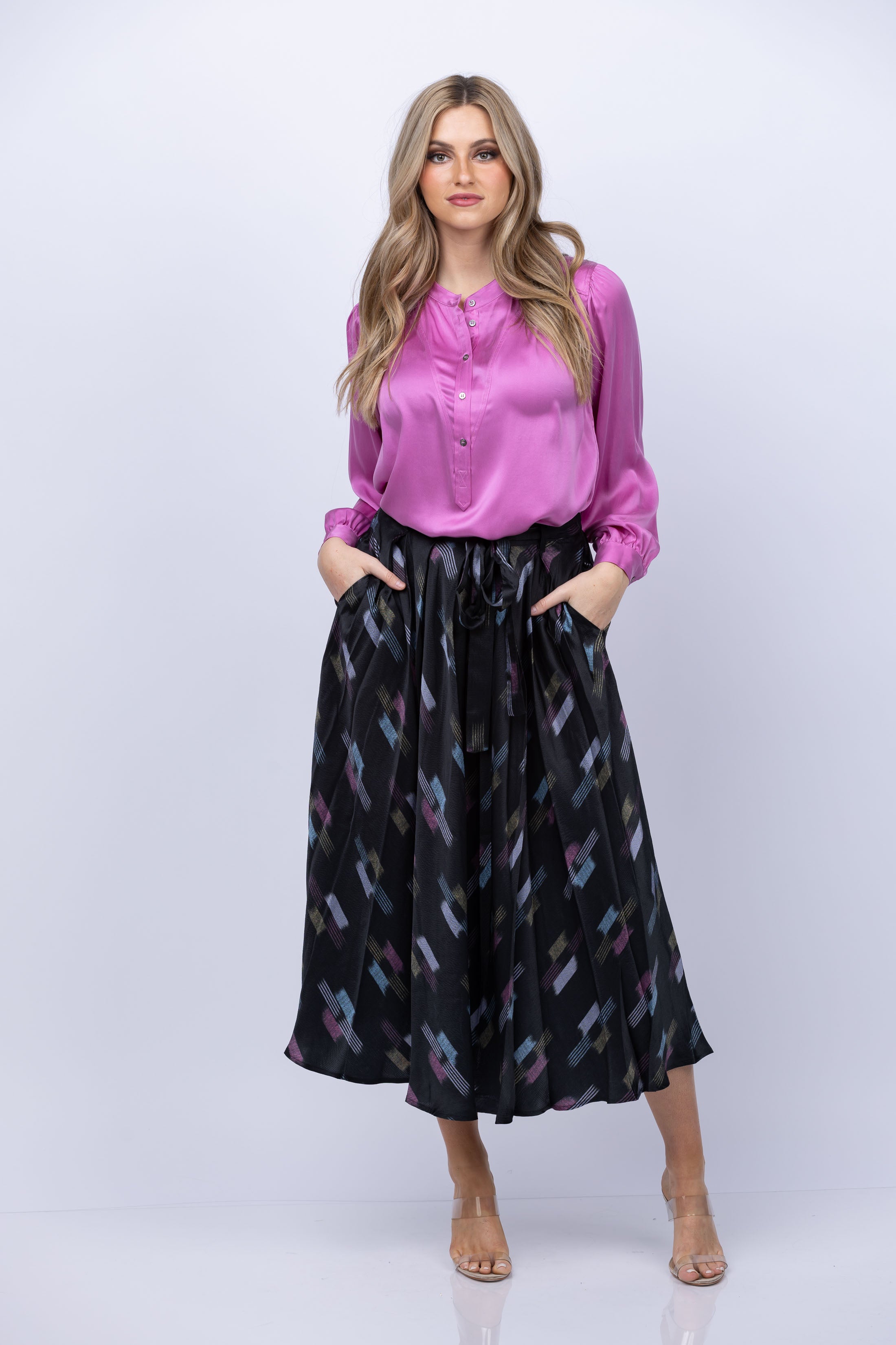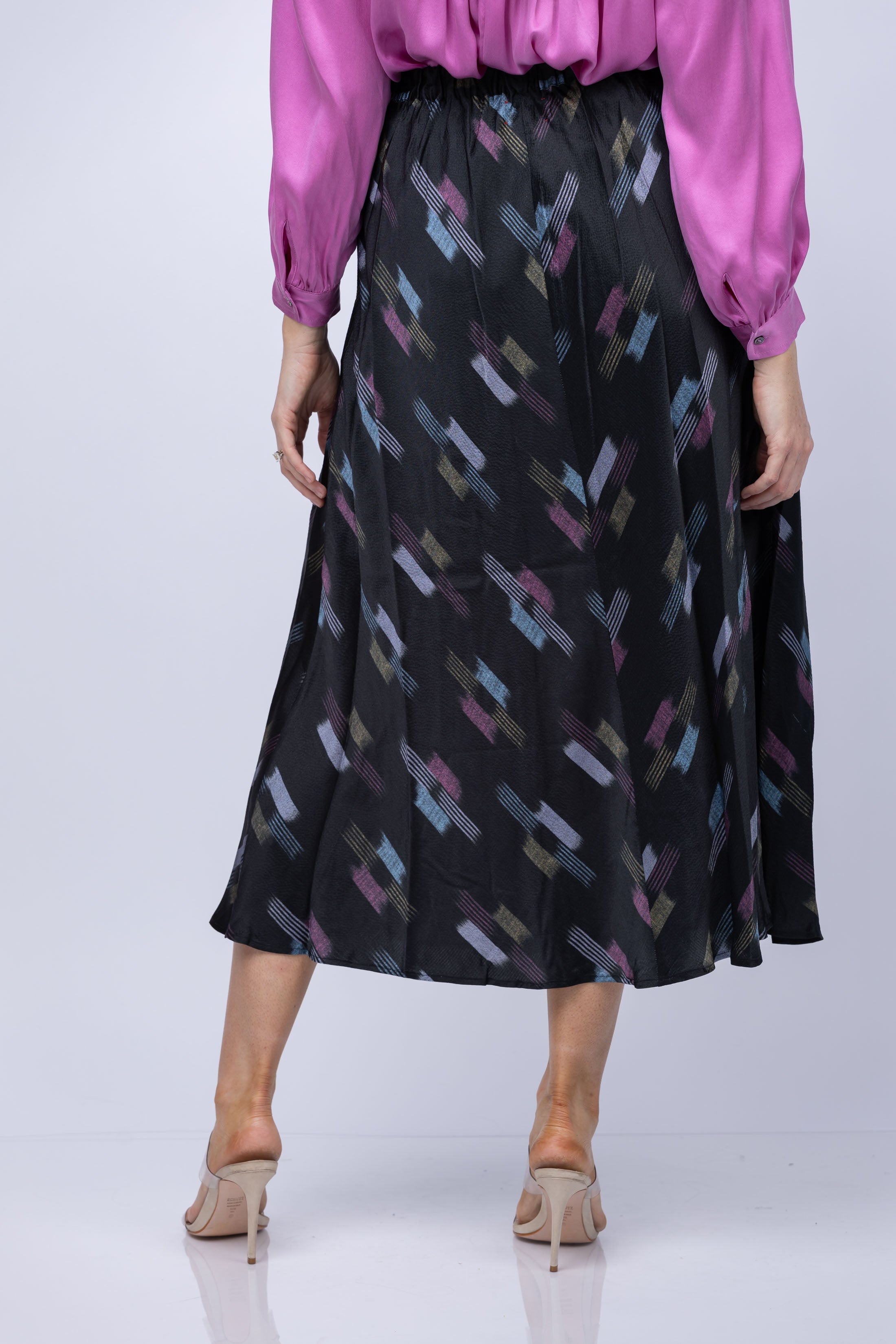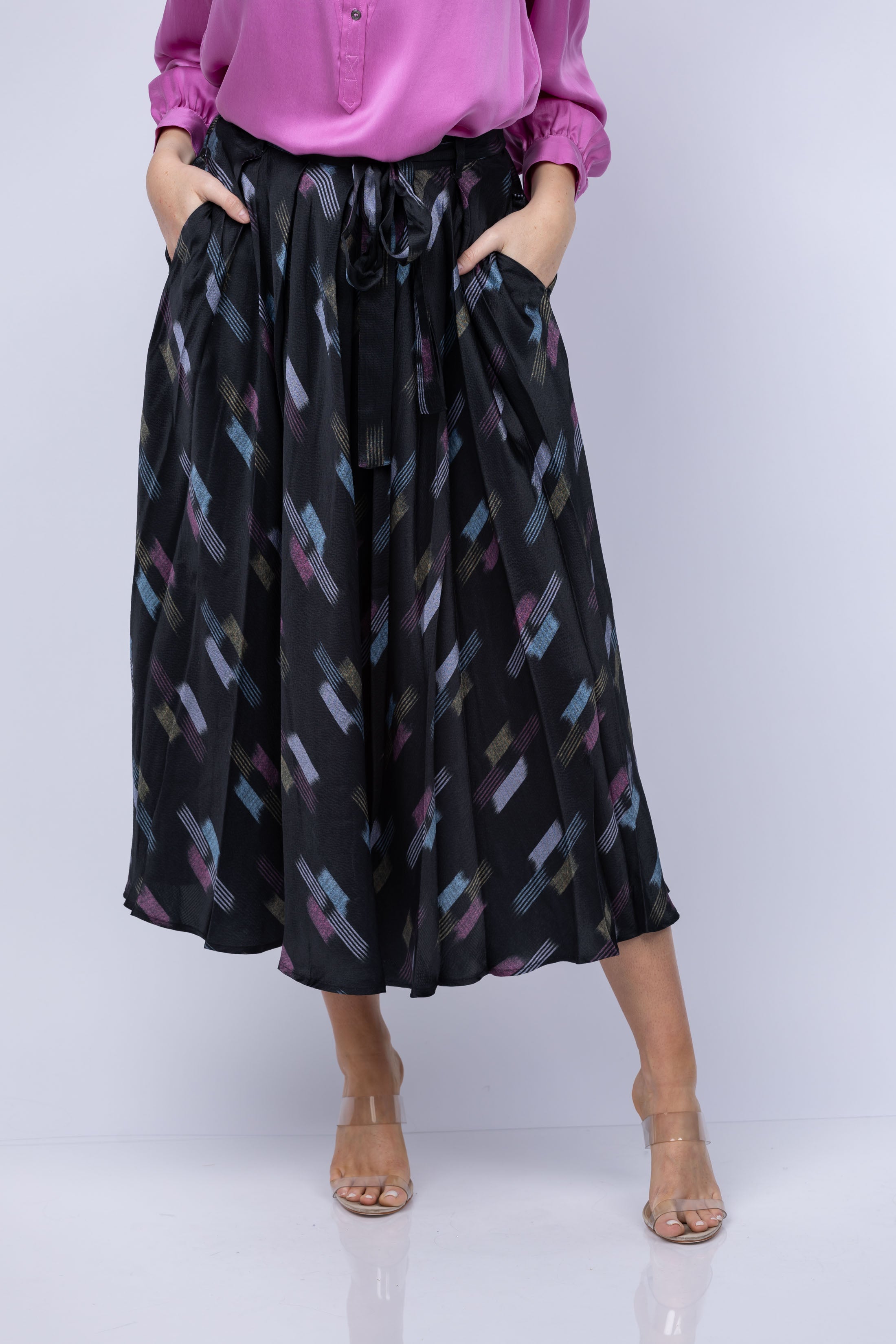 Discover the perfect balance of luxury and style with the XiRENA Bella Skirt in Black Ikat. This chic midi skirt is crafted from luxe hammered silk, featuring an A-line cut, self-tie waist, released box pleats, elastic at the back, and two side seam pockets. Flaunt your figure and make a lasting impression in this timeless design.