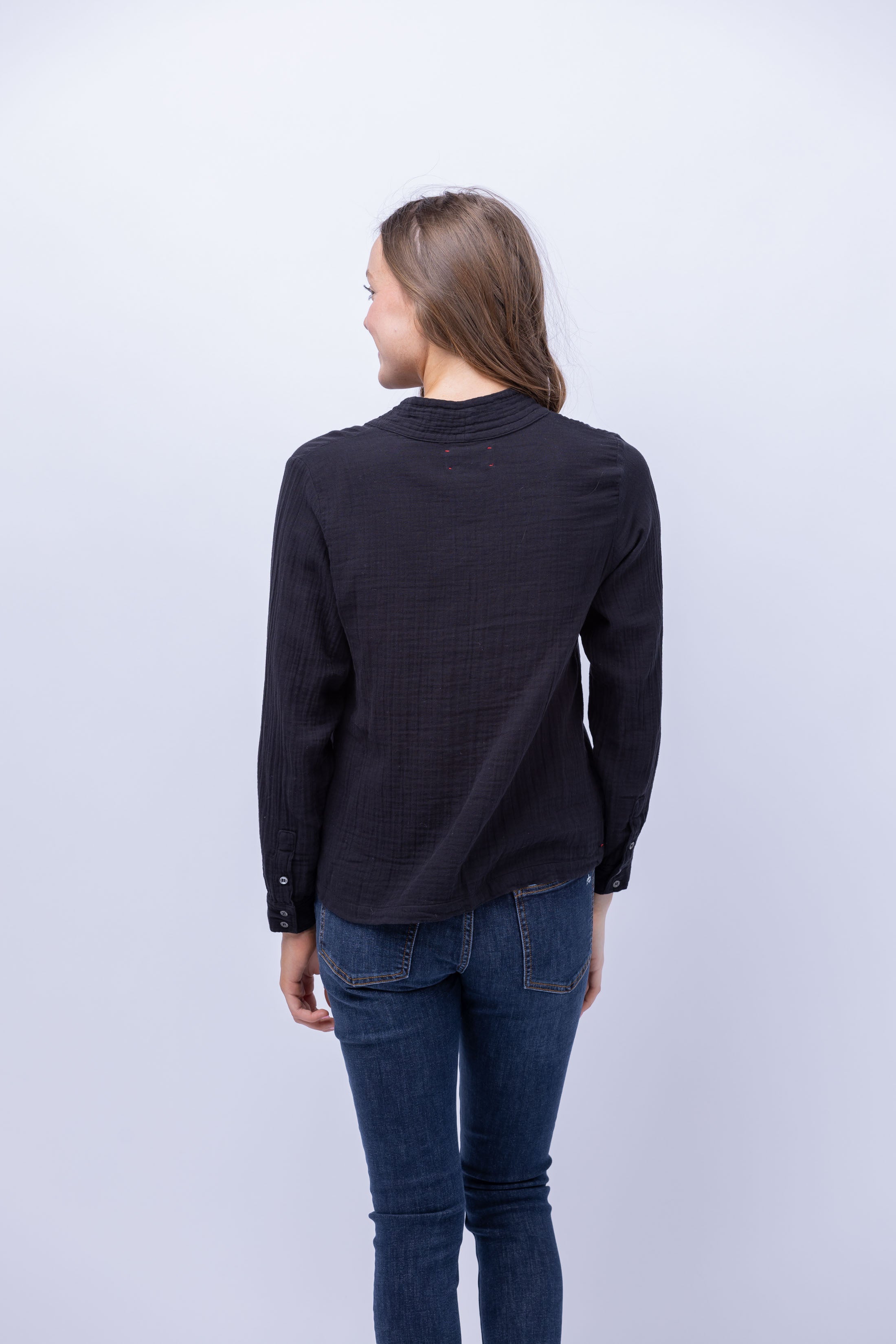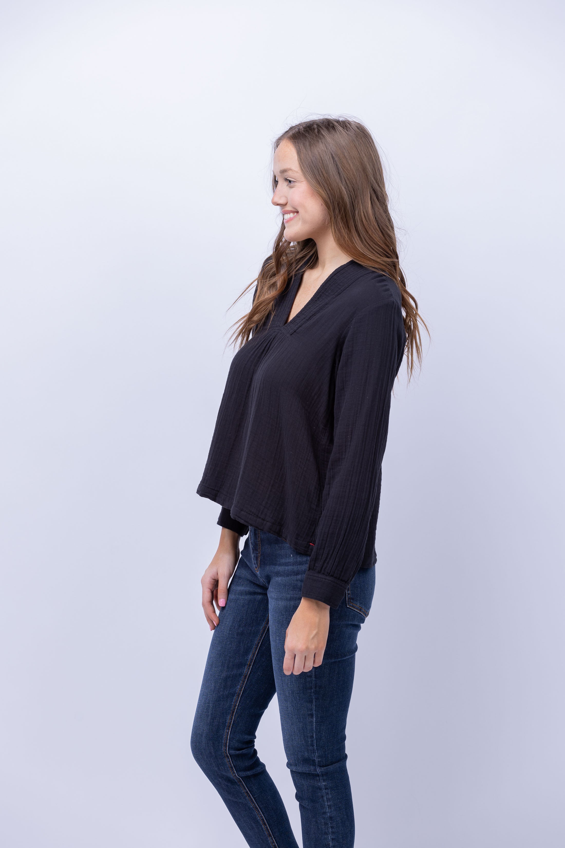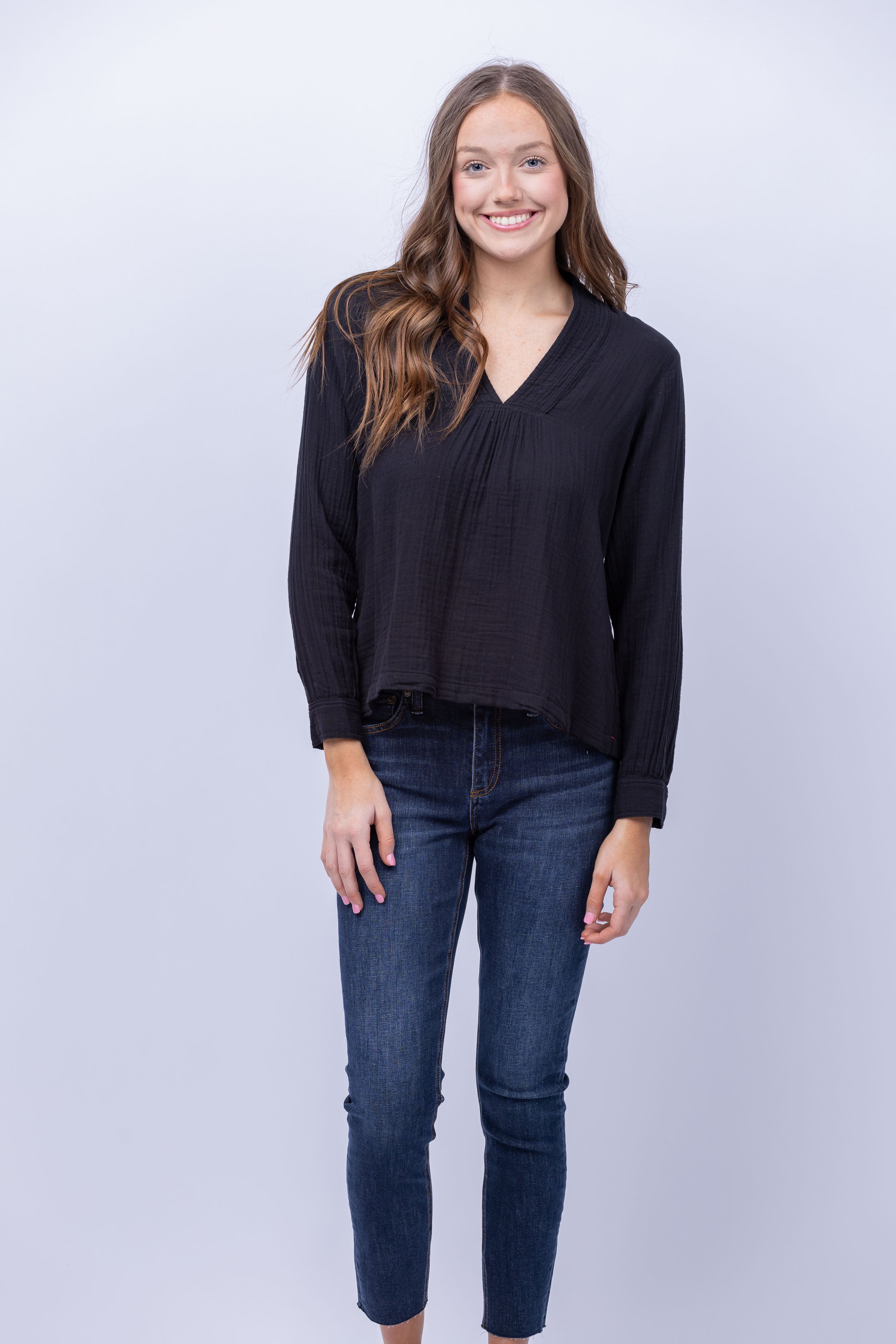 This Xirena Hutton Top in Black is the perfect combination of comfort and style. Made from washed double faced cotton gauze, it has a soft and gently crinkled feel. The easy popover design features a quilted V-neck with shirring and button cuffs, adding a touch of elegance to any outfit. Elevate your wardrobe with this versatile and chic top.