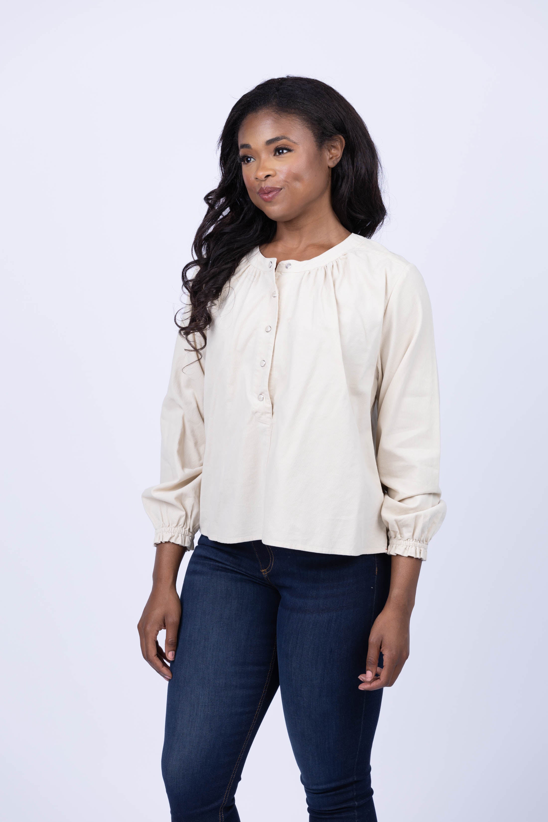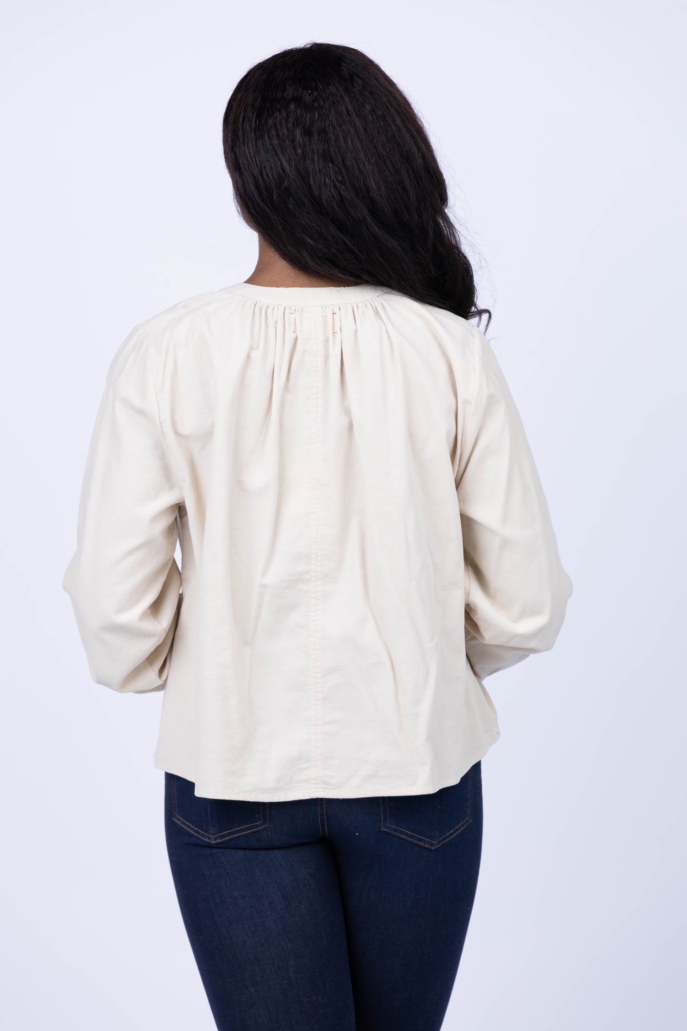 Feel ready for anything in the Leigh Top! Crafted from soft and supple baby corduroy, this gorgeous top features a henley cut with pearlized snap buttons, a shirred collar and ruffle cuffs for feminine flair. Make every day special in the Leigh Top.