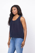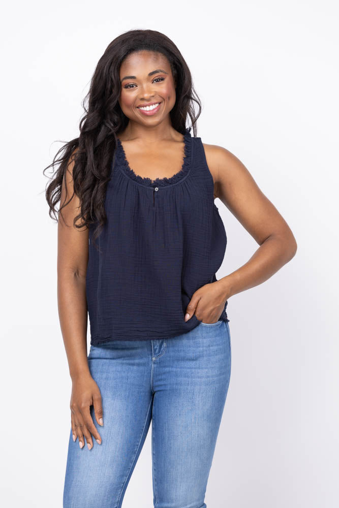 The XiRENA Rosie Top in North Star offers effortless style with its soft, washed double-faced cotton gauze fabric that feels light and breathable. Designed with a raw edge scoop neck, a delicate keyhole button-front, and flattering shirring throughout, this sleeveless top combines comfort and charm for your warm-weather wardrobe. Perfect for easy, breezy days, it adds a touch of relaxed sophistication to any outfit.
