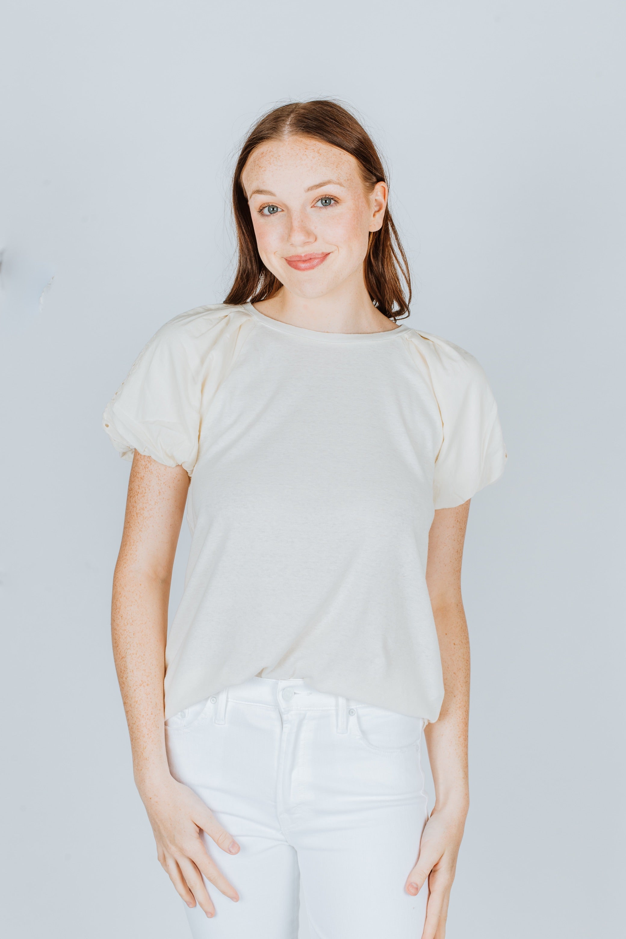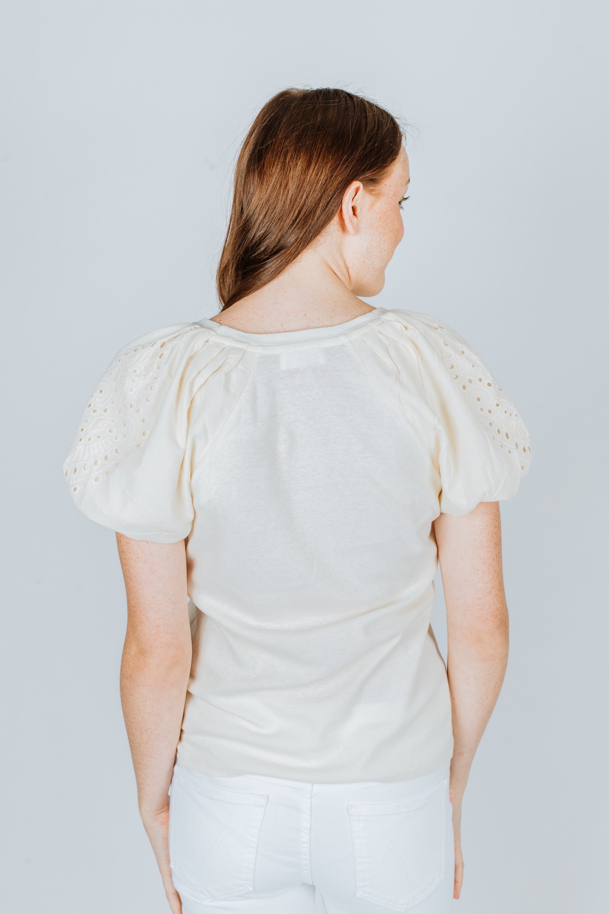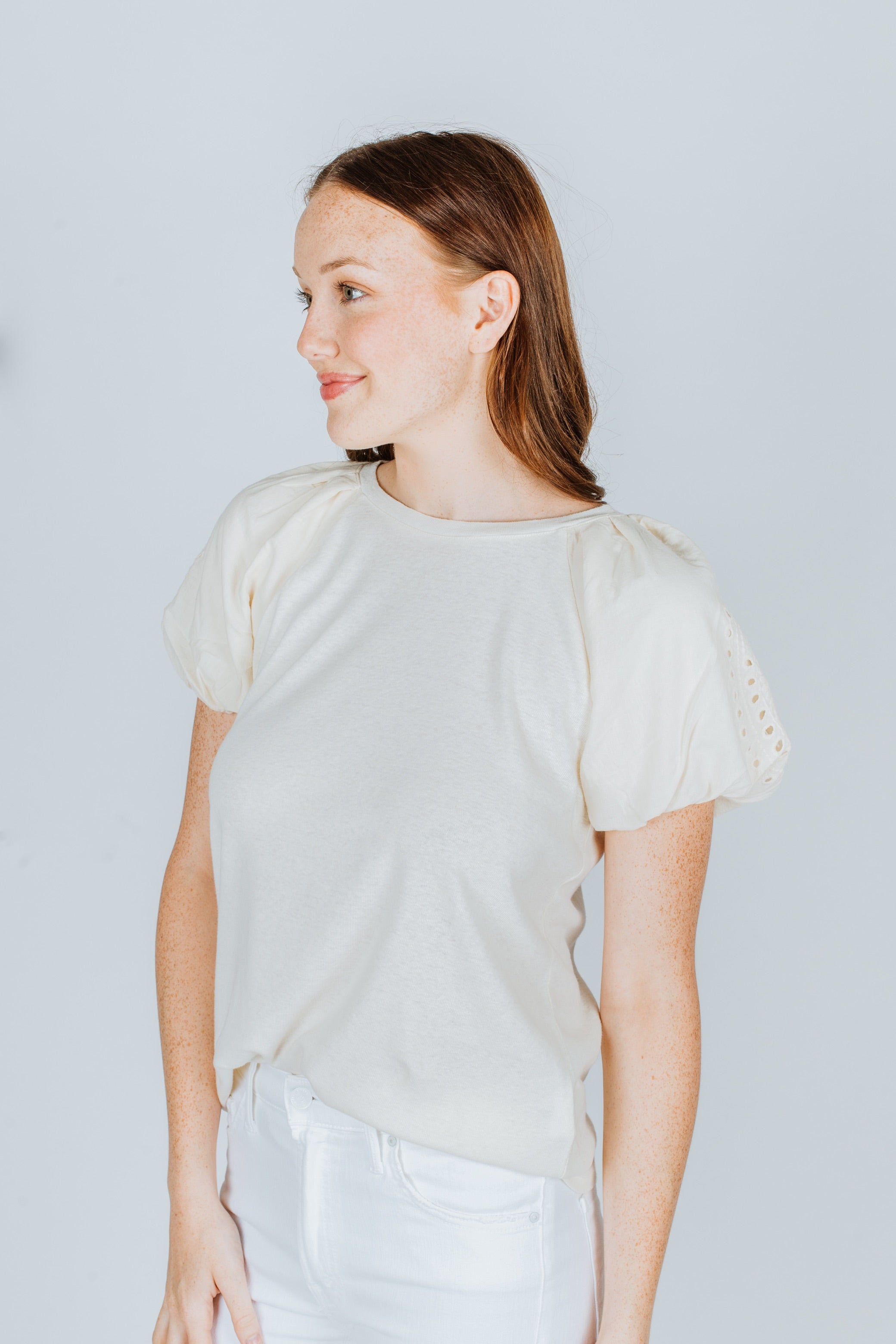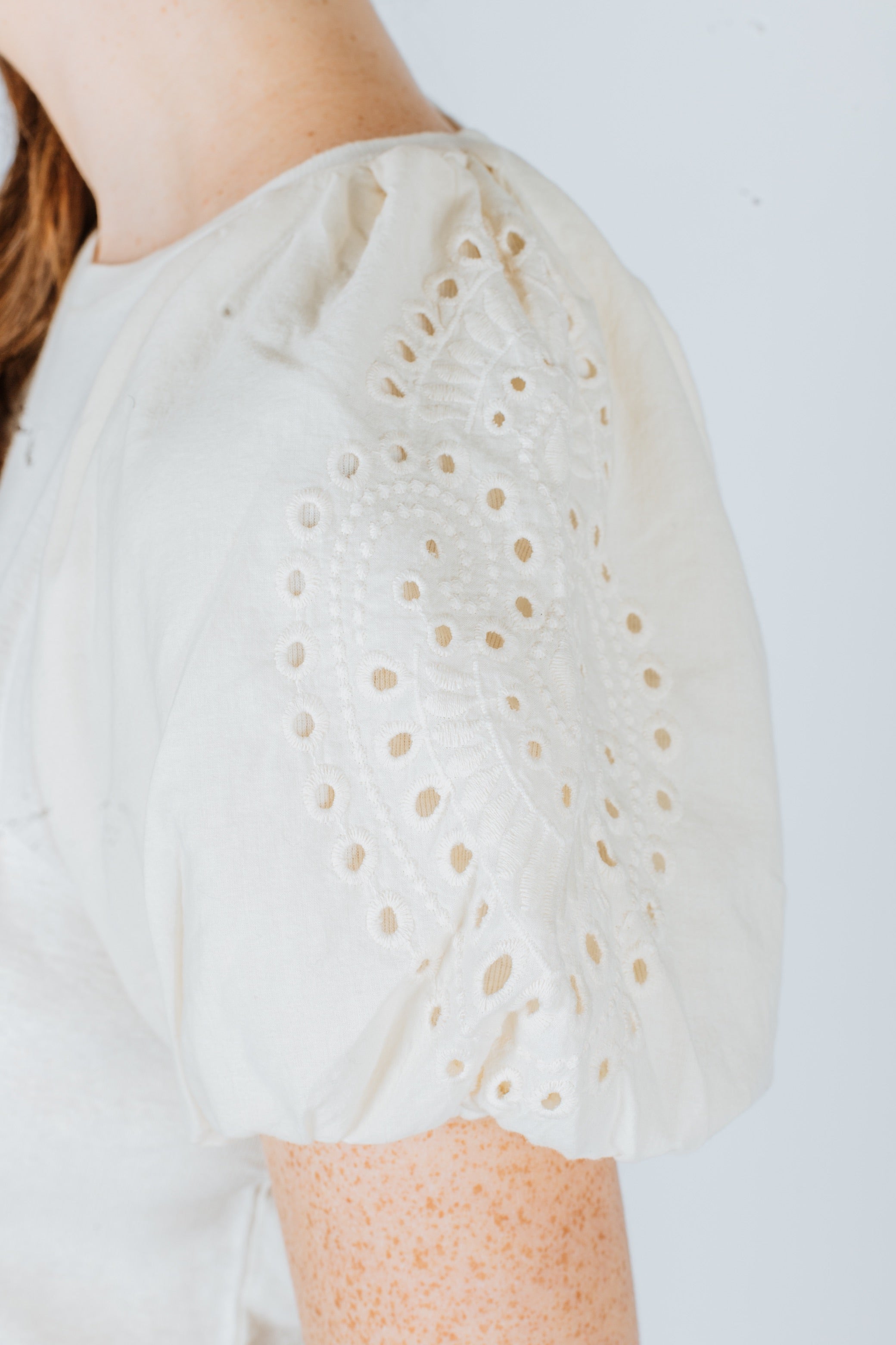 Eyelet detailed puff sleeves elevate a soft linen/cotton blend tee, creating a sweet statement piece for the season. Rounded neckline, straight hem.
