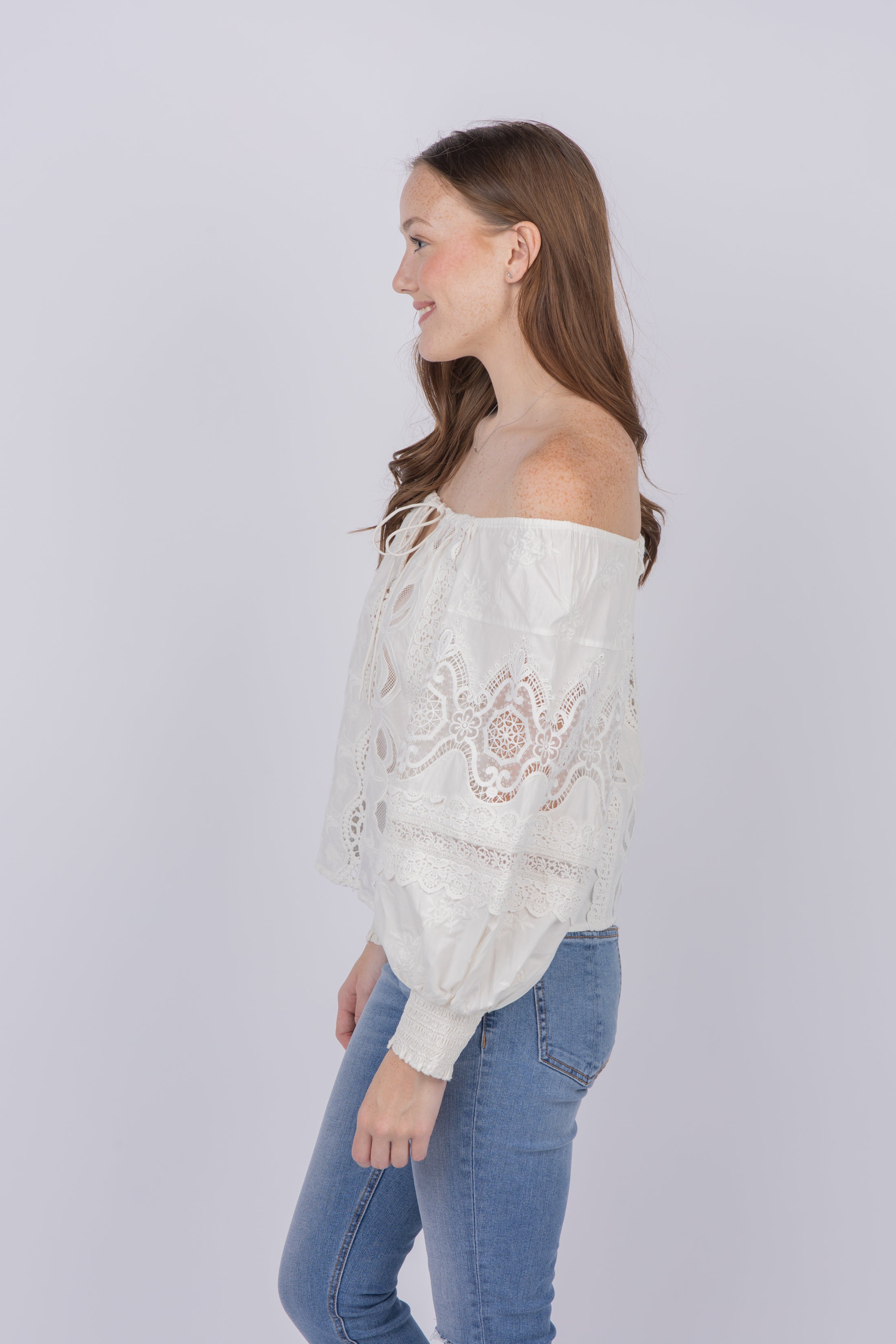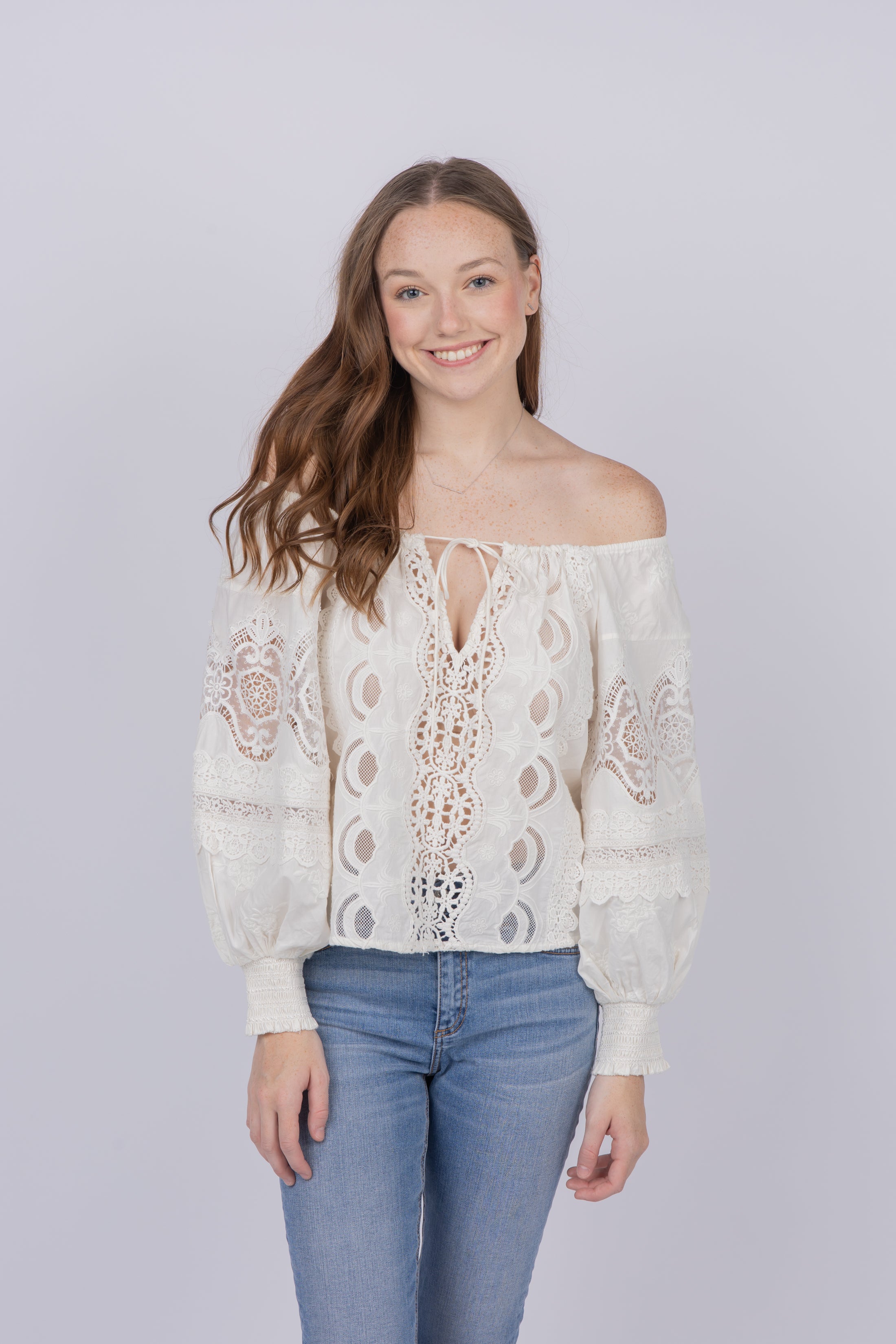 The Alice +amp; Oliva Alta Top Ecru adds a cheerful attitude to your wardrobe! This stylish top features a chic off shoulder neckline and playful details that will make it your go-to. Make any day brighter with this smile-inducing blouse!