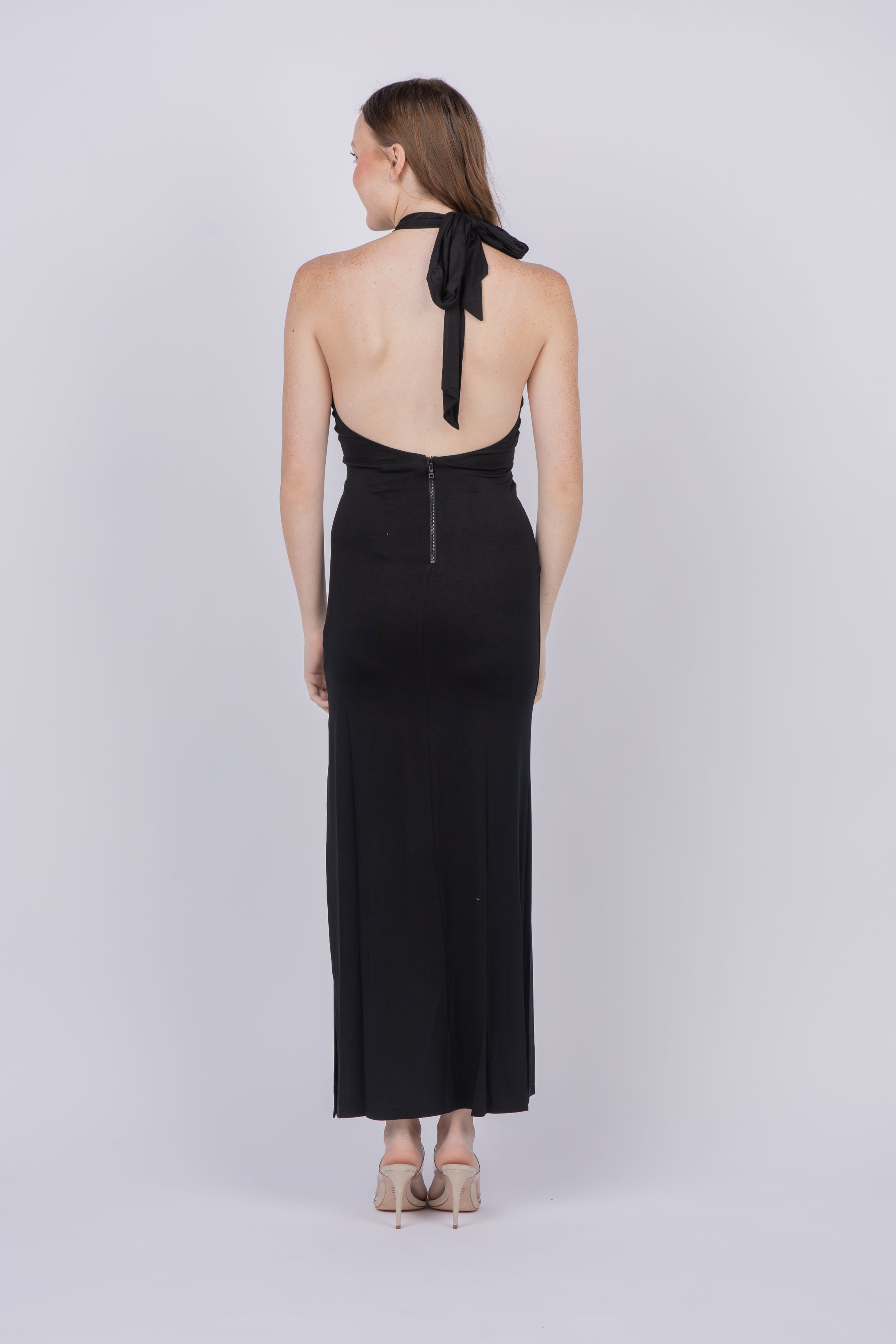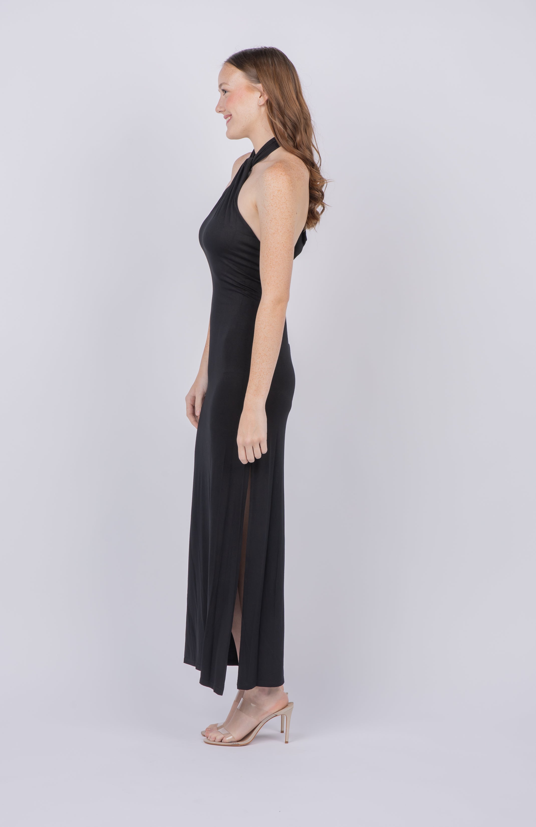 This maxi dress is a stunner with a halter neckline and low back. It's a quintessential maxi but with a twist: That high slit up the side to make it even more stunning. It's made it a slinky viscose that has the perfect amount of stretch.