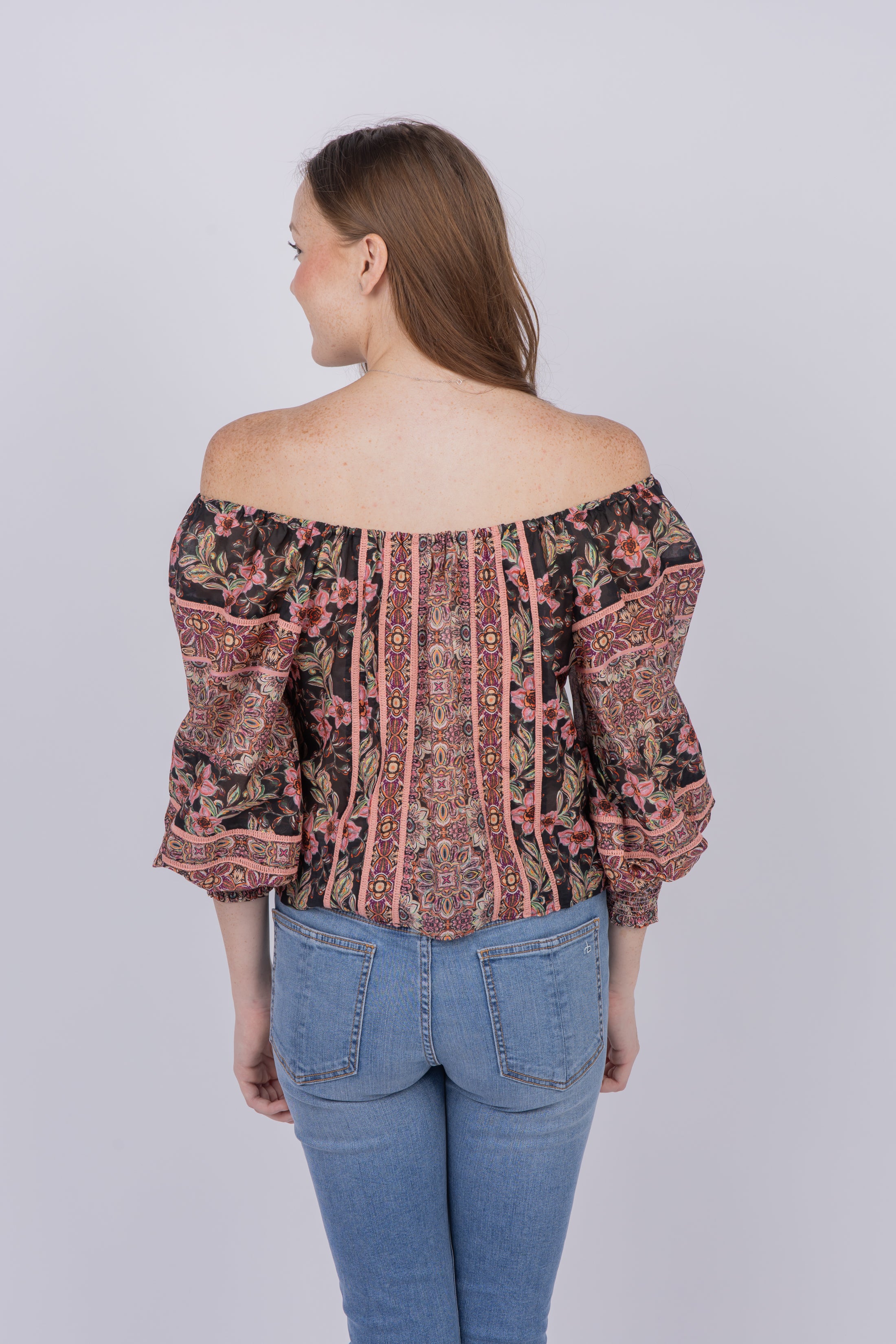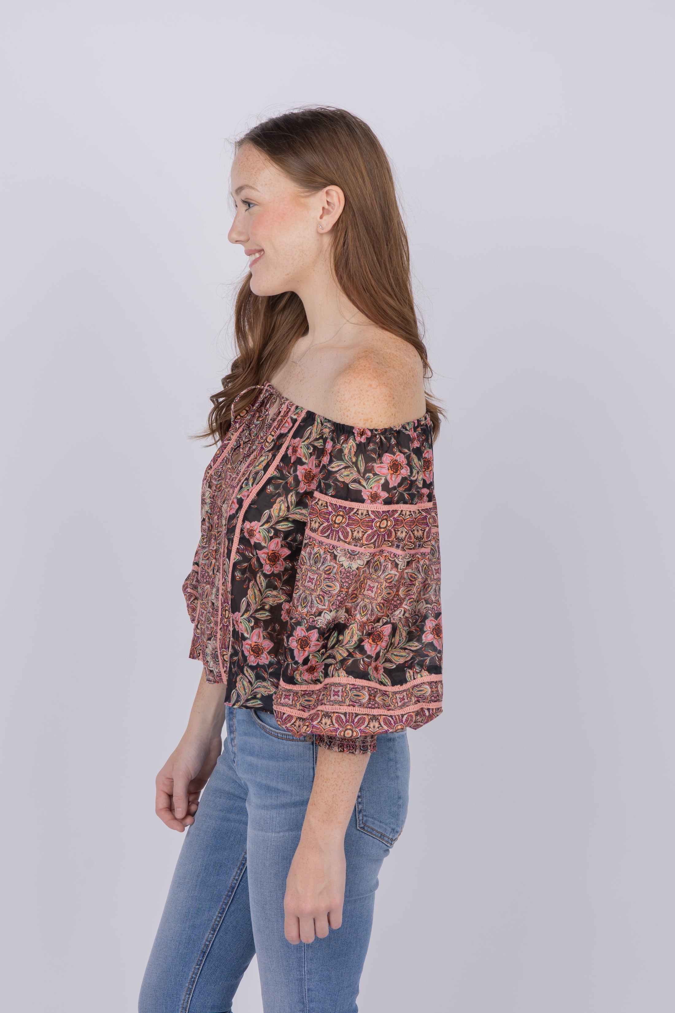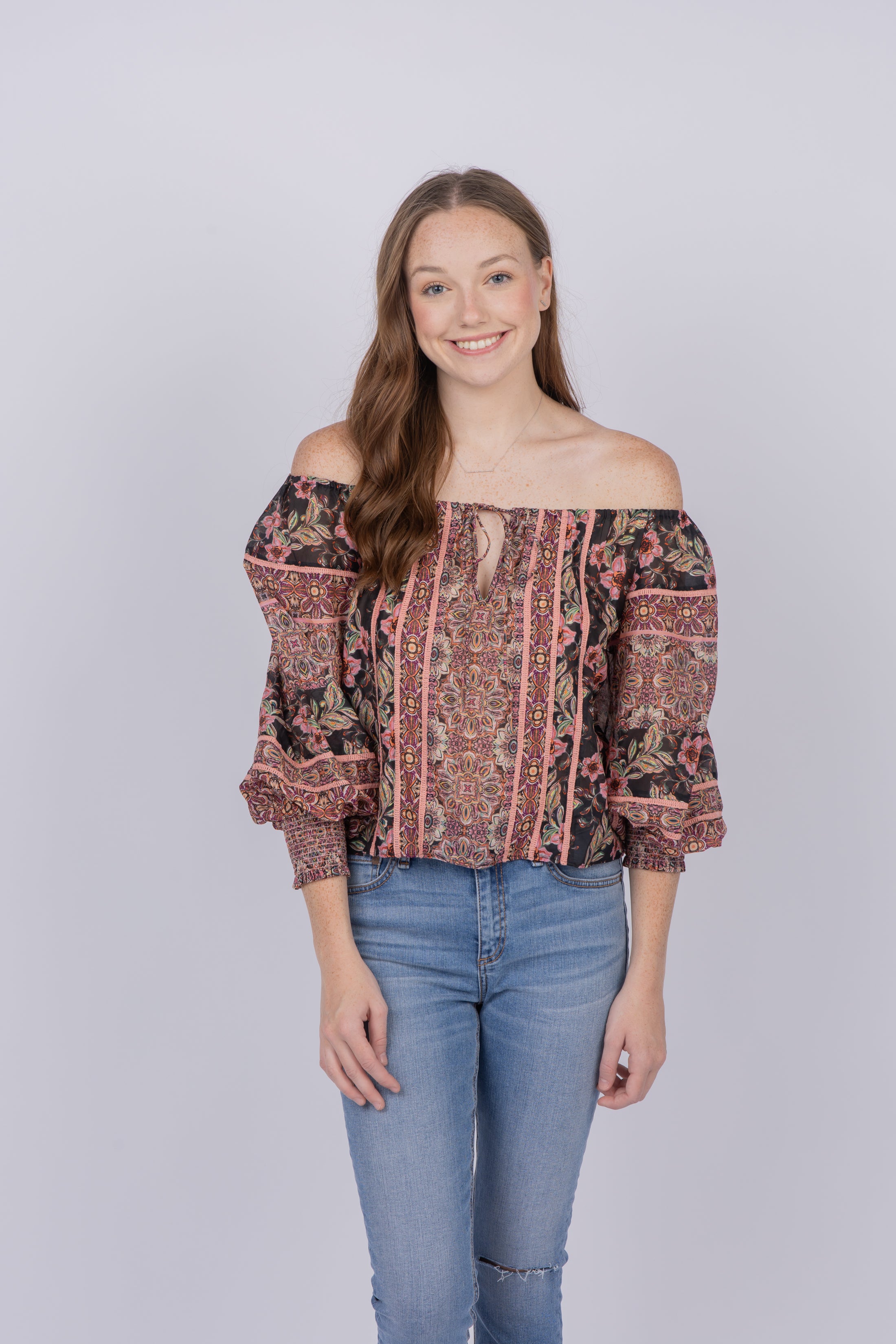 Be beautiful in the Alice + Olivia Alta Top in Canopy Tile. Crafted with an elasticized off-the-shoulder neckline, this pull-on style top is a glamorous pick for any climate. Its three-quarter length blouson sleeves and self-tying cuffs shine with a vibrant tile print, and the lining will keep you feeling breezy all day. Make a statement and stand out in this stunning blouse!