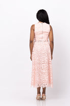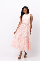 Elevate your style with the Alice + Olivia Babette Midi Dress. This chic and sophisticated dress features an intricate floral lace overlay, adding texture and dimension to your look. With a fitted bodice and high neckline, this dress provides a structured yet feminine silhouette. Perfect for formal occasions and daytime events.