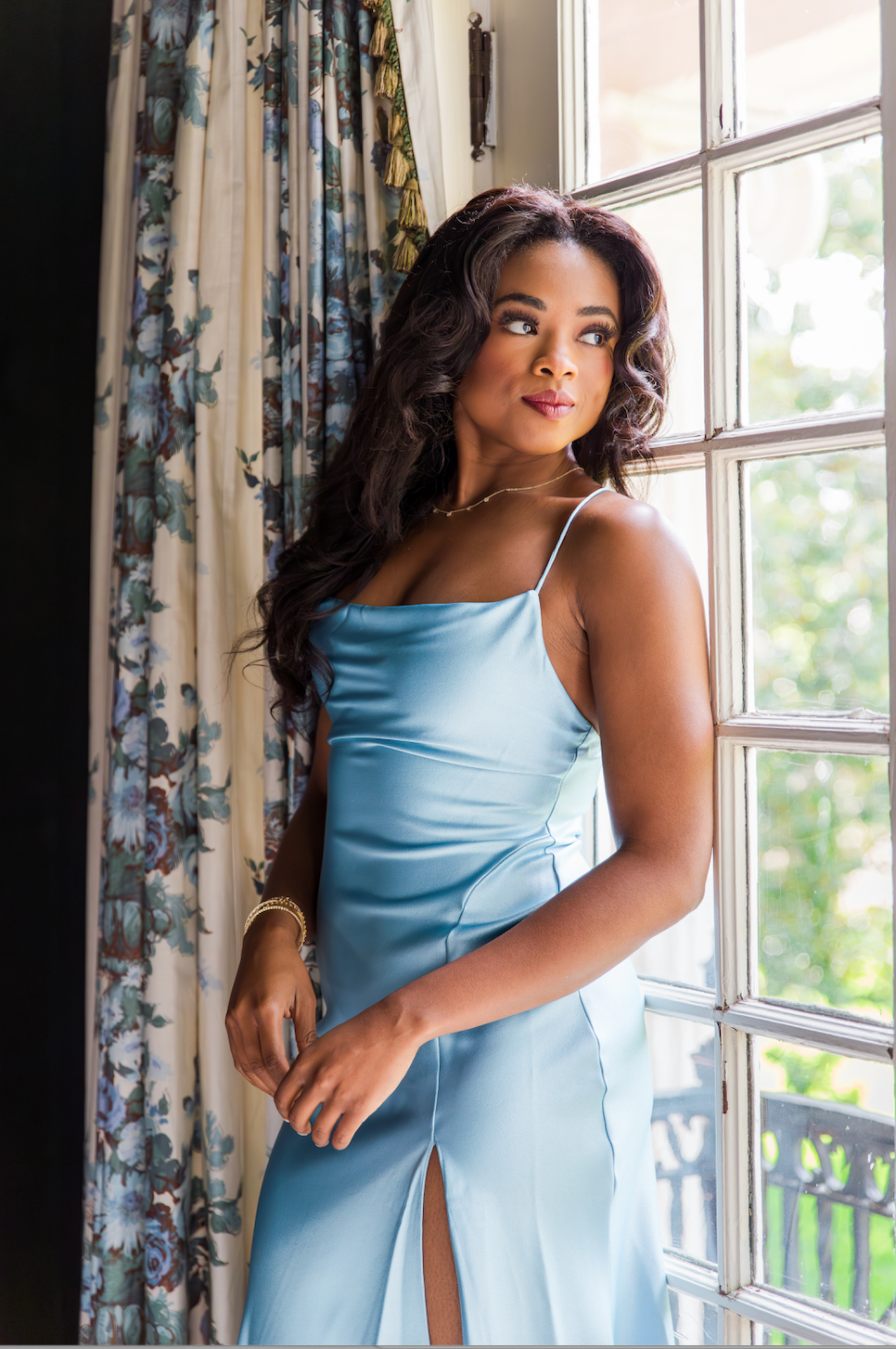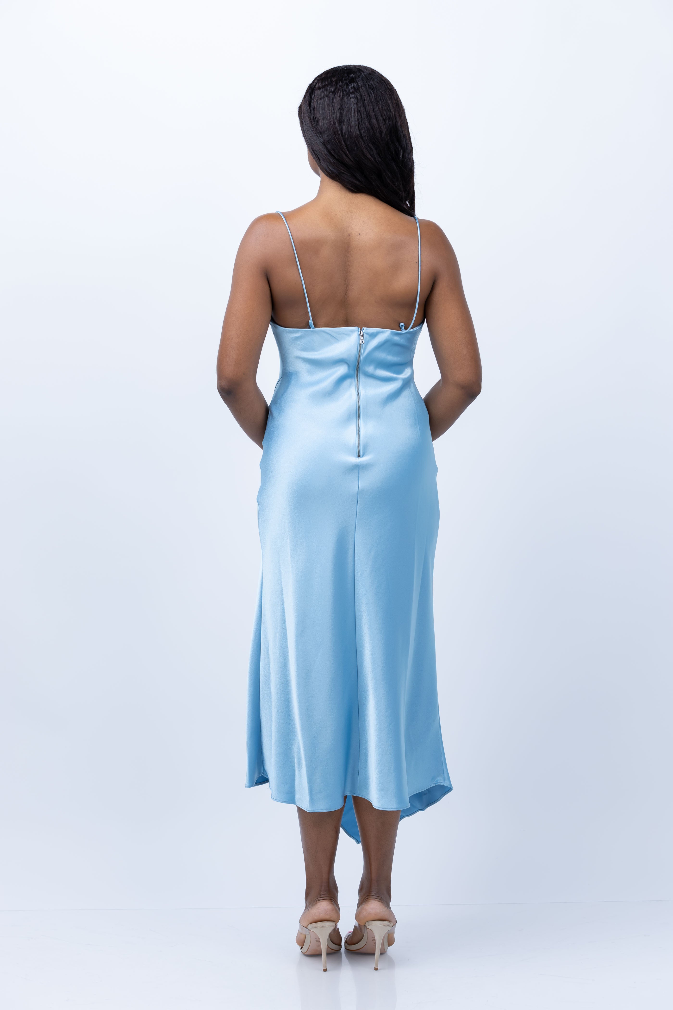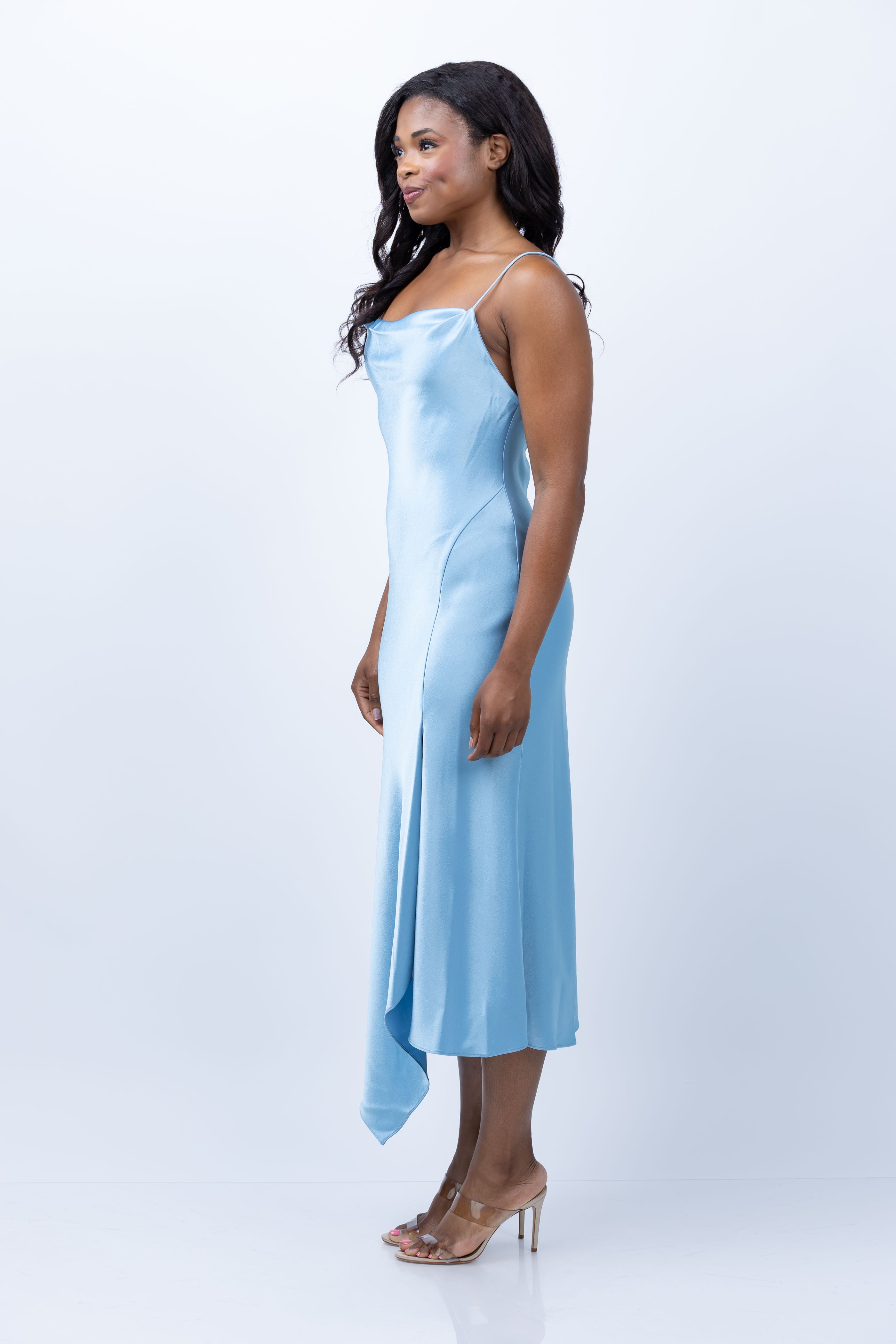 The Alice + Olivia Harmony Dress in Mineral Blue exudes effortless elegance and radiates in luxurious satin. Its cowl neckline and spaghetti straps add a touch of sophistication, while the front slit and asymmetric hem create a modern and alluring silhouette. Perfect for any special occasion.